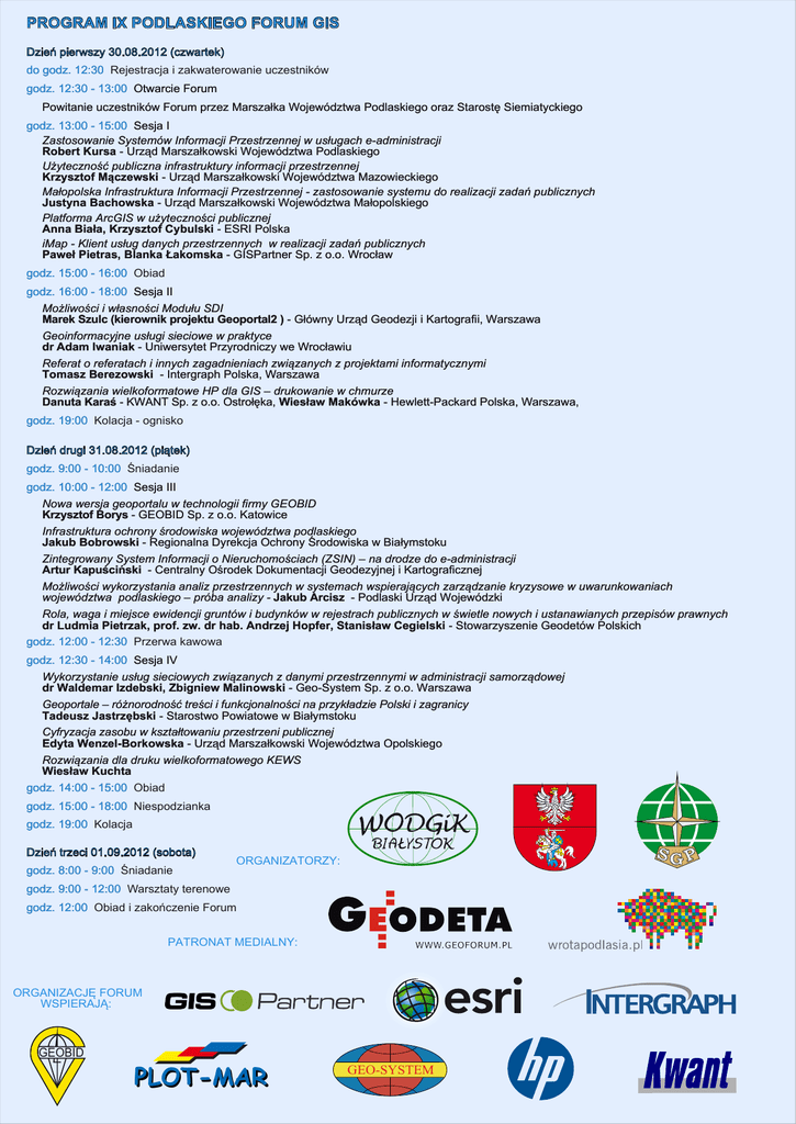 PROGRAM IX PODLASKIEGO FORUM GIS Dzień pierwszy 30.08.2012 (czwartek) do godz. 12:30 Rejestracja i zakwaterowanie uczestników godz. 12:30 - 13:00 Otwarcie Forum Powitanie uczestników Forum przez Marszałka Województwa Podlaskiego oraz Starostę Siemiatyckiego godz. 13:00 - 15:00 Sesja I Zastosowanie Systemów Informacji Przestrzennej w usługach e-administracji Robert Kursa - Urząd Marszałkowski Województwa Podlaskiego Użyteczność publiczna infrastruktury informacji przestrzennej Krzysztof Mączewski - Urząd Marszałkowski Województwa Mazowieckiego Małopolska Infrastruktura Informacji Przestrzennej - zastosowanie systemu do realizacji zadań publicznych Justyna Bachowska - Urząd Marszałkowski Województwa Małopolskiego Platforma ArcGIS w użyteczności publicznej Anna Biała, Krzysztof Cybulski - ESRI Polska iMap - Klient usług danych przestrzennych w realizacji zadań publicznych Paweł Pietras, Blanka Łakomska - GISPartner Sp. z o.o. Wrocław godz. 15:00 - 16:00 Obiad godz. 16:00 - 18:00 Sesja II Możliwości i własności Modułu SDI Marek Szulc (kierownik projektu Geoportal2 ) - Główny Urząd Geodezji i Kartografii, Warszawa Geoinformacyjne usługi sieciowe w praktyce dr Adam Iwaniak - Uniwersytet Przyrodniczy we Wrocławiu Referat o referatach i innych zagadnieniach związanych z projektami informatycznymi Tomasz Berezowski - Intergraph Polska, Warszawa Rozwiązania wielkoformatowe HP dla GIS – drukowanie w chmurze Danuta Karaś - KWANT Sp. z o.o. Ostrołęka, Wiesław Makówka - Hewlett-Packard Polska, Warszawa, godz. 19:00 Kolacja - ognisko Dzień drugi 31.08.2012 (piątek) godz. 9:00 - 10:00 Śniadanie godz. 10:00 - 12:00 Sesja III Nowa wersja geoportalu w technologii firmy GEOBID Krzysztof Borys - GEOBID Sp. z o.o. Katowice Infrastruktura ochrony środowiska województwa podlaskiego Jakub Bobrowski - Regionalna Dyrekcja Ochrony Środowiska w Białymstoku Zintegrowany System Informacji o Nieruchomościach (ZSIN) – na drodze do e-administracji Artur Kapuściński - Centralny Ośrodek Dokumentacji Geodezyjnej i Kartograficznej Możliwości wykorzystania analiz przestrzennych w systemach wspierających zarządzanie kryzysowe w uwarunkowaniach województwa podlaskiego – próba analizy - Jakub Arcisz - Podlaski Urząd Wojewódzki Rola, waga i miejsce ewidencji gruntów i budynków w rejestrach publicznych w świetle nowych i ustanawianych przepisów prawnych dr Ludmia Pietrzak, prof. zw. dr hab. Andrzej Hopfer, Stanisław Cegielski - Stowarzyszenie Geodetów Polskich godz. 12:00 - 12:30 Przerwa kawowa godz. 12:30 - 14:00 Sesja IV Wykorzystanie usług sieciowych związanych z danymi przestrzennymi w administracji samorządowej dr Waldemar Izdebski, Zbigniew Malinowski - Geo-System Sp. z o.o. Warszawa Geoportale – różnorodność treści i funkcjonalności na przykładzie Polski i zagranicy Tadeusz Jastrzębski - Starostwo Powiatowe w Białymstoku Cyfryzacja zasobu w kształtowaniu przestrzeni publicznej Edyta Wenzel-Borkowska - Urząd Marszałkowski Województwa Opolskiego Rozwiązania dla druku wielkoformatowego KEWS Wiesław Kuchta godz. 14:00 - 15:00 Obiad godz. 15:00 - 18:00 Niespodzianka godz. 19:00 Kolacja Dzień trzeci 01.09.2012 (sobota) godz. 8:00 - 9:00 Śniadanie ORGANIZATORZY: godz. 9:00 - 12:00 Warsztaty terenowe godz. 12:00 Obiad i zakończenie Forum PATRONAT MEDIALNY: ORGANIZACJĘ FORUM WSPIERAJĄ: GEOBID PLOT-MAR GEO-SYSTEM