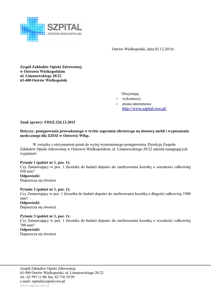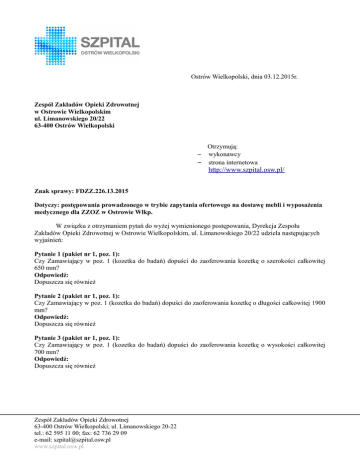 Ostrów Wielkopolski, dnia 03.12.2015r. Zespół Zakładów Opieki Zdrowotnej w Ostrowie Wielkopolskim ul. Limanowskiego 20/22 63-400 Ostrów Wielkopolski Otrzymują: wykonawcy – strona internetowa – http://www.szpital.osw.pl/ Znak sprawy: FDZZ.226.13.2015 Dotyczy: postępowania prowadzonego w trybie zapytania ofertowego na dostawę mebli i wyposażenia medycznego dla ZZOZ w Ostrowie Wlkp. W związku z otrzymaniem pytań do wyżej wymienionego postępowania, Dyrekcja Zespołu Zakładów Opieki Zdrowotnej w Ostrowie Wielkopolskim, ul. Limanowskiego 20/22 udziela następujących wyjaśnień: Pytanie 1 (pakiet nr 1, poz. 1): Czy Zamawiający w poz. 1 (kozetka do badań) dopuści do zaoferowania kozetkę o szerokości całkowitej 650 mm? Odpowiedź: Dopuszcza się również Pytanie 2 (pakiet nr 1, poz. 1): Czy Zamawiający w poz. 1 (kozetka do badań) dopuści do zaoferowania kozetkę o długości całkowitej 1900 mm? Odpowiedź: Dopuszcza się również Pytanie 3 (pakiet nr 1, poz. 1): Czy Zamawiający w poz. 1 (kozetka do badań) dopuści do zaoferowania kozetkę o wysokości całkowitej 700 mm? Odpowiedź: Dopuszcza się również Zespół Zakładów Opieki Zdrowotnej 63-400 Ostrów Wielkopolski; ul. Limanowskiego 20-22 tel.: 62 595 11 00; fax: 62 736 29 09 e-mail: [email protected] www.szpital.osw.pl Pytanie 4 (pakiet nr 1, poz. 5): Czy Zamawiający w poz. 5 (stolik opatrunkowy) dopuści do zaoferowania stolik o długości 865 mm? Odpowiedź: Dopuszcza się również Pytanie 5 (pakiet nr 1, poz. 5): Czy Zamawiający w poz. 5 (stolik opatrunkowy) dopuści do zaoferowania stolik o szerokości 720 mm? Odpowiedź: Dopuszcza się również Pytanie 6: Czy Zamawiający dopuści w zadaniu nr 2 czas realizacji 6 tygodni? Odpowiedź: Zgodnie z zaproszeniem do składania ofert Pytanie 7 (pakiet nr 2): Czy Zamawiający dopuści w zadaniu nr 2 wózek o poniższych parametrach: – szerokość całkowita 700 mm – bez możliwości wyboru koloru konstrukcji stołu – przechył Trendelenburga min. 12° – dopuszczalne obciążenie wózka 170 kg – wnęka (wgłębienie) na ubrania pacjentów? Odpowiedź: Zgodnie z zaproszeniem do składania ofert Pytanie 8 (pakiet nr 1, poz. 1): Czy Zamawiający dopuści w pozycji nr 1 kozetkę medyczną o regulacji zagłówka w zakresie od -60° do +45°? Pozostałe parametry bez zmian. Odpowiedź: Zgodnie z zaproszeniem do składania ofert Pytanie 9 (pakiet nr 1, poz. 2): Czy Zamawiający dopuści w pozycji nr 2 kozetkę do masażu o regulacji zagłówka od 0° do 35°? Pozostałe parametry bez zmian. Odpowiedź: Zgodnie z zaproszeniem do składania ofert Pytanie 10 (pakiet nr 1, poz. 5): Czy Zamawiający w punkcie 5 pozycji nr 2 wskazuje na możliwość regulacji o 30 mm, czy chodzi o regulację w zakresie 530-850 mm? Odpowiedź: Zgodnie z zaproszeniem do składania ofert Zespół Zakładów Opieki Zdrowotnej 63-400 Ostrów Wielkopolski; ul. Limanowskiego 20-22 tel.: 62 595 11 00; fax: 62 736 29 09 e-mail: [email protected] www.szpital.osw.pl Pytanie 11 (pakiet nr 3, poz. 1): Czy Zamawiający wyrazi zgodę na wagę kolumnową z obciążeniem maksymalnym 300 kg, co jest rozwiązaniem znacznie korzystniejszym od wymaganego? Odpowiedź: Dopuszcza się również Pytanie 12 (pakiet nr 3, poz. 1): Czy Zamawiający dopuści wagę kolumnową wyposażoną w funkcję Tara jednak bez automatycznego tarowania? Odpowiedź: Dopuszcza się również Pytanie 13 (pakiet nr 3, poz. 2): Czy Zamawiający wyrazi zgodę na wagę niemowlęcą zasilaną oprócz zasilania sieciowego – bateryjnie (bateria R9)? Rozwiązanie tożsame z wymaganym, nie wpływające na parametry użytkowe wagi. Odpowiedź: Dopuszcza się również Pytanie 14 (pakiet nr 3): Czy Zamawiający wyrazi zgodę na wagę z obciążeniem maksymalnym 20 kg? Rozwiązanie korzystniejsze od wymaganego. Odpowiedź: Zgodnie z zaproszeniem do składania ofert Pytanie 15 (pakiet nr 3, poz. 2): Czy Zamawiający dopuści wagę niemowlęcą wyposażoną w funkcję Tara jednak bez automatycznego tarowania? Odpowiedź: Dopuszcza się również Pytanie 16 (pakiet nr 3, poz. 2): Czy Zamawiający wyrazi zgodę na dokładność odczytu: 5 g < 10 kg < 10 g w wadze niemowlęcej? Rozwiązanie znacznie korzystniejsze od wymaganego. Odpowiedź: Dopuszcza się również Pytanie 17 (pakiet nr 3): Czy Zamawiający zrezygnuje z montażu, uruchomienia i dopuści wysyłkę firmą kurierską? Sprzęt zarówno prosty w obsłudze jak i montażu, dla wykwalifikowanego personelu nie powinien sprawić żadnych problemów. Rezygnacja z tego wymogu pozwoli uniknąć dodatkowych (niepotrzebnych) kosztów, które podwyższą znacznie wartość oferty. Odpowiedź: Nie dopuszcza - zgodnie z zaproszeniem do składania ofert Zespół Zakładów Opieki Zdrowotnej 63-400 Ostrów Wielkopolski; ul. Limanowskiego 20-22 tel.: 62 595 11 00; fax: 62 736 29 09 e-mail: [email protected] www.szpital.osw.pl Pytanie 18 (pakiet nr 1, poz. 7): Czy Zamawiający dopuści wózek wg opisu i szkicu: Wymiary: 1000 x 490 x 1100 mm (długość/szerokość/wysokość) Wykonanie: - stabilna rama: rurka ze stali nierdzewnej o średnicy 22 mm, solidnie spawana, - korpus i półki z płyty meblowej o grubości 19 mm pokrytej melaminą, kolor jasnoszary (U112PE), - krawędzie zabezpieczone tworzywem o grubości 2 mm, klejone klejem poliuretanowym dla zapewnienia wysokiej wytrzymałości i odporności na temperaturę, wilgoć i środki chemiczne Szafka z 1 półką (2 komory) i pojedynczami drzwiami Blat z rylingami z 3 stron, wymiary blatu: 364 x 580 mm Z tyłu szafki uchwyt na 1 worek, wyposażony w pokrywę z zawiasem podnoszoną ręcznie 4 kółka Ø 125 mm, ze zderzakami, 2 z blokadą Oponki nie brudzące Odpowiedź: Nie dopuszcza – zgodnie z zaproszeniem do składania ofert Pytanie 19 (pakiet nr 1, poz. 7): Czy Zamawiający dopuści wózek wg opisu i zdjęcia: Wymiary: 995 x 600 x 1090 mm (długość/szerokość/wysokość) Wykonanie: - stabilna rama: rurka ze stali nierdzewnej