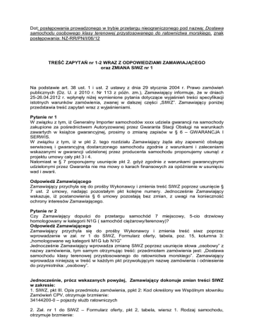 Dot: post powania prowadzonego w trybie przetargu nieograniczonego pod nazw : Dostawa samochodu osobowego klasy terenowej przystosowanego do ratownictwa morskiego, znak post powania: NZ-RR/PN/I/06/12 TRE ZAPYTA nr 1-2 WRAZ Z ODPOWIEDZIAMI ZAMAWIAJ CEGO oraz ZMIANA SIWZ nr 1 Na podstawie art. 38 ust. 1 i ust. 2 ustawy z dnia 29 stycznia 2004 r. Prawo zamówie publicznych (Dz. U. z 2010 r. Nr 113 z pó n. zm.), Zamawiaj cy informuje, e w dniach 25-26.04.2012 r. wp yn y ni ej wymienione pytania dotycz ce wyja nie tre ci specyfikacji istotnych warunków zamówienia, zwanej w dalszej cz ci „SIWZ”. Zamawiaj cy poni ej przedstawia tre zapyta wraz z wyja nieniami. Pytanie nr 1 W zwi zku z tym, i Generalny Importer samochodów xxxx udziela gwarancji na samochody zakupione za po rednictwem Autoryzowanej przez Gwaranta Stacji Obs ugi na warunkach zawartych w ksi ce gwarancyjnej, prosimy o zmian zapisów w § 6 – GWARANCJA I SERWIS. W zwi zku z tym, i w pkt 2. tego rozdzia u Zamawiaj cy da aby zapewni obs ug serwisow i gwarancyjn dostarczonego samochodu zgodnie z warunkami i zaleceniami wskazanymi w gwarancji udzielonej przez producenta samochodu proponujemy usun z projektu umowy ca y pkt 3 i 4. Natomiast w § 7 proponujemy usuni cie pkt 2. gdy zgodnie z warunkami gwarancyjnymi udzielonymi przez Gwaranta nie ma mowy o karach finansowych za opó nienie w usuni ciu wad i awarii. Odpowied Zamawiaj cego Zamawiaj cy przychyla si do pro by Wykonawcy i zmienia tre SIWZ poprzez usuni cie § 7 ust. 2 umowy, nadaj c pozosta ym pkt kolejne numery. Jednocze nie Zamawiaj cy wskazuje, i postanowienia § 6 umowy pozostaj bez zmian, z uwagi na konieczno ochrony interesów Zamawiaj cego. Pytanie nr 2 Czy Zamawiaj cy dopu ci do przetargu samochód 7 miejscowy, 5-cio drzwiowy homologowany w kategorii N1G ( samochód ci arowy/terenowy)? Odpowied Zamawiaj cego Zamawiaj cy przychyla si do pro by Wykonawcy i zmienia tre siwz poprzez wprowadzenie w za . nr 1 do SIWZ, Formularz oferty, tabela, poz. 15, kolumna 3: „homologowane wg kategorii M1G lub N1G” Jednocze nie Zamawiaj cy wprowadza zmian SIWZ poprzez usuni cie s owa „osobowy” z nazwy zamówienia, tym samym otrzymuj c tre : przedmiotem zamówienia jest: „Dostawa samochodu klasy terenowej przystosowanego do ratownictwa morskiego”. Zamawiaj cy wprowadza niniejsz w tre w ka dym pkt przywo uj cym nazw zamówienia i odniesienie do przymiotnika: „osobowy”. Jednocze nie, prócz wskazanych powy ej, Zamawiaj cy dokonuje zmian tre ci SIWZ w zakresie: 1. SIWZ, pkt III. Opis przedmiotu zamówienia, ppkt 2: Kod okre lony we Wspólnym s owniku Zamówie CPV, otrzymuje brzmienie: 34144200-0 – pojazdy s b ratowniczych 2. Za . nr 1 do SIWZ – Formularz oferty, pkt 2, tabela, wiersz 1. Rodzaj samochodu, otrzymuje brzmienie: 1. Rodzaj pojazdu Osobowy lub do przewozu adunków 3. SIWZ, Wzór umowy, par. 6 pkt 1, terminy udzielonej gwarancji: Skre la si ilo miesi cy udzielonej gwarancji w ka dym z ppkt 1 – 3. (Zamawiaj cy w miejscu tym zastrzega, i W Formularzu Oferty stanowi cym jednocze nie opis przedmiotu zamówienia, wskazano minimalny okres, na jaki gwarancja winna by udzielona, jednocze nie umo liwiaj c Wykonawca zaoferowanie gwarancji na d szy okres). Powy sze odpowiedzi na pytania oraz zmiana SIWZ nr 1 r. s Wykonawców. Informujemy, i termin sk adania i otwarcia ofert ulega przesuni ciu. Termin sk adania ofert up ywa w dniu 18.05.2012r. o godz. 9.45. Otwarcie ofert nast pi w dniu18.05.2012r. o godz. 10.00. wi ce dla Jednocze nie Zamawiaj cy informuje, i zamie ci na stronie internetowej ujednolicon , edytowaln tre SIWZ oraz wype niaj c dyspozycj ustawy Pzp, og oszenie o zmianie tre ci og oszenia. Dyrektor Marek D ugosz Gdynia, dn. 02.05.2012r