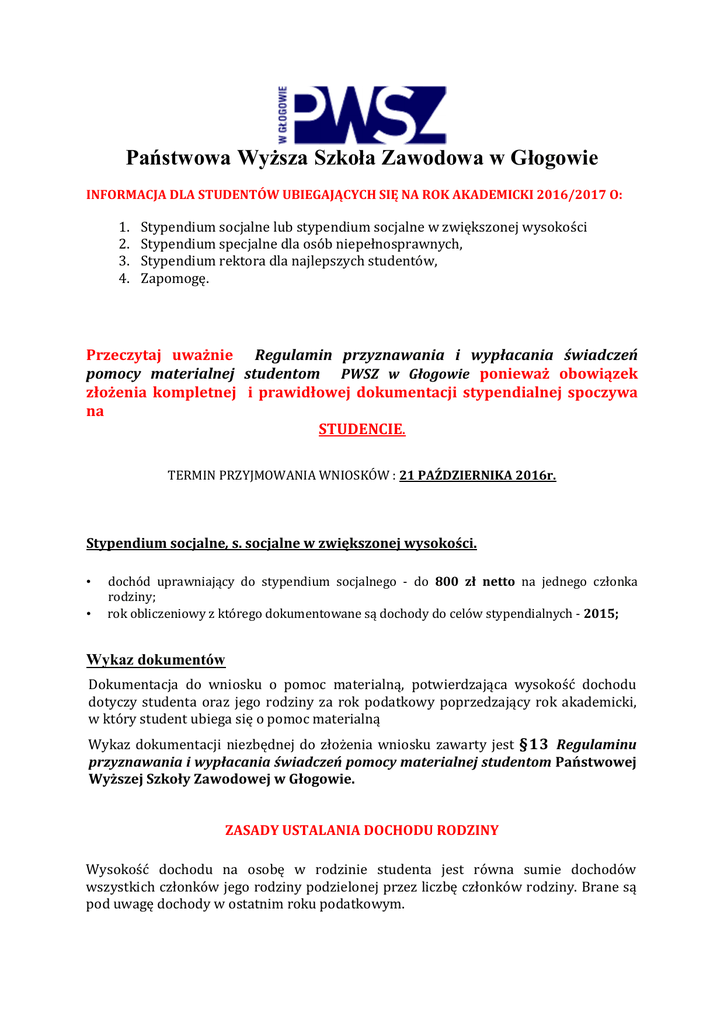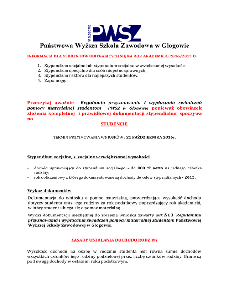 Państwowa Wyższa Szkoła Zawodowa w Głogowie INFORMACJA DLA STUDENTÓW UBIEGAJĄCYCH SIĘ NA ROK AKADEMICKI 2016/2017 O: 1. 2. 3. 4. Stypendium socjalne lub stypendium socjalne w zwiększonej wysokości Stypendium specjalne dla osób niepełnosprawnych, Stypendium rektora dla najlepszych studentów, Zapomogę. Przeczytaj uważnie Regulamin przyznawania i wypłacania świadczeń pomocy materialnej studentom PWSZ w Głogowie ponieważ obowiązek złożenia kompletnej i prawidłowej dokumentacji stypendialnej spoczywa na STUDENCIE. TERMIN PRZYJMOWANIA WNIOSKÓW : 21 PAŹDZIERNIKA 2016r. Stypendium socjalne, s. socjalne w zwiększonej wysokości. • • dochód uprawniający do stypendium socjalnego - do 800 zł netto na jednego członka rodziny; rok obliczeniowy z którego dokumentowane są dochody do celów stypendialnych - 2015; Wykaz dokumentów Dokumentacja do wniosku o pomoc materialną, potwierdzająca wysokość dochodu dotyczy studenta oraz jego rodziny za rok podatkowy poprzedzający rok akademicki, w który student ubiega się o pomoc materialną Wykaz dokumentacji niezbędnej do złożenia wniosku zawarty jest §13 Regulaminu przyznawania i wypłacania świadczeń pomocy materialnej studentom Państwowej Wyższej Szkoły Zawodowej w Głogowie. ZASADY USTALANIA DOCHODU RODZINY Wysokość dochodu na osobę w rodzinie studenta jest równa sumie dochodów wszystkich członków jego rodziny podzielonej przez liczbę członków rodziny. Brane są pod uwagę dochody w ostatnim roku podatkowym. 1.Przy ustalaniu wysokości dochodu uprawniającego studenta do ubiegania się o stypendium uwzględnia się dochody uzyskane przez: 1) studenta; 2) małżonka studenta, a także będące na utrzymaniu studenta lub jego małżonka dzieci niepełnoletnie, dzieci pobierające naukę do 26. roku życia, a jeżeli 26. rok życia przypada w ostatnim roku studiów, do ich ukończenia, oraz dzieci niepełnosprawne bez względu na wiek; 3) rodziców, opiekunów prawnych lub faktycznych studenta i będące na ich utrzymaniu dzieci niepełnoletnie, dzieci pobierające naukę do 26. roku życia, a jeżeli 26. rok życia przypada w ostatnim roku studiów, do ich ukończenia, oraz dzieci niepełnosprawne bez względu na wiek. 2. Student może również ubiegać się o stypendium socjalne bez wykazywania dochodów osiąganych przez osoby wymienione w punkcie 1 w przypadku gdy: 1) nie prowadzi wspólnego gospodarstwa domowego z żadnym z rodziców i potwierdził ten fakt w złożonym oświadczeniu oraz spełnia jedną z następujących przesłanek: a) ukończył 26 rok życia, b) pozostaje w związku małżeńskim, c) ma na utrzymaniu dzieci, o których mowa w ust. 5 pkt 2, lub 2) jeżeli spełnia łącznie następujące warunki: a) posiadał stałe źródło dochodów w ostatnim roku podatkowym, b) posiadał stałe źródło dochodów w roku bieżącym, c) jego miesięczny dochód w okresach, o których mowa w lit. a i b, jest wyższy lub równy 1,15 sumy kwoty określonej w art. 5 ust.1 i kwoty określonej w art. 6 ust. 2 pkt 3 ustawy z dnia 28 listopada 2003 r. o świadczeniach rodzinnych, d) nie prowadzi wspólnego gospodarstwa domowego z żadnym z rodziców i potwierdził ten fakt w złożonym oświadczeniu. Wysokość dochodu osiąganego przez każdego członka rodziny studenta ustala się na podstawie złożonego rocznego zeznania podatkowego, z zaświadczeń wystawionych przez urząd skarbowy, z zaświadczeń z innych instytucji (np. dotyczących ilości hektarów przeliczeniowych w gospodarstwach rolnych). Student zobowiązany jest dołączyć do wniosku o stypendium zaświadczenia z Urzędu Skarbowego dla każdego dorosłego członka rodziny a w przypadku osiągniętego dochodu również z Zakładu Ubezpieczeń Społecznych o wysokości składki zdrowotnej za 2015rok Dochód – przychody podlegające opodatkowaniu na zasadach określonych w art. 27, 30b, 30c i 30e ustawy z dnia 26 lipca 1991 r. o podatku dochodowym od osób fizycznych (Dz. U. z 2012 r. poz. 361, z późn. zm.), pomniejszone o koszty uzyskania przychodu, należy podatek dochodowy od osób fizycznych, składki na ubezpieczenia społeczne niezaliczone do kosztów uzyskania przychodu oraz składki na ubezpieczenie zdrowotne. Szczegółowy opis dochodu, zawarty jest §10 i §11 Regulaminu przyznawania i wypłacania świadczeń pomocy materialnej studentom PWSZ w Głogowie Stypendium specjalne dla osób niepełnosprawnych Stypendium specjalne dla osób niepełnosprawnych może otrzymywać student z tytułu niepełnosprawności potwierdzonej aktualnym orzeczeniem o stopniu niepełnosprawności wydanym przez właściwy organ. Stypendium specjalne dla osób niepełnosprawnych przyznawane jest na okres nie dłuższy niż wynikający z orzeczenia stopnia niepełnosprawności. Student składa wniosek ( Załącznik nr 2 do Regulaminu) wraz z kopią aktualnego orzeczeniu o stopniu niepełnosprawności (oryginał do wglądu). Stypendium specjalne dla osób niepełnosprawnych przyznawane jest na rok akademicki, ale na czas nie dłuższy niż do okresu ważności orzeczenia o stopniu niepełnosprawności. Stypendium rektora dla najlepszych studentów Stypendium rektora dla najlepszych studentów może otrzymać student, który uzyskał za rok studiów wysoką średnią ocen i/lub posiada osiągnięcia naukowe, artystyczne i/lub wysokie wyniki sportowe we współzawodnictwie międzynarodowym lub krajowym. Stypendium może być przyznane nie wcześniej niż po zaliczeniu pierwszego roku studiów. Lista rankingowa najlepszych studentów danego kierunku studiów sporządzona zostanie na podstawie uzyskanej przez studenta sumy punktów, liczonej według zasady: Ilość punktów Osiągniecie: Kryteria: średnia ocen x 10 pkt. 1 max 50 pkt Średnia ocen 15pkt zgłoszony przez studenta, będący jego autorstwa: wynalazek, wzór użytkowy, znak zastrzeżony, 10pkt publikacja naukowa w książce lub czasopiśmie recenzowanym 10pkt aktywny udział studenta (