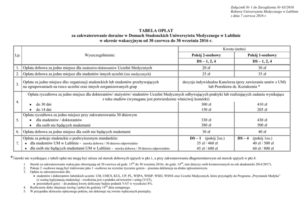 Załącznik Nr 1 do Zarządzenia Nr 63/2016 Rektora Uniwersytetu Medycznego w Lublinie z dnia 7 czerwca 2016 r. TABELA OPŁAT za zakwaterowanie doraźne w Domach Studenckich Uniwersytetu Medycznego w Lublinie w okresie wakacyjnym od 30 czerwca do 30 września 2016 r. Kwota (netto) Wyszczególnienie: Lp. 1. Opłata dobowa za jedno miejsce dla studentów/doktorantów Uczelni Medycznych 2. Opłata dobowa za jedno miejsce dla studentów innych uczelni (nie medycznych) 3. Opłata za jedno miejsce dla: organizacji studenckich lub studentów przebywających na zgrupowaniach na rzecz uczelni oraz innych zorganizowanych grup Pokój 2-osobowy Pokój 1-osobowy DS – 1, 2, 4 DS – 1, 2, 4 20 zł 25 zł 30 zł 35 zł decyzja indywidualna Kanclerza (przy zawieraniu umów z UM) lub Prorektora ds. Kształcenia * Opłata ryczałtowa za jedno miejsce dla doktorantów/ stażystów/ studentów Uczelni Medycznych odbywających praktyki lub realizujących zadania wynikające z toku studiów (wymagane jest potwierdzenie właściwej komórki) 4. 300 zł 410 zł do 30 dni 150 zł 205 zł do 14 dni Opłata ryczałtowa za jedno miejsce przy zakwaterowaniu 30 dniowym 330 zł 430 zł dla studentów / doktorantów 5. 380 zł 500 zł dla osób nie będących studentami 6. Opłata dobowa za jedno miejsce dla osób nie będących studentami 7. Opłata za pokoje studenckie o podwyższonym standardzie: dla studentów UM w Lublinie - stawka dobowa / 30 dniowa odpowiednio dla osób nie będących studentami UM w Lublinie - stawka dobowa / 30 dniowa odpowiednio 30 zł DS – 1 (pokój 2os.) 35 zł / 460 zł 45 zł / 600 zł 40 zł DS – 4 (pokój 1os.) 40 zł / 500 zł 60 zł / 800 zł */stawki nie wynikające z tabeli opłat nie mogą być niższe od stawek dobowych ujętych w pkt.1, a przy zakwaterowaniu długoterminowym od stawek ujętych w pkt.4. 1. 2. 3. 4. 5. Stawki za zakwaterowanie wakacyjne obowiązują od 30 czerwca od godz. 1500 do 30 września 2016r. do godz. 1400, (nie dotyczy osób kwaterowanych na rok akademicki 2016/2017). Pokoje 2 -osobowe mogą być traktowane jako 1 -osobowe na wyraźne życzenie gościa – pisemna deklaracja na druku zgłoszeniowym. Opłata za zakwaterowanie dla: studentów i doktorantów lubelskich uczelni: UM, UMCS, KUL, UP, PL, WSPA, WSSP, WSEI, WSNS oraz Uczelni Medycznych, które przystąpiły do Programu „Przystanek Medyka” (z ważną legitymacją studencką) - zwolniona jest z podatku od towarów i usług (VAT), pozostałych gości – do podanej kwoty doliczany będzie podatek VAT w wysokości 8%. Rozliczenie doby obejmuje nocleg i pobyt do godziny 14 00 dnia następnego. W przypadku skrócenia opłaconego pobytu, nie dokonuje się zwrotu wpłaconych pieniędzy.