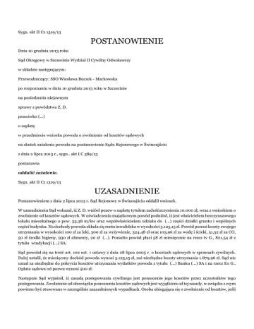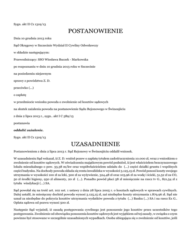 Sygn. akt II Cz 1319/13 POSTANOWIENIE Dnia 10 grudnia 2013 roku Sąd Okręgowy w Szczecinie Wydział II Cywilny Odwoławczy w składzie następującym: Przewodniczący: SSO Wiesława Buczek - Markowska po rozpoznaniu w dniu 10 grudnia 2013 roku w Szczecinie na posiedzeniu niejawnym sprawy z powództwa Z. D. przeciwko (...) o zapłatę w przedmiocie wniosku powoda o zwolnienie od kosztów sądowych na skutek zażalenia powoda na postanowienie Sądu Rejonowego w Świnoujściu z dnia 2 lipca 2013 r., sygn.. akt I C 589/13 postanawia oddalić zażalenie. Sygn. akt II Cz 1319/13 UZASADNIENIE Postanowieniem z dnia 2 lipca 2013 r. Sąd Rejonowy w Świnoujściu oddalił wniosek. W uzasadnieniu Sąd wskazał, iż Z. D. wniósł pozew o zapłatę tytułem zadośćuczynienia 10.000 zł, wraz z wnioskiem o zwolnienie od kosztów sądowych. W oświadczeniu majątkowym powód podniósł, iż jest właścicielem bezczynszowego lokalu mieszkalnego o pow. 33,38 m/kw oraz współwłaścicielem udziału do (...) części działki gruntu i wspólnych części budynku. Na dochody powoda składa się renta inwalidzka w wysokości 3.125,15 zł. Powód ponosi koszty swojego utrzymania w wysokości 100 zł za leki, 300 zł za wyżywienie, 324,48 zł oraz 103,96 zł za wodę i ścieki, 51,52 zł za CO, 50 zł środki higieny, 930 zł alimenty, 20 zł (...). Ponadto powód płaci 58 zł miesięcznie na rzecz tv G., 821,54 zł z tytułu windykacji (...) SA. Sąd powołał się na treść art. 102 ust. 1 ustawy z dnia 28 lipca 2005 r. o kosztach sądowych w sprawach cywilnych. Dalej ustalił, że miesięczny dochód powoda wynosi 3.125,15 zł, zaś niezbędne koszty utrzymania 1.879,96 zł. Sąd nie uznał za niezbędne do pokrycia kosztów utrzymania wydatków powoda z tytułu (...) Banku (...) SA i na rzecz Ex G.. Opłata sądowa od pozwu wynosi 500 zł. Następnie Sąd wyjaśnił, iż zasadą postępowania cywilnego jest ponoszenie jego kosztów przez uczestników tego postępowania. Zwolnienie od obowiązku ponoszenia kosztów sądowych jest wyjątkiem od tej zasady, w związku z czym powinno być stosowane w szczególnie uzasadnionych wypadkach. Osoba ubiegająca się o zwolnienie od kosztów, jeśli nie posiada w danej chwili wystarczających środków powinna poczynić oszczędności we własnych wydatkach i dążyć do zgromadzenia ich przed wszczęciem postępowania. Wnioskodawca będąc właścicielem lokalu o powierzchni użytkowej 33,38 m2 ma nie tylko zapewnione warunki mieszkaniowe, ale również możliwości zorganizowania potrzebnych środków pieniężnych np. przez zaciągnięcie pożyczki hipotecznej. Zgodnie ze stanowiskiem Sądu Najwyższego fakt, że posiadany majątek, zwłaszcza nieruchomy nie dostarcza dochodu lub dochód ten jest bardzo szczupły, nie uzasadnia wniosku o zwolnienie od kosztów sadowych. Posiadanie majątku zatem, szczególnie nieruchomości w zasadzie wyłącza możliwość przyznania zwolnienia od kosztów sądowych (orz. SN z 23.10.1934, CII (...)). Ponadto po uregulowaniu koniecznych kosztów utrzymania oraz zakupie niezbędnych leków powodowi pozostaje kwota 1.245,19 zł, która na obecnym etapie postępowania umożliwia przeznaczenie 500 zł na pokrycie opłaty sądowej od pozwu. Sąd nie brał pod uwagę faktu, iż powód z tytułu zaciągniętych kredytów jest zobowiązany do spłaty miesięcznych rat w wysokości 879,54 zł na rzecz wierzycieli, gdyż powód nie wykazał, czy zobowiązania te miały jedynie charakter konsumpcyjnych czy też zostały zaciągnięte w celu chociażby poratowania zdrowia, co świadczyłoby o konieczności ich poniesienia. Okoliczność, iż dłużnik zaciąga zobowiązanie ponad swoje możliwości finansowe nie może, zdaniem Sądu obciążać Skarbu Państwa, a następnie pośrednio podatników. Zobowiązania z tytułu opłat sądowych mają taką samą wagę, jak zobowiązania z tytułu zaciągniętych kredytów, czy też wynikające z konieczności utrzymania. Sąd zatem nie widział podstaw, ażeby inne zobowiązania miałyby być traktowane priorytetowo. Z uwagi na powyższe Sąd nie znalazł podstaw do zwolnienia Z. D. od kosztów sądowych w sprawie. Powód zaskarżył powyższe postanowienie, zarzucając błąd w ustaleniach faktycznych przyjętych za podstawę rozstrzygnięcia. Skarżący podniósł, iż obowiązek ponoszenia kosztów sądowych, jak i zabezpieczenia n nie środków nie ma charakteru absolutnego, a powód znajduje się przejściowo w gorszej sytuacji materialnej. Żalący wniósł o uchylenie zaskarżonego postanowienia i uwzględnienia jego wniosku. Skarżący zarzucił, że Sąd w ogóle nie uwzględnił dowodów pozwu, a nadto mylnie ocenił windykację. Sąd Okręgowy zważył, co następuje: Zażalenie powoda okazało się niezasadne. Zgodnie z art. 102 ust. 1 ustawy z dnia 28 lipca 2005 r. o kosztach sądowych w sprawach cywilnych (tekst jedn. Dz.U. z 2010 r. Nr 90, poz. 594 ze zm.), zwolnienia od kosztów sądowych może się domagać osoba fizyczna, jeżeli złoży oświadczenie, z którego wynika, że nie jest w stanie ich ponieść bez uszczerbku utrzymania koniecznego dla siebie i rodziny. Sąd rozpoznający wniosek o zwolnienie od kosztów sądowych dokonuje oceny, czy uzyskiwane przez stronę dochody, przy uwzględnieniu ponoszonych przez nią wydatków, wystarczają na pokrycie kosztów sądowych, a jednocześnie, czy poniesienie tych kosztów nie odbyłoby się kosztem utrzymania strony składającej taki wniosek i jej rodziny. To na stronie, która decyduje się na zgłoszenie wniosku o zwolnienie od obowiązku ponoszenia kosztów sądowych, spoczywa obowiązek wykazania, że nie jest w stanie ich ponieść bez uszczerbku w koniecznym utrzymaniu siebie i rodziny. Stąd też oświadczenie majątkowe powinno zawierać szczegółowe wymienienie uzyskiwanych dochodów oraz kwot ponoszonych wydatków, a do sądu należy wyłącznie ocena, czy w stosunku do strony zachodzą podstawy do zwolnienia z k