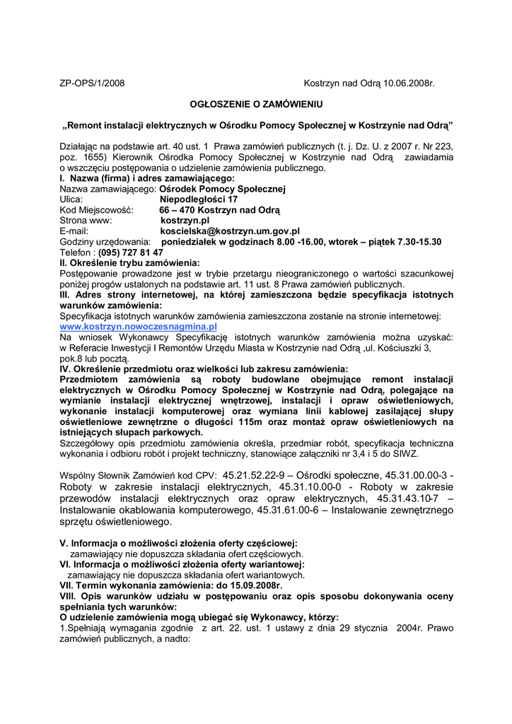 ZP-OPS/1/2008 Kostrzyn nad Odrą 10.06.2008r. OGŁOSZENIE O ZAMÓWIENIU „Remont instalacji elektrycznych w Ośrodku Pomocy Społecznej w Kostrzynie nad Odrą” Działając na podstawie art. 40 ust. 1 Prawa zamówień publicznych (t. j. Dz. U. z 2007 r. Nr 223, poz. 1655) Kierownik Ośrodka Pomocy Społecznej w Kostrzynie nad Odrą zawiadamia o wszczęciu postępowania o udzielenie zamówienia publicznego. I. Nazwa (firma) i adres zamawiającego: Nazwa zamawiającego: Ośrodek Pomocy Społecznej Ulica: Niepodległości 17 Kod Miejscowość: 66 – 470 Kostrzyn nad Odrą Strona www: kostrzyn.pl E-mail: [email protected] Godziny urzędowania: poniedziałek w godzinach 8.00 -16.00, wtorek – piątek 7.30-15.30 Telefon : (095) 727 81 47 II. Określenie trybu zamówienia: Postępowanie prowadzone jest w trybie przetargu nieograniczonego o wartości szacunkowej poniżej progów ustalonych na podstawie art. 11 ust. 8 Prawa zamówień publicznych. III. Adres strony internetowej, na której zamieszczona będzie specyfikacja istotnych warunków zamówienia: Specyfikacja istotnych warunków zamówienia zamieszczona zostanie na stronie internetowej: www.kostrzyn.nowoczesnagmina.pl Na wniosek Wykonawcy Specyfikację istotnych warunków zamówienia można uzyskać: w Referacie Inwestycji I Remontów Urzędu Miasta w Kostrzynie nad Odrą ,ul. Kościuszki 3, pok.8 lub pocztą. IV. Określenie przedmiotu oraz wielkości lub zakresu zamówienia: Przedmiotem zamówienia są roboty budowlane obejmujące remont instalacji elektrycznych w Ośrodku Pomocy Społecznej w Kostrzynie nad Odrą, polegające na wymianie instalacji elektrycznej wnętrzowej, instalacji i opraw oświetleniowych, wykonanie instalacji komputerowej oraz wymiana linii kablowej zasilającej słupy oświetleniowe zewnętrzne o długości 115m oraz montaż opraw oświetleniowych na istniejących słupach parkowych. Szczegółowy opis przedmiotu zamówienia określa, przedmiar robót, specyfikacja techniczna wykonania i odbioru robót i projekt techniczny, stanowiące załączniki nr 3,4 i 5 do SIWZ. Wspólny Słownik Zamówień kod CPV: 45.21.52.22-9 – Ośrodki społeczne, 45.31.00.00-3 - Roboty w zakresie instalacji elektrycznych, 45.31.10.00-0 - Roboty w zakresie przewodów instalacji elektrycznych oraz opraw elektrycznych, 45.31.43.10-7 – Instalowanie okablowania komputerowego, 45.31.61.00-6 – Instalowanie zewnętrznego sprzętu oświetleniowego. V. Informacja o możliwości złożenia oferty częściowej: zamawiający nie dopuszcza składania ofert częściowych. VI. Informacja o możliwości złożenia oferty wariantowej: zamawiający nie dopuszcza składania ofert wariantowych. VII. Termin wykonania zamówienia: do 15.09.2008r. VIII. Opis warunków udziału w postępowaniu oraz opis sposobu dokonywania oceny spełniania tych warunków: O udzielenie zamówienia mogą ubiegać się Wykonawcy, którzy: 1.Spełniają wymagania zgodnie z art. 22. ust. 1 ustawy z dnia 29 stycznia 2004r. Prawo zamówień publicznych, a nadto: a) wykonali w okresie ostatnich pięciu lat, a jeżeli okres prowadzenia działalności jest krótszy w tym okresie co najmniej jedną inwestycję polegającą na wykonaniu lub remoncie instalacji elektrycznych o łącznej wartości 50.000,00 zł. Spełnienie tego warunku musi być potwierdzone należytym wykonaniem robót (np. referencje lub protokół odbioru końcowego robót ); b) dysponują osobami zdolnymi do wykonania przedmiotu zamówienia, a kierownik robót posiada stosowne kwalifikacje do realizacji przedmiotu zamówienia : uprawnienia budowlane o specjalności sieci, instalacje i urządzenia elektryczne i elektroenergetyczne; c) przedstawią dokument wystawiony przez bank lub spółdzielczą kasę oszczędnościowokredytową, w których wykonawca posiada rachunek stwierdzający wysokość posiadanych środków w kwocie 35.000 PLN lub zdolność kredytową wykonawcy o wartości 35.000PLN, wystawiony nie wcześniej niż 3 miesiące przed upływem terminu składania ofert; d) posiadają polisę lub inny dokument ubezpieczenia potwierdzającego, że wykonawca jest ubezpieczony od odpowiedzialności cywilnej w zakresie prowadzonej działalności gospodarczej. 2. Nie podlegają wykluczeniu z postępowania o udzielenie zamówienia na podstawie art.24 ust.1 i 2 ustawy Prawo zamówień publicznych Ocena spełnienia warunków udziału w postępowaniu dokonywana będzie w oparciu o dokumenty złożone przez wykonawcę w niniejszym postępowaniu metodą warunku granicznego - spełnia/nie spełnia. IX. Informacje o oświadczeniach lub dokumentach jakie mają dostarczyć wykonawcy w celu potwierdzenia spełnienia warunków w postępowaniu: A. Na ofertę składają się następujące dokumenty i załączniki: A.1) Wypełniony i podpisany formularz ofertowy z wykorzystaniem wzoru - załącznik nr 1 do SIWZ wraz z załącznikami. A.2) Kosztorys ofertowy, sporządzony zgodnie ze wzorem, stanowiącym załącznik nr 5 do formularza ofertowego. B. W celu potwierdzenia, że wykonawca posiada uprawnienie do wykonywania określonej działalności lub czynności oraz nie podlega wykluczeniu na podstawie art. 24 Prawa zamówień publicznych składa następujące dokumenty: B.1) Aktualny odpis z właściwego rejestru albo aktualne zaświadczenie o wpisie do ewidencji działalności gospodarczej, jeżeli odrębne przepisy wymagają wpisu do rejestru lub zgłoszenia do ewidencji działalności gospodarczej, wystawione nie wcześniej niż 6 miesięcy przed upływem terminu składania ofert. B.2) Dokumenty potwierdzające posiadanie uprawnień/pełnomocnictw osób składających ofertę, o ile nie wynika to z przedstawionych dokumentów rejestrowych. B.3) Oświadczenie Wykonawcy o spełnieniu warunków udziału w postępowaniu z art. 22 Prawa zamówień publicznych. C.W celu potwierdzenia spełnienia warunku posiadania przez wykonawcę niezbędnej wiedzy i doświadczenia oraz dysponowania potencjałem technicznym i osobami zdolnymi