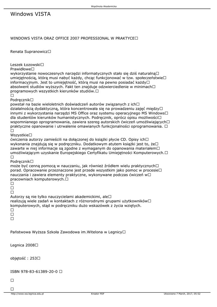 Wspólnota Akademicka Windows VISTA WINDOWS VISTA ORAZ OFFICE 2007 PROFESSIONAL W PRAKTYCE Renata Supranowicz Leszek Łozowski Prawidłowe wykorzystanie nowoczesnych narzędzi informatycznych stało się dziś naturalną umiejętnością, którą musi nabyć każdy, chcąc funkcjonować w tzw. społeczeństwie informacyjnym. Jest to umiejętność, którą musi na pewno posiadać każdy absolwent studiów wyższych. Fakt ten znajduje odzwierciedlenie w minimach programowych wszystkich kierunków studiów. Podręcznik powstał na bazie wieloletnich doświadczeń autorów związanych z ich działalnością dydaktyczną, która koncentrowała się na prowadzeniu zajęć między innymi z wykorzystania narzędzi MS Office oraz systemu operacyjnego MS Windows dla studentów kierunków humanistycznych. Podręcznik, oprócz opisu możliwości wspomnianego oprogramowania, zawiera szereg autorskich ćwiczeń umożliwiających praktyczne opanowanie i utrwalenie omawianych funkcjonalności oprogramowania. Wszystkie ćwiczenia autorzy zamieścili na dołączonej do książki płycie CD. Opisy ich wykonania znajdują się w podręczniku. Dodatkowym atutem książki jest to, że zawarte w niej informacje są zgodne z wymaganym do opanowania materiałem umożliwiającym uzyskanie Europejskiego Certyfikatu Umiejętności Komputerowych. Podręcznik może być cenną pomocą w nauczaniu, jak również źródłem wielu praktycznych porad. Opracowanie przeznaczone jest przede wszystkim jako pomoc w procesie nauczania i zawiera elementy praktyczne, wykonywane podczas ćwiczeń w pracowniach komputerowych. Autorzy są nie tylko nauczycielami akademickimi, ale realizują wiele zadań w kontaktach z różnorodnymi grupami użytkowników komputerowych, stąd w podręczniku dużo wskazówek z życia wziętych. Państwowa Wyższa Szkoła Zawodowa im.Witelona w Legnicy Legnica 2008 objętość : 253 ISBN 978-83-61389-20-0 http://www.wa.legnica.edu.pl Kreator PDF Utworzono 7 March, 2017, 05:52 Wspólnota Akademicka http://www.wa.legnica.edu.pl Kreator PDF Utworzono 7 March, 2017, 05:52