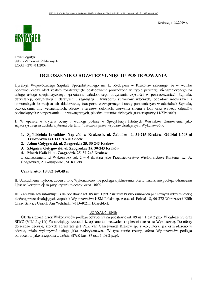 WSS im. Ludwika Rydygiera w Krakowie, 31-826 Kraków os. Złotej Jesieni 1; tel 012 64-68-207, fax 012 64-68-930 Kraków, 1.06.2009 r. Dział Logistyki Sekcja Zamówień Publicznych LOG.I – 271-/11/2009 OGŁOSZENIE O ROZSTRZYGNIĘCIU POSTĘPOWANIA Dyrekcja Wojewódzkiego Szpitala Specjalistycznego im. L. Rydygiera w Krakowie informuje, że w wyniku ponownej oceny ofert zostało rozstrzygnięte postępowanie prowadzone w trybie przetargu nieograniczonego na usługę usługę specjalistycznego sprzątania, całodobowego utrzymania czystości w pomieszczeniach Szpitala, dezynfekcji, dezynsekcji i deratyzacji, segregacji i transportu surowców wtórnych, odpadów medycznych i komunalnych do miejsca ich składowania, transportu wewnętrznego i usług pomocniczych w oddziałach Szpitala, oczyszczania ulic wewnętrznych, placów i terenów zielonych, usuwania śniegu i lodu oraz wywozu odpadów pochodzących z oczyszczania ulic wewnętrznych, placów i terenów zielonych (numer sprawy 11/ZP/2009). I. W oparciu o kryteria oceny i wymogi podane w Specyfikacji Istotnych Warunków Zamówienia jako najkorzystniejsza została wybrana oferta nr 4, złożona przez wspólnie działających Wykonawców: 1. Spółdzielnia Inwalidów Naprzód w Krakowie, ul. Żabiniec 46, 31-215 Kraków, Oddział Łódź ul Traktorowa 141/143, 91-203 Łódź 2. Adam Gołygowski, ul. Zaogrodzie 25, 30-243 Kraków 3. Zbigniew Gołygowski, ul. Zaogrodzie 25, 30-243 Kraków 4. Marek Kalicki, ul. Zaogrodzie 25, 30-243 Kraków z zaznaczeniem, iż Wykonawcy ad. 2 – 4 działają jako Przedsiębiorstwo Wielobranżowe Kontener s.c. A. Gołygowski, Z. Gołygowski, M. Kalicki Cena brutto: 18 882 160,48 zł II. Uzasadnienie wyboru: żaden z ww. Wykonawców nie podlega wykluczeniu, oferta ważna, nie podlega odrzuceniu i jest najkorzystniejsza przy kryterium oceny: cena 100%. III. Zamawiający informuje, iż na podstawie art. 89 ust. 1 pkt 2 ustawy Prawo zamówień publicznych odrzucił ofertę złożoną przez działających wspólnie Wykonawców: KSM Polska sp. z o.o. ul. Foksal 18, 00-372 Warszawa i Klüh Clinic Service GmbH, Am Wehrhahn 70 D-40211 Düsseldorf. UZASADNIENIE Oferta złożona przez Wykonawców podlega odrzuceniu na podstawie art. 89 ust. 1 pkt 2 pzp. W ogłoszeniu oraz SIWZ (VII.1.3.g i h) Zamawiający wskazał, iż opisane tam zezwolenia opiewać muszą na Wykonawcę. Do oferty dołączono decyzje, których adresatem jest PUK van Gansewinkel Kraków sp. z o.o., która, jak oświadczono w ofercie, miała wykonywać usługę jako podwykonawca. W tym stanie rzeczy, oferta Wykonawców podlega odrzuceniu, jako niezgodna z treścią SIWZ (art. 89 ust. 1 pkt 2 pzp). 1 WSS im. Ludwika Rydygiera w Krakowie, 31-826 Kraków os. Złotej Jesieni 1; tel 012 64-68-207, fax 012 64-68-930 IV. Streszczenie oceny i porównania złożonych ofert: Numer Nazwa Wykonawcy oferty I II III IV 1. Impel Cleaning sp. z o.o. ul. Ślężna 118, 53-111 Wrocław 2. Hospital Serwis sp. z o.o., ul. Ślężna 118, 52-111 Wrocław 3. Sita Kraków sp. z o.o., ul. Darwina 66, 31-764 Kraków 1. Aspen sp. z o.o., ul. Bularnia 5, 31-222 Kraków 2. Aspen Plus sp. z o.o., ul. Bularnia 5, 31-222 Kraków 1. ISS Facility Services sp. z o.o., ul. Jordanowska 2a, 04-204 Warszawa 2. Remondis sp. z o.o., ul. Zawodzie 16, 02-891 Warszawa 1. Spółdzielnia Inwalidów Naprzód w Krakowie, ul. Żabiniec 46, 31-215 Kraków, Oddział Łódź ul Traktorowa 141/143, 91-203 Łódź 2. Adam Gołygowski, ul. Zaogrodzie 25, 30-243 Kraków 3. Zbigniew Gołygowski, ul. Zaogrodzie 25, 30-243 Kraków 4. Marek Kalicki, ul. Zaogrodzie 25, 30-243 Kraków Liczba pkt w kryterium Razem „cena” pkt 46,640 46,640 49,365 49,365 49,140 49,140 50,000 50,000 W ofertach I i IV Zamawiający na podstawie art. 87 ust. 2 pkt 2 ustawy Prawo Zamówień publicznych poprawił oczywiste omyłki rachunkowe. V. Umowa dotycząca przedmiotu zamówienia opisanego w niniejszym ogłoszeniu o wyborze zostanie zawarta zgodnie z art. 94 ust.1 ustawy Prawo zamówień publicznych. Dziękujemy za udział w przetargu. 2