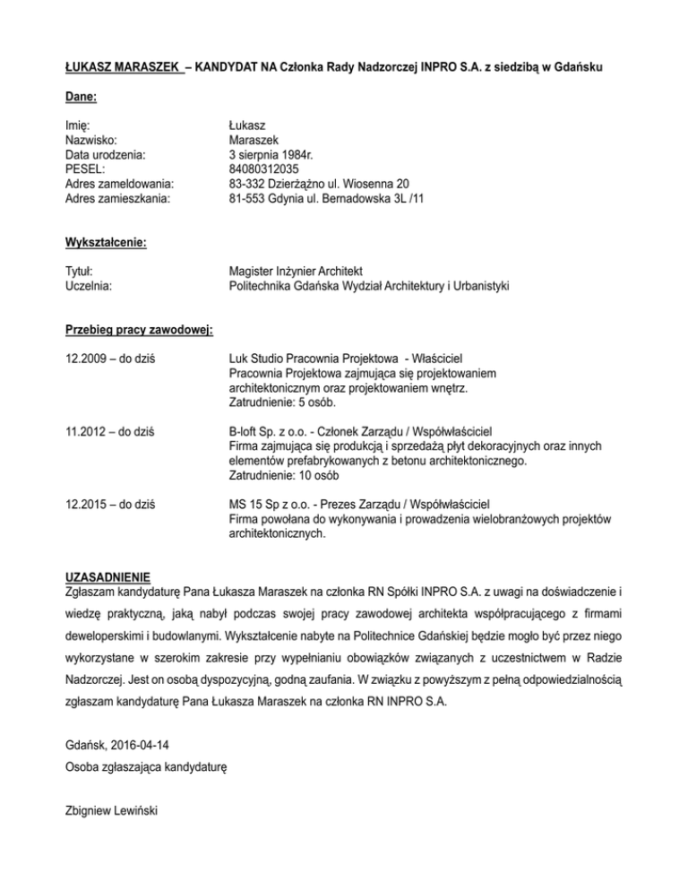 ŁUKASZ MARASZEK – KANDYDAT NA Członka Rady Nadzorczej INPRO S.A. z siedzibą w Gdańsku Dane: Imię: Nazwisko: Data urodzenia: PESEL: Adres zameldowania: Adres zamieszkania: Łukasz Maraszek 3 sierpnia 1984r. 84080312035 83-332 Dzierżążno ul. Wiosenna 20 81-553 Gdynia ul. Bernadowska 3L /11 Wykształcenie: Tytuł: Uczelnia: Magister Inżynier Architekt Politechnika Gdańska Wydział Architektury i Urbanistyki Przebieg pracy zawodowej: 12.2009 – do dziś Luk Studio Pracownia Projektowa - Właściciel Pracownia Projektowa zajmująca się projektowaniem architektonicznym oraz projektowaniem wnętrz. Zatrudnienie: 5 osób. 11.2012 – do dziś B-loft Sp. z o.o. - Członek Zarządu / Współwłaściciel Firma zajmująca się produkcją i sprzedażą płyt dekoracyjnych oraz innych elementów prefabrykowanych z betonu architektonicznego. Zatrudnienie: 10 osób 12.2015 – do dziś MS 15 Sp z o.o. - Prezes Zarządu / Współwłaściciel Firma powołana do wykonywania i prowadzenia wielobranżowych projektów architektonicznych. UZASADNIENIE Zgłaszam kandydaturę Pana Łukasza Maraszek na członka RN Spółki INPRO S.A. z uwagi na doświadczenie i wiedzę praktyczną, jaką nabył podczas swojej pracy zawodowej architekta współpracującego z firmami deweloperskimi i budowlanymi. Wykształcenie nabyte na Politechnice Gdańskiej będzie mogło być przez niego wykorzystane w szerokim zakresie przy wypełnianiu obowiązków związanych z uczestnictwem w Radzie Nadzorczej. Jest on osobą dyspozycyjną, godną zaufania. W związku z powyższym z pełną odpowiedzialnością zgłaszam kandydaturę Pana Łukasza Maraszek na członka RN INPRO S.A. Gdańsk, 2016-04-14 Osoba zgłaszająca kandydaturę Zbigniew Lewiński
