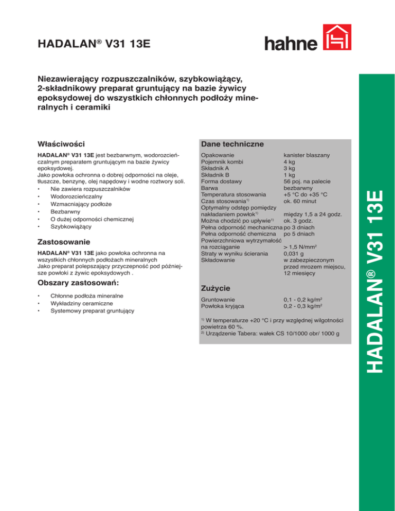 HADALAN® V31 13E Właściwości Dane techniczne HADALAN® V31 13E jest bezbarwnym, wodorozcieńczalnym preparatem gruntującym na bazie żywicy epoksydowej. Jako powłoka ochronna o dobrej odporności na oleje, tłuszcze, benzynę, olej napędowy i wodne roztwory soli. • Nie zawiera rozpuszczalników • Wodorozcieńczalny • Wzmacniający podłoże • Bezbarwny • O dużej odporności chemicznej • Szybkowiążący Opakowanie kanister blaszany Pojemnik kombi 4 kg Składnik A 3 kg Składnik B 1 kg Forma dostawy 56 poj. na palecie Barwa bezbarwny Temperatura stosowania +5 °C do +35 °C Czas stosowania1) ok. 60 minut Optymalny odstęp pomiędzy nakładaniem powłok1) między 1,5 a 24 godz. Można chodzić po upływie1) ok. 3 godz. Pełna odporność mechaniczna po 3 dniach Pełna odporność chemiczna po 5 dniach Powierzchniowa wytrzymałość na rozciąganie > 1,5 N/mm2 Straty w wyniku ścierania 0,031 g Składowanie w zabezpieczonym przed mrozem miejscu, 12 miesięcy Zastosowanie HADALAN® V31 13E jako powłoka ochronna na wszystkich chłonnych podłożach mineralnych Jako preparat polepszający przyczepność pod późniejsze powłoki z żywic epoksydowych . Obszary zastosowań: • • • Chłonne podłoża mineralne Wykładziny ceramiczne Systemowy preparat gruntujący Zużycie Gruntowanie Powłoka kryjąca 0,1 - 0,2 kg/m2 0,2 - 0,3 kg/m2 W temperaturze +20 °C i przy względnej wilgotności powietrza 60 %. 2) Urządzenie Tabera: wałek CS 10/1000 obr/ 1000 g 1) HADALAN® V31 13E Niezawierający rozpuszczalników, szybkowiążący, 2-składnikowy preparat gruntujący na bazie żywicy epoksydowej do wszystkich chłonnych podłoży mineralnych i ceramiki HADALAN® V31 13E Przygotowanie podłoża Bezpieczeństwo pracy / zalecenia Podłoża pokryte pomocniczymi środkami wygładzającymi (np. woskiem), wymagają odpowiedniego przygotowania (frezowanie, piaskowanie). Próba polegająca na zwilżeniu podłoża wodą daje pierwszą odpowiedź, co do jego chłonności. Dokładniejsze informacje dotyczące bezpieczeństwa transportu, składowania i obchodzenia się z produktem podane są w aktualnej karcie charakterystyki preparatu niebezpiecznego. Dokładne wskazówki podane są w instrukcji technicznej “Żywice epoksydowe w gospodarce budowlanej“. Wydawca Wspólnota Robocza Organizacji Branżowych Budownictwa, Organizacja Branżowa Budownictwa Lądowego, Związek Przemysłowy Producentów Kleju stow. zarej., Chemia Budowlana i Ochrona Drewna stow. zarej. we Frankfurcie. Wykonanie 1. 2. 3. 4. Wymieszać składnik A ze składnikiem B do uzyskania jednorodnej konsystencji. Proporcje mieszanki 3 części wagowe składnika A : 1 część wagowa składnika B Po wymieszaniu przelać masę do czystego pojemnika, rozcieńczyć wodą i jeszcze raz dokładnie wymieszać. Proporcje mieszanki: Jako preparat polepszający przyczepność i do gruntowania : 1 : 1 części wagowych W przypadku stosowania jako powłokę ochronną, do zamknięcia porów i podkład pod dyspersyjne powłoki z żywicy epoksydowej (HADALAN® LF41 12E/HADALAN® EBG 13E/ HADALAN® FGM003 57M) dodaje się wagowo tylko 25 % wody. Materiał nakłada się pędzlem, gumowym zgarniakiem lub wałkiem. Dla uzyskania równomiernych powierzchni żywicę rozprowadza się na krzyż za pomocą odpowiedniego wałka z krótkim włosiem. Sprzęt i narzędzia robocze czyścić wodą natychmiast po ich użyciu. Produkty systemowe hahne Usuwanie odpadów Dla wszystkich systemów obowiązują aktualne przepisy krajowe. Producent Heinrich Hahne GmbH & Co KG Heinrich-Hahne-Weg 11 D-45711 Datteln Dystrybutor VISBUD Projekt Sp. z o.o. ul. M. Bacciarellego 8E /I 51-649 Wrocław Tel. (+48) 71 344 04 34 Fax (+48) 71 345 17 72 e-mail: [email protected] HADALAN® EBG 13E HADALAN® LF41 12E HADALAN® LF51 12E Ważne wskazówki • • • • • • Przestrzegać temperatury stosowania w zakresie od +5 °C do +35 °C. Wysokie temperatury przyspieszają, niskie temperatury wydłużają proces wiązania. Wysoka wilgotność powietrza oraz wilgoć występująca w podłożu wydłużają przebieg wiązania. W obszarach wewnętrznych zapewnić dobre warunki schnięcia. Nierównomierne nakładanie materiału i/lub zła wentylacja podczas fazy schnięcia mogą prowadzić do występowania różnic kolorystycznych i połysku. Temperatura podłoża musi wynosić co najmniej 3 °C powyżej temperatury punktu rosy. Składniki Dyspersja żywicy epoksydowej Opisane wyżej właściwości materiału oparte są na wieloletnim doświadczeniu i badaniach laboratoryjnych. Właściwości materiału nie odnoszą się do wszystkich podłoży i przypadków zastosowania. W przypadkach powierzchni wątpliwych należy wykonać próby. Zmiany techniczne w ramach doskonalenia produktu zastrzeżone. W pozostałym zakresie obowiązują nasze ogólne warunki handlowe. Stan: 8.2014