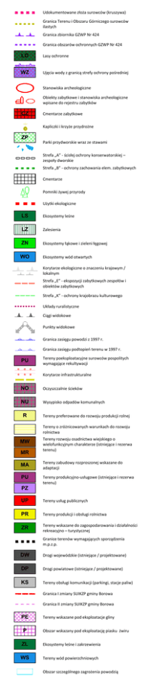 Udokumentowane złoża surowców (kruszywa) Granica Terenu i Obszaru Górniczego surowców ilastych Granica zbiornika GZWP Nr 424 Granica obszarów ochronnych GZWP Nr 424 LO Lasy ochronne WZ Ujęcia wody z granicą strefy ochrony pośredniej Stanowiska archeologiczne Obiekty zabytkowe i stanowiska archeologiczne wpisane do rejestru zabytków CZ Cmentarze zabytkowe Kapliczki i krzyże przydrożne ZP Parki przydworskie wraz ze stawami Strefa „A” - ścisłej ochrony konserwatorskiej – zespoły dworskie Strefa „B” - ochrony zachowania elem. zabytkowych Cmentarze Pomniki żywej przyrody Użytki ekologiczne LS Ekosystemy leśne LZ Zalesienia ZN Ekosystemy łąkowe i zieleni łęgowej WO Ekosystemy wód otwartych Korytarze ekologiczne o znaczeniu krajowym / lokalnym Strefa „E” - ekspozycji zabytkowych zespołów i obiektów zabytkowych Strefa „K” - ochrony krajobrazu kulturowego Układy ruralistyczne Ciągi widokowe Punkty widokowe Granica zasięgu powodzi z 1997 r. Granica zasięgu podtopień terenu w 1997 r. PU Tereny poeksploatacyjne surowców pospolitych wymagające rekultywacji Korytarze infrastrukturalne NO Oczyszczalnie ścieków NU Wysypisko odpadów komunalnych R Tereny preferowane do rozwoju produkcji rolnej Tereny o zróżnicowanych warunkach do rozwoju rolnictwa MW MR Tereny rozwoju osadnictwa wiejskiego o wielofunkcyjnym charakterze (istniejące i rezerwa terenu) MA Tereny zabudowy rozproszonej wskazane do adaptacji PU Tereny produkcyjno-usługowe (istniejące i rezerwa terenu) PZ UP Tereny usług publicznych PR Tereny produkcji i obsługi rolnictwa ZR Tereny wskazane do zagospodarowania i działalności rekreacyjno – turystycznej Granice terenów wymagających sporządzenia m.p.z.p. DW Drogi wojewódzkie (istniejące / projektowane) DP Drogi powiatowe (istniejące / projektowane) KS Tereny obsługi komunikacji (parkingi, stacje paliw) Granica I zmiany SUIKZP gminy Borowa Granica II zmiany SUIKZP gminy Borowa PE P Tereny wskazane pod eksploatacje gliny Obszar wskazany pod eksploatację piasku żwiru ZL Ekosystemy leśne i zakrzewienia WS Tereny wód powierzchniowych Obszar szczególnego zagrożenia powodzią