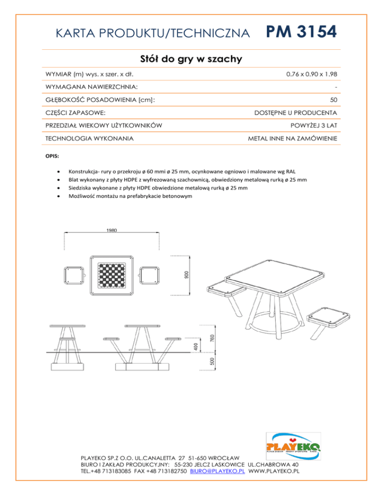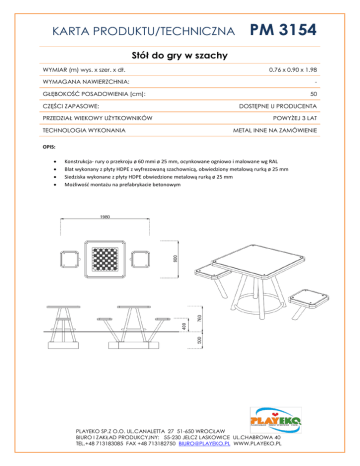 KARTA PRODUKTU/TECHNICZNA PM 3154 Stół do gry w szachy WYMIAR (m) wys. x szer. x dł. 0.76 x 0.90 x 1.98 WYMAGANA NAWIERZCHNIA: - GŁĘBOKOŚĆ POSADOWIENIA [cm]: CZĘŚCI ZAPASOWE: PRZEDZIAŁ WIEKOWY UŻYTKOWNIKÓW TECHNOLOGIA WYKONANIA 50 DOSTĘPNE U PRODUCENTA POWYŻEJ 3 LAT METAL INNE NA ZAMÓWIENIE OPIS: Konstrukcja- rury o przekroju ø 60 mmi ø 25 mm, ocynkowane ogniowo i malowane wg RAL Blat wykonany z płyty HDPE z wyfrezowaną szachownicą, obwiedziony metalową rurką ø 25 mm Siedziska wykonane z płyty HDPE obwiedzione metalową rurką ø 25 mm Możliwość montażu na prefabrykacie betonowym PLAYEKO SP.Z O.O. UL.CANALETTA 27 51-650 WROCŁAW BIURO I ZAKŁAD PRODUKCYJNY: 55-230 JELCZ LASKOWICE UL.CHABROWA 40 TEL.+48 713183085 FAX +48 713182750 [email protected] WWW.PLAYEKO.PL