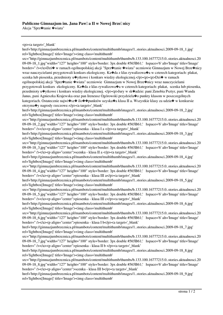 Publiczne Gimnazjum im. Jana Paw�a II w Nowej Brze�nicy Akcja "Sprz�tanie �wiata" <p><a target='_blank' href='http://gimnazjumbrzeznica.pl/mambots/content/multithumb/images/1..stories.aktualnosci.2009-09-18_1.jpg' rel='lightbox[Image]' title='Image'><img class='multithumb' src="http://gimnazjumbrzeznica.pl/mambots/content/multithumb/thumbs/b.133.100.16777215.0..stories.aktualnosci.20 09-09-18_1.jpg"width="127" height="100" style='border: 3px double #565B61;' hspace='6' alt='Image' title='Image' border='' /></a>Dzi� w ramach ogólnopolskiej akcji "Sprz�tanie �wiata" uczniowie Gimnazjum w Nowej Brze�nicy wraz nauczycielami przygotowali konkurs ekologiczny. Ka�da z klas rywalizowa�a w czterech kategoriach: plakat, scenka lub piosenka, przedmioty u�ytkowe i konkurs wiedzy ekologicznej.</p><p><p>Dzi� w ramach ogólnopolskiej akcji "Sprz�tanie �wiata" uczniowie Gimnazjum w Nowej Brze�nicy wraz nauczycielami przygotowali konkurs ekologiczny. Ka�da z klas rywalizowa�a w czterech kategoriach: plakat, scenka lub piosenka, przedmioty u�ytkowe i konkurs wiedzy ekologicznej. </p><p>Jury w sk�adzie: pani Zenobia Psztyr, pani Wanda Janus, pani Agnieszka Krajewska oraz pan Ireneusz Ogórowski przydziela�o punkty klasom w poszczególnych kategoriach. Ostatecznie najwi�sz� ilo��punktów uzyska�a klasa II a. Wszystkie klasy za udzia� w konkursie otrzyma�y nagrody rzeczowe.</p><a target='_blank' href='http://gimnazjumbrzeznica.pl/mambots/content/multithumb/images/1..stories.aktualnosci.2009-09-18_2.jpg' rel='lightbox[Image]' title='Image'><img class='multithumb' src="http://gimnazjumbrzeznica.pl/mambots/content/multithumb/thumbs/b.133.100.16777215.0..stories.aktualnosci.20 09-09-18_2.jpg"width="127" height="100" style='border: 3px double #565B61;' hspace='6' alt='Image' title='Image' border='' /></a><p align="center">piosenka - klasa I a </p><a target='_blank' href='http://gimnazjumbrzeznica.pl/mambots/content/multithumb/images/1..stories.aktualnosci.2009-09-18_3.jpg' rel='lightbox[Image]' title='Image'><img class='multithumb' src="http://gimnazjumbrzeznica.pl/mambots/content/multithumb/thumbs/b.133.100.16777215.0..stories.aktualnosci.20 09-09-18_3.jpg"width="127" height="100" style='border: 3px double #565B61;' hspace='6' alt='Image' title='Image' border='' /></a><p align="center">scenka - klasa II a </p><a target='_blank' href='http://gimnazjumbrzeznica.pl/mambots/content/multithumb/images/1..stories.aktualnosci.2009-09-18_4.jpg' rel='lightbox[Image]' title='Image'><img class='multithumb' src="http://gimnazjumbrzeznica.pl/mambots/content/multithumb/thumbs/b.133.100.16777215.0..stories.aktualnosci.20 09-09-18_4.jpg"width="127" height="100" style='border: 3px double #565B61;' hspace='6' alt='Image' title='Image' border='' /></a><p align="center">piosenka - klasa III a</p><a target='_blank' href='http://gimnazjumbrzeznica.pl/mambots/content/multithumb/images/1..stories.aktualnosci.2009-09-18_5.jpg' rel='lightbox[Image]' title='Image'><img class='multithumb' src="http://gimnazjumbrzeznica.pl/mambots/content/multithumb/thumbs/b.133.100.16777215.0..stories.aktualnosci.20 09-09-18_5.jpg"width="127" height="100" style='border: 3px double #565B61;' hspace='6' alt='Image' title='Image' border='' /></a><p align="center">piosenka - klasa III c</p><a target='_blank' href='http://gimnazjumbrzeznica.pl/mambots/content/multithumb/images/1..stories.aktualnosci.2009-09-18_6.jpg' rel='lightbox[Image]' title='Image'><img class='multithumb' src="http://gimnazjumbrzeznica.pl/mambots/content/multithumb/thumbs/b.133.100.16777215.0..stories.aktualnosci.20 09-09-18_6.jpg"width="127" height="100" style='border: 3px double #565B61;' hspace='6' alt='Image' title='Image' border='' /></a><p align="center">piosenka - klasa I b</p><a target='_blank' href='http://gimnazjumbrzeznica.pl/mambots/content/multithumb/images/1..stories.aktualnosci.2009-09-18_7.jpg' rel='lightbox[Image]' title='Image'><img class='multithumb' src="http://gimnazjumbrzeznica.pl/mambots/content/multithumb/thumbs/b.133.100.16777215.0..stories.aktualnosci.20 09-09-18_7.jpg"width="127" height="100" style='border: 3px double #565B61;' hspace='6' alt='Image' title='Image' border='' /></a><p align="center">piosenka - klasa II b </p><a target='_blank' href='http://gimnazjumbrzeznica.pl/mambots/content/multithumb/images/1..stories.aktualnosci.2009-09-18_8.jpg' rel='lightbox[Image]' title='Image'><img class='multithumb' src="http://gimnazjumbrzeznica.pl/mambots/content/multithumb/thumbs/b.133.100.16777215.0..stories.aktualnosci.20 09-09-18_8.jpg"width="127" height="100" style='border: 3px double #565B61;' hspace='6' alt='Image' title='Image' border='' /></a><p align="center">scenka - klasa III b</p><a target='_blank' href='http://gimnazjumbrzeznica.pl/mambots/content/multithumb/images/1..stories.aktualnosci.2009-09-18_9.jpg' rel='lightbox[Image]' title='Image'><img class='multithumb' strona 1 / 2 Publiczne Gimnazjum im. Jana Paw�a II w Nowej Brze�nicy Akcja "Sprz�tanie �wiata" src="http://gimnazjumbrzeznica.pl/mambots/content/multithumb/thumbs/b.133.100.16777215.0..stories.aktualnosci.20 09-09-18_9.jpg"width="127" height="100" style='border: 3px double #565B61;' hspace='6' alt='Image' title='Image' border='' /></a><p align="center">scenka - klasa III b</p><a target='_blank' href='http://gimnazjumbrzeznica.pl/mambots/content/multithumb/images/1..stories.aktualnosci.2009-09-18_10.jpg' rel='lightbox[Image]' title='Image'><img class='multithumb' src="http://gimnazjumbrzeznica.pl/mambots/content/multithumb/thumbs/b.133.100.16777215.0..stories.aktualnosci.20 09-09-18_10.jpg"width="127" height="100" style='border: 3px double #565B61;' hspace='6' alt='Image' title='Image' border='' /></a><p align="center">scenka - klasa I c</p><a target='_blank' href='http://gimnazjumbrzeznica.pl/mambots/content/multithumb/images/1..stories.aktualnosci.2009-09-18_11.jpg' rel='lightbox[Image]' title='Image'><img class='multithumb' src="http