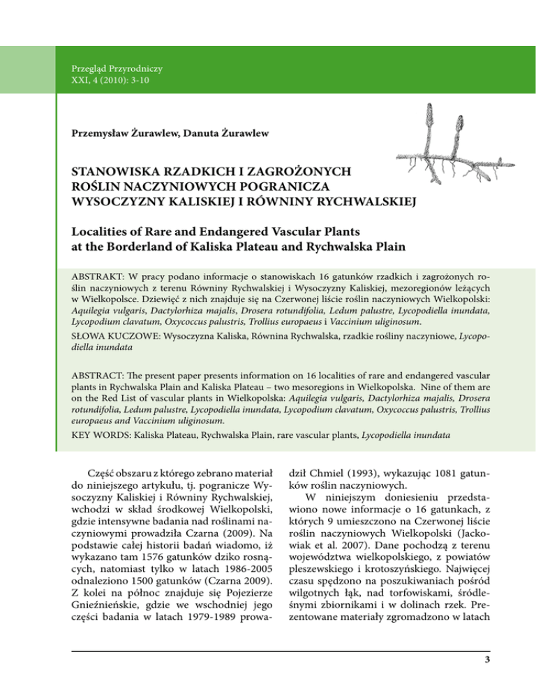 Przegląd Przyrodniczy XXI, 4 (2010): 3-10 Przemysław Żurawlew, Danuta Żurawlew STANOWISKA RZADKICH I ZAGROŻONYCH ROŚLIN NACZYNIOWYCH POGRANICZA WYSOCZYZNY KALISKIEJ I RÓWNINY RYCHWALSKIEJ Localities of Rare and Endangered Vascular Plants at the Borderland of Kaliska Plateau and Rychwalska Plain ABSTRAKT: W pracy podano informacje o stanowiskach 16 gatunków rzadkich i zagrożonych roślin naczyniowych z terenu Równiny Rychwalskiej i Wysoczyzny Kaliskiej, mezoregionów leżących w Wielkopolsce. Dziewięć z nich znajduje się na Czerwonej liście roślin naczyniowych Wielkopolski: Aquilegia vulgaris, Dactylorhiza majalis, Drosera rotundifolia, Ledum palustre, Lycopodiella inundata, Lycopodium clavatum, Oxycoccus palustris, Trollius europaeus i Vaccinium uliginosum. SŁOWA KUCZOWE: Wysoczyzna Kaliska, Równina Rychwalska, rzadkie rośliny naczyniowe, Lycopodiella inundata ABSTRACT: The present paper presents information on 16 localities of rare and endangered vascular plants in Rychwalska Plain and Kaliska Plateau – two mesoregions in Wielkopolska. Nine of them are on the Red List of vascular plants in Wielkopolska: Aquilegia vulgaris, Dactylorhiza majalis, Drosera rotundifolia, Ledum palustre, Lycopodiella inundata, Lycopodium clavatum, Oxycoccus palustris, Trollius europaeus and Vaccinium uliginosum. KEY WORDS: Kaliska Plateau, Rychwalska Plain, rare vascular plants, Lycopodiella inundata Część obszaru z którego zebrano materiał do niniejszego artykułu, tj. pogranicze Wysoczyzny Kaliskiej i Równiny Rychwalskiej, wchodzi w skład środkowej Wielkopolski, gdzie intensywne badania nad roślinami naczyniowymi prowadziła Czarna (2009). Na podstawie całej historii badań wiadomo, iż wykazano tam 1576 gatunków dziko rosnących, natomiast tylko w latach 1986-2005 odnaleziono 1500 gatunków (Czarna 2009). Z kolei na północ znajduje się Pojezierze Gnieźnieńskie, gdzie we wschodniej jego części badania w latach 1979-1989 prowa- dził Chmiel (1993), wykazując 1081 gatunków roślin naczyniowych. W niniejszym doniesieniu przedstawiono nowe informacje o 16 gatunkach, z których 9 umieszczono na Czerwonej liście roślin naczyniowych Wielkopolski (Jackowiak et al. 2007). Dane pochodzą z terenu województwa wielkopolskiego, z powiatów pleszewskiego i krotoszyńskiego. Najwięcej czasu spędzono na poszukiwaniach pośród wilgotnych łąk, nad torfowiskami, śródleśnymi zbiornikami i w dolinach rzek. Prezentowane materiały zgromadzono w latach Przegląd Przyrodniczy XXI, 4 (2010) 2004-2010. Są one udokumentowane fotograficznie, a zebrano je podczas licznych badań przyrodniczych, szczególnie entomologicznych. Dokumentacja fotograficzna znajduje się w zbiorach autorów. Przegląd gatunków Aquilegia vulgaris L. – orlik pospolity - Uroczysko Teresiny, oddział 24b (gm. Krotoszyn), Dąbrowy Krotoszyńskie, Obszar Natura 2000, ATPOL: CD73, pobocze drogi w lesie dębowym, 28.05.2010, kilkanaście kwitnących exx. Wymieniony na Czerwonej liście roślin naczyniowych Wielkopolski, kategoria VU, jako narażony (Jackowiak et al. 2007). We wschodniej części Pojezierza Gnieźnieńskiego odnaleziono pięć stanowisk (Chmiel 1993), a w środkowej Wielkopolsce ostatnio tylko jedno naturalne stanowisko (Czarna 2009). Calla palustris L. – czermień błotna - Białobłoty (gm. Gizałki), ATPOL: CD45, 8.06.2008, kilka exx. - Józefów (gm. Chocz), ATPOL: CD55, na wschód od wsi, 8.06.2008, 10.06.2010, liczne exx. - Pomiędzy Piłą a Starym Oleścem (gm. Chocz), ATPOL: CD55, 1995, nieliczne exx. W roku 2010 stwierdzono zanik tej rośliny na stanowisku (E. Markiewicz). - Nowolipsk (gm. Chocz), ATPOL: CD55, przy strzelnicy, 5.09.2010, liczne exx. (E. Markiewicz). Znajdowana nad śródleśnymi torfowiskami i zbiornikami. Znana z kilkunastu stanowisk we wschodniej części Pojezierza Gnieźnieńskiego (Chmiel 1993). W środkowej Wielkopolsce zanotowana tylko na dwóch stanowiskach (Czarna 2009). Centaurium erythraea Rafn – centuria pospolita - Lenartowice (gm. Pleszew), Glinianki w Lenartowicach, Obszar Natura 2000, ATPOL: CD54, 4.09.2009, kilka exx. Gatunek objęty ścisłą ochroną w naszym kraju. Podawana z nielicznych stanowisk przez Chmiela (1993) i Czarną (2009). Dactylorhiza majalis (Rchb.) P. F. Hunt & Summerth. – kukułka szerokolistna - Pomiędzy Tomicami a Gizałkami (gm. Gizałki), ATPOL: CD44, 10.06.2007, 23 exx., 8.06.2008, 20 exx., 6.06.2010, 45 exx. - Zielona Łąka (gm. Pleszew), ATPOL: CD64, w dolinie Neru, 22.05.2008, 20 exx., 20.05.2009, 8 exx., 9.06.2010, 9 exx. - Pleszew (gm. Pleszew), ATPOL: CD64, w dolinie rzeki Ner, 15.05.2009, 6 exx., 30.05.2010, 5 exx. - Karmin (gm. Dobrzyca), Dąbrowy Krotoszyńskie, Obszar Natura 2000, ATPOL: CD64, 24.05.2010, 1 ex. - Roszki (gm. Krotoszyn), Dąbrowy Krotoszyńskie, Obszar Natura 2000, ATPOL: CD73, 28.05.2010, 1 ex. Notowana na wilgotnych łąkach. Gatunek umieszczony na Czerwonej liście roślin naczyniowych Wielkopolski, kategoria LC, najmniejszej troski (Jackowiak et al. 2007). Wykazywana z wielu stanowisk (Chmiel 1993, Czarna 2009). Drosera rotundifolia L. – rosiczka okrągłolistna - Garncarski Kąt (gm. Gizałki), ATPOL: CD45, na południe od wsi, 2 stanowiska, 1) 4.05.2007, 8.06.2008, 16 i 27.09.2009, liczne exx., 2) 10.07.2010, ponad 100 exx. - Orlina Duża (gm. Gizałki), ATPOL: CD45, na północ od tej miejscowości, 19.08.2009, kilkanaście exx. - Józefów (gm. Chocz), ATPOL: CD55, licznie występowała na 5 stanowiskach na wschód od tej miejscowości: 1) 8 i 19.06.2008, 10.06.2010, 2-5) 15.07.2010. - Pomiędzy Piłą a Nowolipskiem (gm. Chocz), ATPOL: CD55, 3.09.2008, kilkadziesiąt exx. (E. Markiewicz). Żurawlew P., Żurawlew D. – Stanowiska rzadkich i zagrożonych roślin naczyniowych ... Ryc. 1. Rozmieszczenie stanowisk poszczególnych gatunków. Aquilegia vulgaris (nr 1), Calla palustris (22, 23, 25, 35), Centaurium erythraea (6), Dactylorhiza majalis (2, 3, 16, 17, 18), Drosera rotundifolia 