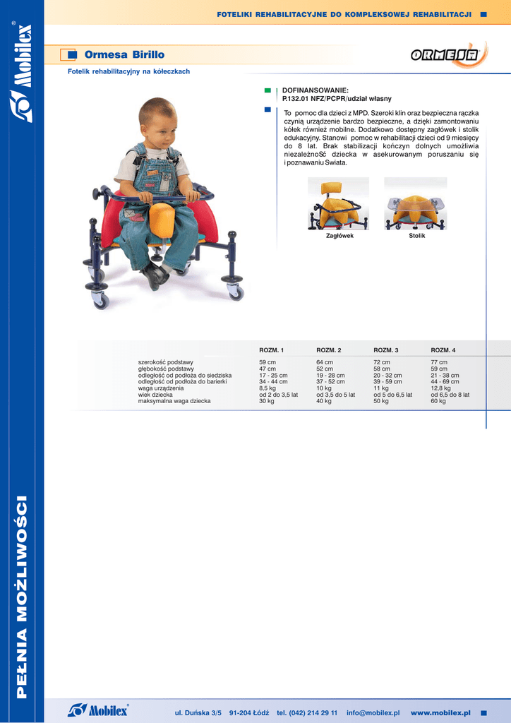 FOTELIKI REHABILITACYJNE DO KOMPLEKSOWEJ REHABILITACJI Ormesa Birillo Fotelik rehabilitacyjny na kółeczkach DOFINANSOWANIE: P.132.01 NFZ/PCPR/udział własny To pomoc dla dzieci z MPD. Szeroki klin oraz bezpieczna rączka czynią urządzenie bardzo bezpieczne, a dzięki zamontowaniu kółek również mobilne. Dodatkowo dostępny zagłówek i stolik edukacyjny. Stanowi pomoc w rehabilitacji dzieci od 9 miesięcy do 8 lat. Brak stabilizacji kończyn dolnych umożliwia niezależnoSć dziecka w asekurowanym poruszaniu się i poznawaniu Swiata. Zagłówek ROZM. 1 ROZM. 2 ROZM. 3 ROZM. 4 59 cm 47 cm 17 - 25 cm 34 - 44 cm 8,5 kg od 2 do 3,5 lat 30 kg 64 cm 52 cm 19 - 28 cm 37 - 52 cm 10 kg od 3,5 do 5 lat 40 kg 72 cm 58 cm 20 - 32 cm 39 - 59 cm 11 kg od 5 do 6,5 lat 50 kg 77 cm 59 cm 21 - 38 cm 44 - 69 cm 12,8 kg od 6,5 do 8 lat 60 kg PEŁNIA MOŻLIWOŚCI szerokość podstawy głębokość podstawy odległość od podłoża do siedziska odległość od podłoża do barierki waga urządzenia wiek dziecka maksymalna waga dziecka Stolik ul. Duńska 3/5 91-204 Łódź tel. (042) 214 29 11 [email protected] www.mobilex.pl