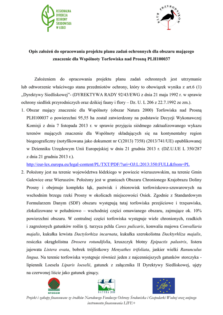 Opis założeń do opracowania projektu planu zadań ochronnych dla obszaru mającego znaczenie dla Wspólnoty Torfowiska nad Prosną PLH100037 Założeniem do opracowania projektu planu zadań ochronnych jest utrzymanie lub odtworzenie właściwego stanu przedmiotów ochrony, który to obowiązek wynika z art.6 (1) „Dyrektywy Siedliskowej”- (DYREKTYWA RADY 92/43/EWG z dnia 21 maja 1992 r. w sprawie ochrony siedlisk przyrodniczych oraz dzikiej fauny i flory – Dz. U. L 206 z 22.7.1992 ze zm.). 1. Obszar mający znaczenie dla Wspólnoty (obszar Natura 2000) Torfowiska nad Prosną PLH100037 o powierzchni 95,55 ha został zatwierdzony na podstawie Decyzji Wykonawczej Komisji z dnia 7 listopada 2013 r. w sprawie przyjęcia siódmego zaktualizowanego wykazu terenów mających znaczenie dla Wspólnoty składających się na kontynentalny region biogeograficzny (notyfikowana jako dokument nr C(2013) 7358) (2013/741/UE) opublikowanej w Dzienniku Urzędowym Unii Europejskiej w dniu 21 grudnia 2013 r. (DZ.U.UE L 350/287 z dnia 21 grudnia 2013 r.). http://eur-lex.europa.eu/legal-content/PL/TXT/PDF/?uri=OJ:L:2013:350:FULL&from=PL 2. Położony jest na terenie województwa łódzkiego w powiecie wieruszowskim, na terenie Gmin Galewice oraz Wieruszów. Położony jest w granicach Obszaru Chronionego Krajobrazu Doliny Prosny i obejmuje kompleks łąk, pastwisk i zbiorowisk torfowiskowo-szuwarowych na wschodnim brzegu rzeki Prosny w okolicach miejscowości Osiek. Zgodnie z Standardowym Formularzem Danym (SDF) obszaru występują tutaj torfowiska przejściowe i trzęsawiska, zlokalizowane w południowo – wschodniej części omawianego obszaru, zajmujące ok. 10% powierzchni obszaru. W centralnej części torfowiska występuje wiele chronionych, rzadkich i zagrożonych gatunków roślin tj. turzyca pchla Carex pulicaris, konwalia majowa Convallaria majalis, kukułka krwista Dactylorhiza incarnata, kukułka szerokolistna Dacktyrhliza majalis, rosiczka okrągłolistna Drosera rotundifolia, kruszczyk błotny Epipactis palustris, listera jajowata Listera ovata, bobrek trójlistkowy Menyathes trifoliata, jaskier wielki Ranunculus lingua. Na terenie torfowiska występuje również jeden z najcenniejszych gatunków storczyka lipiennik Loesela Liparis loeselii, gatunek z załącznika II Dyrektywy Siedliskowej, ujęty na czerwonej liście jako gatunek ginący. Projekt i zakupy finansowane ze środków Narodowego Funduszu Ochrony Środowiska i Gospodarki Wodnej oraz unijnego instrumentu finansowania LIFE+ Przedmiotami ochrony w obszarze Natura 2000 Torfowiska nad Prosną PLH100037 3. są następujące siedliska przyrodnicze i gatunki roślin: 7140 Torfowiska przejściowe i trzęsawiska (przeważnie z roślinnością z Scheuchzerio-Caricetea); *91E0 Łęgi wierzbowe, topolowe, olszowe i jesionowe (Salicetum albo-fragilis, Populetum albae, Alnenion glutinoso-incanae) i olsy źródliskowe; 1903 lipiennik Loesela Liparis loeselii. Lista przedmiotów ochrony może ulec weryfikacji w toku prac PODSTAWA SPORZADZENIA PROJEKTU PLANU Plan zadań ochronnych obszaru mającego znaczenie dla Wspólnoty Torfowiska nad Prosną PLH100037 jest aktem prawa miejscowego, ustanawianym w formie zarządzenia przez Regionalnego Dyrektora Ochrony Środowiska w Łodzi na okres 10 lat. Tworzy ramy prawne do działania wszystkim podmiotom prowadzącym działalność w obrębie siedlisk przyrodniczych i siedlisk gatunków, dla których ochrony wyznaczono obszar Natura 2000. Struktura i zawartość takiego planu jest ściśle określona treścią ustawy z dnia 16 kwietnia 2004 r. o ochronie przyrody i zawiera: 1) opis granic obszaru i mapę obszaru Natura 2000; 2) identyfikację istniejących i potencjalnych zagrożeń dla zachowania właściwego stanu ochrony siedlisk przyrodniczych oraz gatunków roślin i zwierząt i ich siedlisk będących przedmiotami ochrony; 3) cele działań ochronnych i zadania zmierzające do zachowania „integralności obszaru Natura 2000”1); 4) określenie działań ochronnych zmierzające do utrzymania lub przywrócenia przedmiotom ochrony „właściwego stanu ochrony”2),ze wskazaniem podmiotów odpowiedzialnych za ich wykonanie i obszarów ich wdrażania, w tym w szczególności działań dotyczących: a) ochrony czynnej siedlisk przyrodniczych, gatunków roślin i zwierząt oraz ich siedlisk; b) monitoringu stanu przedmiotów ochrony oraz monitoringu realizacji celów; c) uzupełnienia stanu wiedzy o przedmiotach ochrony i uwarunkowaniach ich ochrony; 5) wskazania do zmian w istniejących studiach uwarunkowań i kierunków zagospodarowania Projekt i zakupy finansowane ze środków Narodowego Funduszu Ochrony Środowiska i Gospodarki Wodnej oraz unijnego instrumentu finansowania LIFE+ przestrzennego gmin, miejscowych planach zagospodarowania przestrzennego, planach zagospodarowania przestrzennego województw oraz planach zagospodarowania przestrzennego morskich wód wewnętrznych, morza terytorialnego i wyłącznej strefy ekonomicznej dotyczące eliminacji lub ograniczenia zagrożeń wewnętrznych lub zewnętrznych, jeżeli są niezbędne dla utrzymania lub odtworzenia właściwego stanu ochrony siedlisk przyrodniczych oraz gatunków roślin i zwierząt, dla których ochrony wyznaczono obszar Natura 2000; 6) wskazanie terminu sporządzenia w razie potrzeby planu ochrony dla części lub całości obszaru. Projekt planu zadań ochronnych dla obszaru Natura 2000 sporządzony zostanie na podstawie: • art. 28 ustawy z dnia 16 kwietnia 2004 r. o ochronie przyrody (Dz. U. 2013 r. Nr 627 z późn. zm.), • Rozporządzenia Ministra Środowiska z dnia 17 lutego 2010 r. w sprawie sporządzania projektu planu zadań ochronnych dla obszaru Natura 2000 (Dz. U. z 2010 r. Nr 34, poz. 186 z późn. zm), • art. 39 ustawy z dnia 3 października, 2008 r. o udostępnianiu informacji o środowisku i jego ochronie, udziale społeczeństwa w ochronie środowiska oraz o ocenach oddziaływania na środowisko (Dz. U. z 201