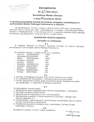 rl Zarządzenie '.i nr /J lsulzots Burmistrza Miasta Sierpca z aniall września 2o13r w sprawie powołania-komisji do liczenia pieniędzy pochodzącyclr z parkomatów Strefy Płatnego Parkowania w sićrpću Na podstawie art' 33 ust. 3 ustawy z dnia B marca 1990 roku o samorządzie gminnym (Dz.U z 2073, poz' 594 *'tekst jednolity) w związku z Uchwałą ńio!r"liustu Sierpca nr 344/XLvI/20t3, z dnia 24 lipca 2OL3 r' W sprawie ustalenia strefy'płatnego parkowania ijej Regulaminu na terenie gminy -miasto Sierpc BURMISTRZ MTASTA SIERPCA Zarządza co następuje: s1 W Urzędzie Miejskim powołuje Komisję ^W -Sierpcu, pochodzących z parkomatów strefy Płatnego Parkowania' do liczenia pieniędzy s2 Na członków Komisji. o której mowa W 51powołuje; t/^-^ti^^ Jz-rĄ^LrvvJr\i\ - '\ol\Jllllo - VV5K Agnieszka - WF TRZASKALSKI - WAG Grzegorz - WO Andrzej - WO Radosław - WIR Zbigniew - SM - SM Grzegorz WAWROWSKI - SM RUTKOWSKA _ Błażej PAWLAK PUSZCZ -_ GosZcZYCKI _ MALUZYŃSKI _ Robert DUDZIŃSKI _ Tomasz cÓnzyŃsn - sM s3 1' Komisja przystępując do pracy, musi liczyć, minimum trzy osoby, 2. W uzasadnionych przypadkach Komisja może liczyć dwió osoby' ' Komendant 3' Termin posiedzenia Komisji ustala Straży Miejskiej lub osoba go zastępująca , w zalezności od biezących potrzeb. 54 Do obowiązków Komisji na Ieży; 1. Sprawdzenie stanu zabezpieczenia (plomb) worka/kasety z pieniędzmi. 2. Komisyjne otwarcie kasety/worka. 3. zliczenie monet znajdujących się w worku/kasecie' 4. Sporządzenie protokołu z przeprowadzonych czynności którego wzór , stanowi załącznik nr 1 5. Przygotowanie i zaplombowanie, opróznionego worka/kasety tak, by mozna było go zamontować w parkomacie. 6' Przekazanie zliczonych pieniędzy wraz z protokołem, do kasy Urzędu N4iejskiego w Sierpcu. ss Zarządzenie wchodzi W zycie z dniem podpisania. ISTRZ Załącznik Nr 7 do Zarządzenia Burmistrza Miasta sierpca Nr PRoToKóŁ Nr..'. ...../...... sM/2o13 z czynnościzliczenia pieniędzy pochodzących z Parkomatu nr...... przy ul w dniu .'..'''.. Komisja w składzie: 2. 3. SPECYFIKACJA GoTÓWKI Wydruk z parkomatu Stan rzeczywisty po zliczeniu Róznica (+/-) Wynosi wartość Uwagi Do protokołu dołączono wydruk z parkomatu z dnia Do kasy UM przekazano kwotę słownie; podpisy członków Komisji 1. ..................... 2. ................ 3. ...''..''''..'..zł.'''.gr ... godz,