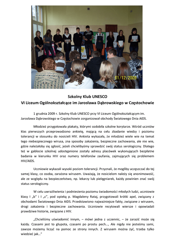 Szkolny Klub UNESCO VI Liceum Ogólnokształcące im Jarosława Dąbrowskiego w Częstochowie 1 grudnia 2009 r. Szkolny Klub UNESCO przy VI Liceum Ogólnokształcącym im. Jarosława Dąbrowskiego w Częstochowie zorganizował obchody Światowego Dnia AIDS. Młodzież przygotowała plakaty, którymi ozdobiła szkolne korytarze. Wśród uczniów klas pierwszych przeprowadzono ankietę, mającą na celu zbadanie wiedzy i poziomu tolerancji w stosunku do nosicieli HIV. Ankieta wykazała, że młodzież wiele wie na temat tego niebezpiecznego wirusa, zna sposoby zakażenia, bezpieczne zachowania, ale nie wie, gdzie należałoby się zgłosić, jeżeli chcielibyśmy sprawdzić swój status serologiczny. Dlatego też w gablocie szkolnej udostępnione zostały adresy placówek wykonujących bezpłatne badania w kierunku HIV oraz numery telefonów zaufania, zajmujących się problemem HIV/AIDS. Uczniowie wykazali wysoki poziom tolerancji. Przyznali, że mogliby uczęszczać do tej samej klasy, co osoba, zarażona wirusem. Uważają, że nosicielom należy się anonimowość, ale ze względu na bezpieczeństwo, np. lekarzy lub pielęgniarek, każdy powinien znać swój status serologiczny. W celu uwrażliwienia i podniesienia poziomu świadomości młodych ludzi, uczniowie klasy I „b” i I „c”, pod opieką p. Magdaleny Rataj, przygotowali krótki apel, związany z obchodami Światowego Dnia AIDS. Przedstawiono najważniejsze fakty, związane z wirusem, drogi zakażenia i bezpieczne zachowania. Uczniowie recytowali wiersze i opowiadali prawdziwe historie, związane z HIV. „Chcieliśmy uświadomić innym, – mówi jedna z uczennic, – że zarazić może się każdy. Czasami jest to głupota, czasami po prostu pech…, Ale nigdy nie jesteśmy sami, zawsze możemy liczyć na pomoc ze strony innych. Z wirusem można żyć, trzeba tylko wiedzieć jak…”