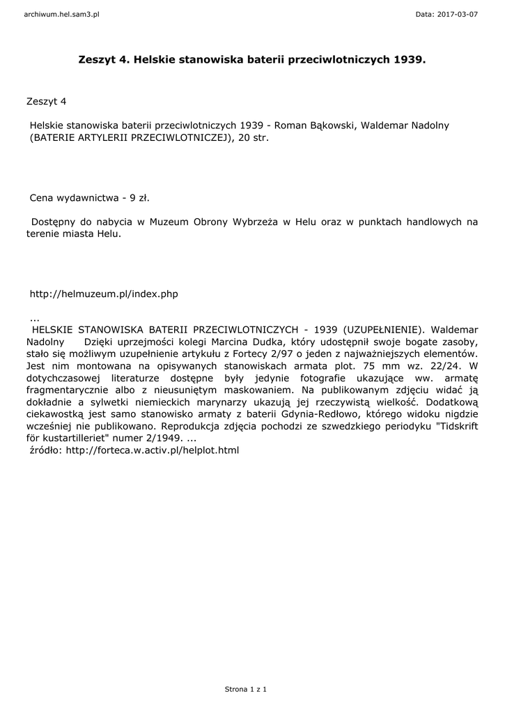 archiwum.hel.sam3.pl Data: 2017-03-07 Zeszyt 4. Helskie stanowiska baterii przeciwlotniczych 1939. Zeszyt 4 Helskie stanowiska baterii przeciwlotniczych 1939 - Roman Bąkowski, Waldemar Nadolny (BATERIE ARTYLERII PRZECIWLOTNICZEJ), 20 str. Cena wydawnictwa - 9 zł. Dostępny do nabycia w Muzeum Obrony Wybrzeża w Helu oraz w punktach handlowych na terenie miasta Helu. http://helmuzeum.pl/index.php ... HELSKIE STANOWISKA BATERII PRZECIWLOTNICZYCH - 1939 (UZUPEŁNIENIE). Waldemar Nadolny Dzięki uprzejmości kolegi Marcina Dudka, który udostępnił swoje bogate zasoby, stało się możliwym uzupełnienie artykułu z Fortecy 2/97 o jeden z najważniejszych elementów. Jest nim montowana na opisywanych stanowiskach armata plot. 75 mm wz. 22/24. W dotychczasowej literaturze dostępne były jedynie fotografie ukazujące ww. armatę fragmentarycznie albo z nieusuniętym maskowaniem. Na publikowanym zdjęciu widać ją dokładnie a sylwetki niemieckich marynarzy ukazują jej rzeczywistą wielkość. Dodatkową ciekawostką jest samo stanowisko armaty z baterii Gdynia-Redłowo, którego widoku nigdzie wcześniej nie publikowano. Reprodukcja zdjęcia pochodzi ze szwedzkiego periodyku "Tidskrift för kustartilleriet" numer 2/1949. ... źródło: http://forteca.w.activ.pl/helplot.html Strona 1 z 1
