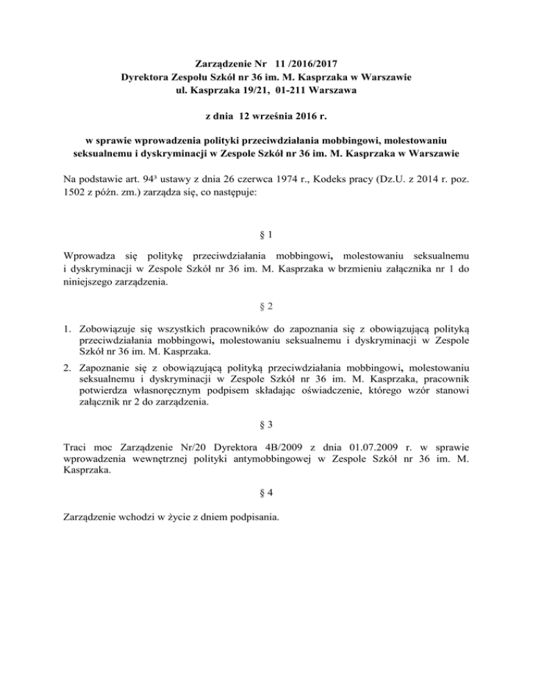 Zarządzenie Nr 11 /2016/2017 Dyrektora Zespołu Szkół nr 36 im. M. Kasprzaka w Warszawie ul. Kasprzaka 19/21, 01-211 Warszawa z dnia 12 września 2016 r. w sprawie wprowadzenia polityki przeciwdziałania mobbingowi, molestowaniu seksualnemu i dyskryminacji w Zespole Szkół nr 36 im. M. Kasprzaka w Warszawie Na podstawie art. 94³ ustawy z dnia 26 czerwca 1974 r., Kodeks pracy (Dz.U. z 2014 r. poz. 1502 z późn. zm.) zarządza się, co następuje: §1 Wprowadza się politykę przeciwdziałania mobbingowi, molestowaniu seksualnemu i dyskryminacji w Zespole Szkół nr 36 im. M. Kasprzaka w brzmieniu załącznika nr 1 do niniejszego zarządzenia. §2 1. Zobowiązuje się wszystkich pracowników do zapoznania się z obowiązującą polityką przeciwdziałania mobbingowi, molestowaniu seksualnemu i dyskryminacji w Zespole Szkół nr 36 im. M. Kasprzaka. 2. Zapoznanie się z obowiązującą polityką przeciwdziałania mobbingowi, molestowaniu seksualnemu i dyskryminacji w Zespole Szkół nr 36 im. M. Kasprzaka, pracownik potwierdza własnoręcznym podpisem składając oświadczenie, którego wzór stanowi załącznik nr 2 do zarządzenia. §3 Traci moc Zarządzenie Nr/20 Dyrektora 4B/2009 z dnia 01.07.2009 r. w sprawie wprowadzenia wewnętrznej polityki antymobbingowej w Zespole Szkół nr 36 im. M. Kasprzaka. §4 Zarządzenie wchodzi w życie z dniem podpisania. Polityka przeciwdziałania mobbingowi, molestowaniu seksualnemu i dyskryminacji w Zespole Szkół nr 36 im. M. Kasprzaka w Warszawie Rozdział I Postanowienia ogólne §1 Polityka przeciwdziałania mobbingowi, molestowaniu seksualnemu i dyskryminacji w Zespole Szkół nr 36 im. M. Kasprzaka ma na celu kształtowanie zasad współżycia społecznego, w tym przeciwdziałania mobbingowi, molestowaniu seksualnemu i dyskryminacji. Istotnym elementem w procesie zapobiegania, przeciwdziałania i rozwiązywania leżących u ich przyczyn problemów jest współdziałanie pracowników z pracodawcą w tym zgłaszanie niepożądanych działań i zachowań noszących znamiona mobbingu, molestowania seksualnego i dyskryminacji. §2 Ilekroć jest mowa o: 1) Komisji rozumie się przez to Komisję ds. rozpatrywania zgłoszeń mobbingu, molestowania seksualnego i dyskryminacji, 2) mobbingu – rozumie się przez to działania lub zachowania dotyczące pracownika lub skierowane przeciwko pracownikowi, polegające na uporczywym i długotrwałym nękaniu lub zastraszaniu pracownika, wywołujące u niego zaniżoną ocenę przydatności zawodowej, powodujące lub mające na celu poniżenie lub ośmieszenie pracownika, izolowanie go lub wyeliminowanie z zespołu współpracowników, 3) molestowaniu seksualnym – należy przez to rozumieć każde niepożądane zachowanie o charakterze seksualnym lub odnoszące się do płci pracownika, którego celem lub skutkiem jest naruszenie godności lub poniżenie albo jego upokorzenie. Na zachowania te mogą się składać fizyczne, werbalne lub pozawerbalne elementy; 4) stronach postępowania – należy przez to rozumieć osobę lub osoby dokonujące zgłoszenia oraz osobę lub osoby wskazane w zgłoszeniu. 5) pracodawcy – rozumie się przez to Zespół Szkół nr 36 im. M. Kasprzaka reprezentowany przez Dyrektora, 6) pracowniku – rozumie się przez to osobę zatrudnioną w Zespole Szkół nr 36 im. M. Kasprzaka, Rozdział II Przeciwdziałanie mobbingowi, molestowaniu seksualnemu i dyskryminacji §3 Pracodawca podejmuje działania mające na celu przeciwdziałanie mobbingowi, molestowaniu seksualnemu i dyskryminacji, polegające w szczególności na: 1) przeszkoleniu pracowników z zakresu przeciwdziałania mobbingowi, molestowaniu seksualnemu i dyskryminacji, 2) przeprowadzaniu badań opinii oraz ankiet wśród pracowników; 3) powoływaniu Komisji ds. rozpatrywania zgłoszeń mobbingu, molestowania seksualnego i dyskryminacji, 4) Kierownik gospodarczy w Zespole Szkół nr 36 im. M. Kasprzaka aktywnie przeciwdziała mobbingowi, molestowaniu seksualnemu i dyskryminacji poprzez podejmowanie działań prewencyjnych, mających na celu zapobieganie, przeciwdziałanie i rozwiązywania leżących u ich przyczyn problemów, 5) zobowiązuje się pracowników do niepodejmowania jakichkolwiek działań i zachowań o znamionach mobbingu, molestowania seksualnego lub dyskryminacji, 6) pracownicy zobowiązani są przestrzegać zasad wynikających z przepisów prawa oraz niniejszej polityki. Rozdział III Zgłoszenie mobbingu, molestowania seksualnego lub dyskryminacji §4 1. Pracownik, który uznał, że został poddany mobbingowi, molestowaniu seksualnemu lub dyskryminacji dokonuje pisemnego zgłoszenia tego faktu do Dyrektora Zespołu Szkół nr 36 im. M. Kasprzaka, zgodnie z niniejszą procedurą. 2. Zgłoszenie powinno zawierać: 1) przedstawienie stanu faktycznego, w szczególności wskazanie działań i zachowań będących zdaniem zgłaszającego mobbingiem, molestowaniem seksualnym lub dyskryminacją oraz okresu, którego te działania lub zachowania dotyczą; 2) wskazanie pracownika lub pracowników, co do których zgłaszający wyraża podejrzenie stosowania mobbingu; molestowania seksualnego lub dyskryminacji, 3) uzasadnienie oraz dowody na poparcie przytoczonych okoliczności, w tym wskazanie świadków; 4) informację, iż w niniejszej sprawie nie toczyło i nie toczy się, postępowanie przed sądem; 5) datę i własnoręczny podpis pracownika. 3. W przypadku, gdy zgłoszenie nie spełnia wymogów formalnych lub nie zawiera dowodów uzasadniających podjęcie postępowania, wzywa się pracownika, który dokonał zgłoszenia, do jego uzupełnienia w terminie 14 dni od dnia doręczenia wezwania, informując, że w przypadku nieuzupełnienia zgłoszenia we wskazanym terminie postępowanie nie będzie prowadzone. 4. Dokonanie zgłoszenia oznacza zgodę pracownika na udział w postępowaniu określonym niniejszą procedurą. 5. Zgłoszenie anonimowe nie podlega rozpatrzeniu. 6. Pracownik, który uznał, że zost