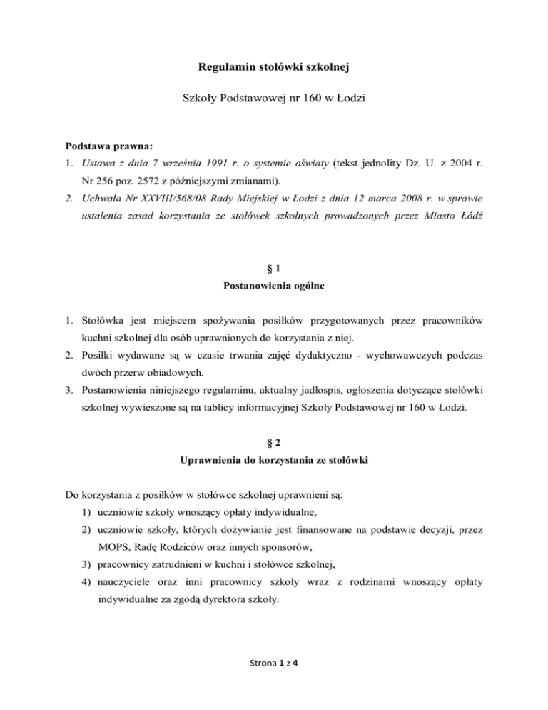 Regulamin stołówki szkolnej Szkoły Podstawowej nr 160 w Łodzi Podstawa prawna: 1. Ustawa z dnia 7 września 1991 r. o systemie oświaty (tekst jednolity Dz. U. z 2004 r. Nr 256 poz. 2572 z późniejszymi zmianami). 2. Uchwała Nr XXVIII/568/08 Rady Miejskiej w Łodzi z dnia 12 marca 2008 r. w sprawie ustalenia zasad korzystania ze stołówek szkolnych prowadzonych przez Miasto Łódź §1 Postanowienia ogólne 1. Stołówka jest miejscem spożywania posiłków przygotowanych przez pracowników kuchni szkolnej dla osób uprawnionych do korzystania z niej. 2. Posiłki wydawane są w czasie trwania zajęć dydaktyczno - wychowawczych podczas dwóch przerw obiadowych. 3. Postanowienia niniejszego regulaminu, aktualny jadłospis, ogłoszenia dotyczące stołówki szkolnej wywieszone są na tablicy informacyjnej Szkoły Podstawowej nr 160 w Łodzi. §2 Uprawnienia do korzystania ze stołówki Do korzystania z posiłków w stołówce szkolnej uprawnieni są: 1) uczniowie szkoły wnoszący opłaty indywidualne, 2) uczniowie szkoły, których dożywianie jest finansowane na podstawie decyzji, przez MOPS, Radę Rodziców oraz innych sponsorów, 3) pracownicy zatrudnieni w kuchni i stołówce szkolnej, 4) nauczyciele oraz inni pracownicy szkoły wraz z rodzinami wnoszący opłaty indywidualne za zgodą dyrektora szkoły. Strona 1 z 4 §3 Ustalanie wysokości opłat za posiłki 1. Ustalone wysokości opłat za posiłki w stołówce szkolnej: 1) opłata za jeden posiłek dla ucznia – 3,00 zł, 2) opłata za jeden posiłek dla innych osób – 4,20 zł. 2. Wysokość opłaty za posiłki w stołówce szkolnej określa dyrektor szkoły w porozumieniu z organem prowadzącym szkołę. 3. Opłaty za korzystanie przez ucznia z posiłków w stołówce szkolnej ustalane są w wysokości kosztów produktów wykorzystanych do przygotowania posiłku. 4. Inne osoby, korzystające z posiłków w stołówce szkolnej za zgodą dyrektora szkoły, ponoszą pełne koszty, uwzględniające koszty wykorzystanych produktów oraz koszty utrzymania stołówki szkolnej, w tym koszty wynagrodzeń i pochodnych pracowników zatrudnionych w stołówce szkolnej. 5. W sytuacjach wzrostu kosztu produktów w trakcie roku szkolnego dopuszcza się możliwość zmiany odpłatności, po poinformowaniu korzystających ze stołówki z miesięcznym wyprzedzeniem. §4 Wnoszenie opłat za posiłki 1. Opłaty za obiady w danym miesiącu przyjmuje Sekretariat szkoły od poniedziałku do piątku w godzinach 8.00 – 16.00. 2. Opłatę wnosi się za cały miesiąc z góry, do ostatniego dnia miesiąca poprzedzającego miesiąc, za który opłata jest wnoszona. Wyjątek stanowi opłata za miesiąc wrzesień i styczeń gdzie opłatę można wnosić do 5 dnia miesiąca. 3. W wyjątkowych sytuacjach istnieje także możliwość wykupienia obiadów w wybrane dni tygodnia. Wykaz wybranych dni wraz z opłatą wnosi się z góry, do ostatniego dnia miesiąca poprzedzającego miesiąc, za który opłata jest wnoszona. Strona 2 z 4 §5 Zwroty za niewykorzystane obiady 1. Nieobecność ucznia lub innej osoby korzystającej ze stołówki szkolnej należy zgłosić, osobiście lub telefonicznie, najpóźniej w dniu nieobecności do godziny 8.00. 2. W przypadku nieobecności w szkole uprawnionego albo rezygnacji z posiłku w danym dniu z innych przyczyn, zwrotowi podlega dzienna opłata wniesiona za posiłek, z wyłączeniem pierwszego dnia nieobecności lub dnia, w którym nastąpiło zgłoszenie rezygnacji z posiłku 3. W takiej sytuacji opłata uiszczona z góry za niewykorzystane posiłki w danym miesiącu zostanie zwrócona w postaci pomniejszenia o jej wysokość opłaty za posiłki w kolejnym miesiącu. 4. Rozliczenia i zwroty opłat za niewykorzystane posiłki w miesiącu czerwcu dokonuje się najpóźniej do 30 czerwca danego roku. §6 Zasady zachowania na stołówce 1. Osobom, które nie korzystają ze stołówki szkolnej, zakazuje się wchodzenia do niej. 2. Uczeń zobowiązany jest przed posiłkiem umyć ręce i przestrzegać regulaminu stołówki dotyczącego przepisów BHP. 3. W stołówce obowiązuje cisza. 4. Podczas spożywania posiłków obowiązują zasady kulturalnego zachowania. 5. Naczynia po spożyciu posiłku powinny być odstawione w wyznaczonym miejscu. 6. Za szkody spowodowane w stołówce odpowiada uczeń, a finansowo jego rodzice. 7. W przypadku nierespektowania wyżej wymienionych zasad zachowania poinformowany zostanie wychowawca klasy i za jego pośrednictwem rodzice ucznia. 8. Za rażące naruszenie regulaminu stołówki uczeń może zostać skreślony z listy korzystających z obiadów w stołówce szkolnej. Strona 3 z 4 §7 Postanowienia końcowe 1. O wszystkich sprawach związanych z organizacją pracy stołówki decyduje dyrektor Szkoły Podstawowej nr 160 w Łodzi. 2. Wszelkich zmian w niniejszym regulaminie dokonuje dyrektor w postaci pisemnego aneksu. 3. Regulamin wchodzi w życie z dniem 01.09.2012 r. Strona 4 z 4
