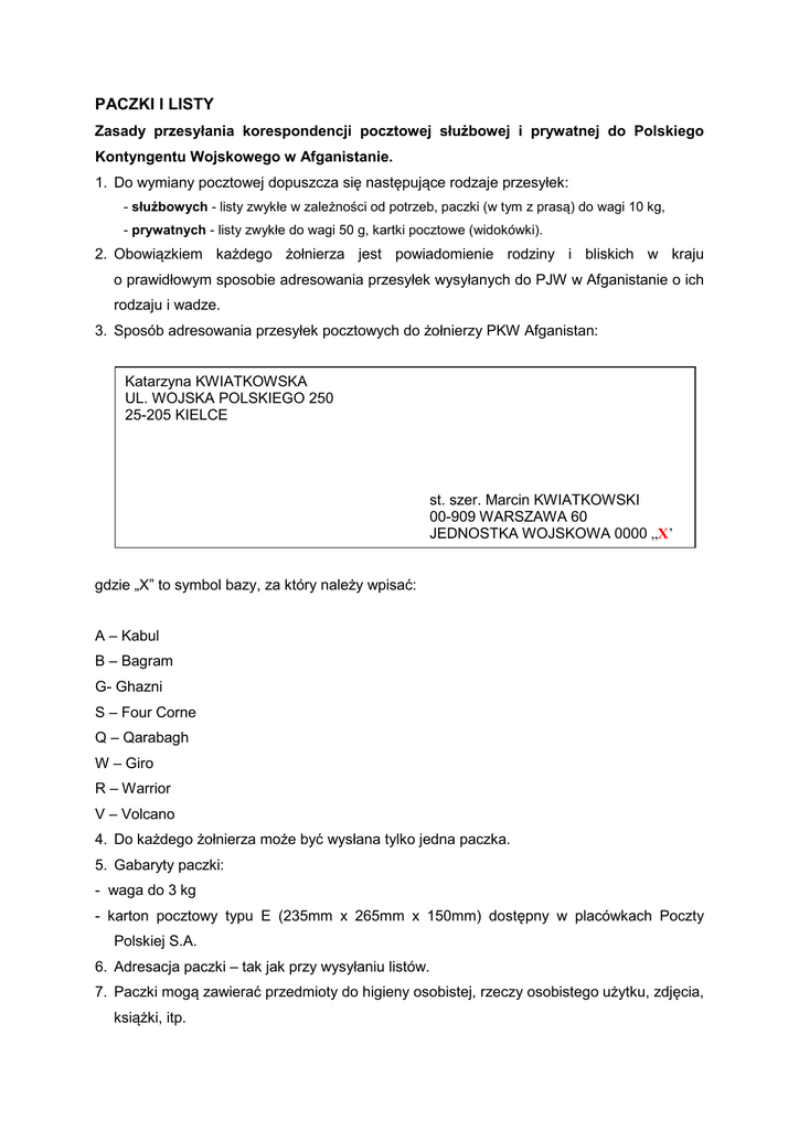 PACZKI I LISTY Zasady przesyłania korespondencji pocztowej służbowej i prywatnej do Polskiego Kontyngentu Wojskowego w Afganistanie. 1. Do wymiany pocztowej dopuszcza się następujące rodzaje przesyłek: - służbowych - listy zwykłe w zależności od potrzeb, paczki (w tym z prasą) do wagi 10 kg, - prywatnych - listy zwykłe do wagi 50 g, kartki pocztowe (widokówki). 2. Obowiązkiem każdego żołnierza jest powiadomienie rodziny i bliskich w kraju o prawidłowym sposobie adresowania przesyłek wysyłanych do PJW w Afganistanie o ich rodzaju i wadze. 3. Sposób adresowania przesyłek pocztowych do żołnierzy PKW Afganistan: Katarzyna KWIATKOWSKA UL. WOJSKA POLSKIEGO 250 25-205 KIELCE st. szer. Marcin KWIATKOWSKI 00-909 WARSZAWA 60 JEDNOSTKA WOJSKOWA 0000 „X’ gdzie „X” to symbol bazy, za który należy wpisać: A – Kabul B – Bagram G- Ghazni S – Four Corne Q – Qarabagh W – Giro R – Warrior V – Volcano 4. Do każdego żołnierza może być wysłana tylko jedna paczka. 5. Gabaryty paczki: - waga do 3 kg - karton pocztowy typu E (235mm x 265mm x 150mm) dostępny w placówkach Poczty Polskiej S.A. 6. Adresacja paczki – tak jak przy wysyłaniu listów. 7. Paczki mogą zawierać przedmioty do higieny osobistej, rzeczy osobistego użytku, zdjęcia, książki, itp. 8. Ze względu na warunki klimatyczne panujące w rejonie wykonywania zadań przez żołnierzy kontyngentu zabrania się przesyłania środków żywnościowych. 9. Zabrania się przesyłanie pod groźbą odpowiedzialności karno-administracyjnej przedmiotów, które są niebezpieczne ze względu na swoje właściwości fizyczne lub chemiczne w tym: - alkoholu - wszelkiego rodzaju broni palnej - materiałów wybuchowych - amunicji - narkotyków - materiałów łatwopalnych - substancji żrących - leków - produktów w opakowaniach szklanych i łatwo tłukących się - waluty i kosztowności - dokumentów i materiałów niejawnych - dóbr kultury prawnie chronionych 10 .Wszystkie przesyłki przed wysłaniem zostaną poddane kontroli. Przesyłki niespełniające ww. warunków będą zwracane nadawcom.
