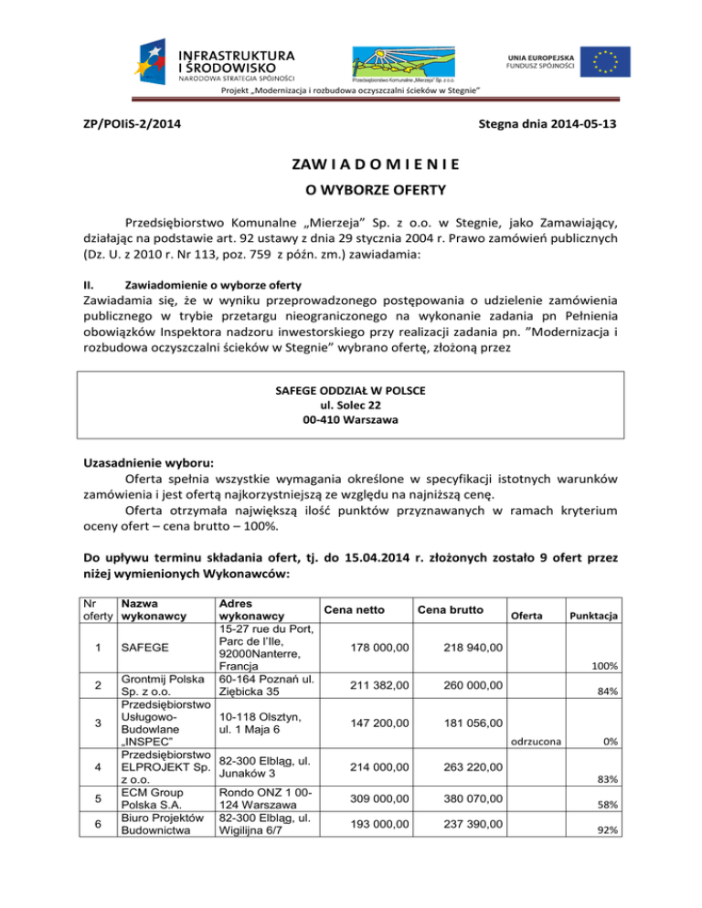 Projekt „Modernizacja i rozbudowa oczyszczalni ścieków w Stegnie” ZP/POIiS-2/2014 Stegna dnia 2014-05-13 ZAW I A D O M I E N I E O WYBORZE OFERTY Przedsiębiorstwo Komunalne „Mierzeja” Sp. z o.o. w Stegnie, jako Zamawiający, działając na podstawie art. 92 ustawy z dnia 29 stycznia 2004 r. Prawo zamówień publicznych (Dz. U. z 2010 r. Nr 113, poz. 759 z późn. zm.) zawiadamia: II. Zawiadomienie o wyborze oferty Zawiadamia się, że w wyniku przeprowadzonego postępowania o udzielenie zamówienia publicznego w trybie przetargu nieograniczonego na wykonanie zadania pn Pełnienia obowiązków Inspektora nadzoru inwestorskiego przy realizacji zadania pn. ”Modernizacja i rozbudowa oczyszczalni ścieków w Stegnie” wybrano ofertę, złożoną przez SAFEGE ODDZIAŁ W POLSCE ul. Solec 22 00-410 Warszawa Uzasadnienie wyboru: Oferta spełnia wszystkie wymagania określone w specyfikacji istotnych warunków zamówienia i jest ofertą najkorzystniejszą ze względu na najniższą cenę. Oferta otrzymała największą ilość punktów przyznawanych w ramach kryterium oceny ofert – cena brutto – 100%. Do upływu terminu składania ofert, tj. do 15.04.2014 r. złożonych zostało 9 ofert przez niżej wymienionych Wykonawców: Nazwa Nr oferty wykonawcy 1 2 3 4 5 6 SAFEGE Grontmij Polska Sp. z o.o. Przedsiębiorstwo UsługowoBudowlane „INSPEC” Przedsiębiorstwo ELPROJEKT Sp. z o.o. ECM Group Polska S.A. Biuro Projektów Budownictwa Adres Cena netto Cena brutto Oferta wykonawcy 15-27 rue du Port, Parc de l’Ile, 178 000,00 218 940,00 92000Nanterre, Francja 60-164 Poznań ul. 211 382,00 260 000,00 Ziębicka 35 10-118 Olsztyn, ul. 1 Maja 6 147 200,00 Rondo ONZ 1 00124 Warszawa 82-300 Elbląg, ul. Wigilijna 6/7 214 000,00 100% 84% 181 056,00 odrzucona 82-300 Elbląg, ul. Junaków 3 Punktacja 0% 263 220,00 83% 309 000,00 380 070,00 58% 193 000,00 237 390,00 92% Projekt „Modernizacja i rozbudowa oczyszczalni ścieków w Stegnie” Komunalnego Sp. z o.o. 7 8 9 II. Polski Rejestr Statków S.A. Al. Gen. Józefa Hallera 126, 80416 Gdańsk Przedsiębiorstwo Projektowo82-440 Dzierzgoń, Usługowe ul. Kajki 4 MARKUB 83-682 Henryk Łowicki Rotmanka, ul. Sosnowa 32 355 000,00 436 650,00 50% 197 000,00 242 310,00 90% 123 800,00 152 274,00 odrzucona 0% Zawiadomienie o odrzuceniu oferty W toku postępowania przetargowego złożono dziewięć ofert, dwie oferty zostały odrzucone. 1. Henryk Łowicki , ul. Sosnowa 32 , 83-010 Rotmanka, podlega odrzuceniu zgodnie z art. 81 ust 1 pkt 4 gdyż zawiera rażąco niską cenę w stosunku do przedmiotu zamówienia. 2. PRZEDSIĘBIORSTWO USŁUGOWO- BUDOWLANE ‘INSPEC’ Sp. z o.o , ul. 1 MAJA 6, 10-118 Olsztyn podlega odrzuceniu zgodnie z art. 81 ust 1 pkt 4 gdyż zawiera rażąco niska cenę w stosunku do przedmiotu zamówienia, jak również na podstawie z art. 81 ust 1 pkt 2 gdyż jej treść nie odpowiada treści specyfikacji istotnych warunków zamówienia. Uzasadnienie odrzucenia oferty 1. Henryk Łowicki , ul. Sosnowa 32 , 83-010 Rotmanka, podlega odrzuceniu zgodnie z art. 81 ust 1 pkt 4 gdyż zawiera rażąco niska cenę w stosunku do przedmiotu zamówienia . Zamawiający, wezwał Wykonawcę ( działając na podstawie art. 90 ust.1 ustawy Prawo zamówień publicznych), do złożenia wyjaśnień, dotyczących elementów oferty mających wpływ na wysokość ceny, w celu ustalenia, czy oferta zawiera rażąco niską cenę w stosunku do przedmiotu zamówienia. Wykonawca w swoim piśmie z dnia 07 maja 2014r. potwierdził, że nie skalkulował kosztów inspektora nadzoru robót sanitarnych i wniósł o wycofanie lub odrzucenie oferty. 2. PRZEDSIĘBIORSTWO USŁUGOWO- BUDOWLANE ‘INSPEC’ SP.Z O.O. , UL 1 MAJA 6, 10-118 OLSZTYN podlega odrzuceniu zgodnie z art. 81 ust 1 pkt 4 gdyż zawiera rażąco niska cenę w stosunku do przedmiotu zamówienia, jak również na podstawie z art. 81 ust 1 pkt 2 gdyż jej treść nie odpowiada treści specyfikacji istotnych warunków zamówienia. Zamawiający wezwał wykonawcę (działając na podstawie art. 87 ust.1 ustawy Prawo zamówień publicznych) do złożenia wyjaśnień do treści oferty. Zamawiający, wezwał także ( działając na podstawie art. 90 ust.1 ustawy Prawo zamówień publicznych) , do złożenia wyjaśnień, dotyczących elementów oferty mających wpływ na wysokość ceny, w celu ustalenia, czy oferta zawiera rażąco niską cenę w stosunku do przedmiotu zamówienia. Wykonawca w terminie oznaczonym przez Zamawiającego złożył wyjaśnienia do treści oferty. Wykonawca w wyjaśnieniu stwierdza że w załączniku nr 8 do SIWZ poz. Dotycząca inspektora nadzoru w branży konstrukcyjno-budowlanej + drogowej , w kolumnie roboty nastąpił błąd pisarski winno być 168 osobodni zamiast 120 co daje łącznie 192 dni. Harmonogram czasu pracy poszczególnych osób personelu kluczowego z podziałem na poszczególne fazy realizacji umowy (załącznik nr 8) jest integralną częścią oferty gdyż prezentuje zaangażowanie __________________________________________________________________________ Projekt „Modernizacja i rozbudowa oczyszczalni ścieków w Stegnie” Wykonawcy w fazie przygotowawczej, fazie robót budowlanych oraz rozliczania robót. Zatem Zamawiający, w świetle art. 87 ust 1 żądał wyjaśnień dotyczących treści złożonej oferty w zakresie Harmonogramu. Zgodnie z ustawą o zamówieniach publicznych art. 87 ust 1 niedopuszczalne jest prowadzenie między zamawiającym a wykonawcą negocjacji dotyczących złożonej oferty oraz dokonywanie jakiejkolwiek zmiany oferty. Treść wyjaśnienia wykonawcy, prowadzi do zmiany treści oferty w zakresie harmonogramu. Zmiana taka jest niedopuszczalna w świetle ustawy Pzp. Wykonawca, w ramach wyjaśnień w przedmiocie rażąco niskiej ceny, przedłożył kalkulację ceny ofertowej. Wykonawca wskazuje przy wyliczaniu kosztów świadczenia usługi –min. koszty dojazdu. Wykonawca wziął pod uwagę 290 km x stawka 0,8358 zł/km x 3 x 16 miesi