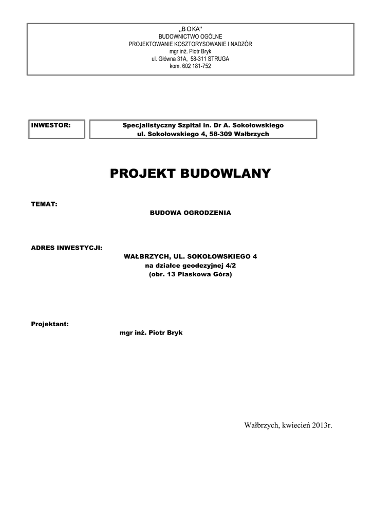 ,,BOKA'' BUDOWNICTWO OGÓLNE PROJEKTOWANIE KOSZTORYSOWANIE I NADZÓR mgr inż. Piotr Bryk ul. Główna 31A, 58-311 STRUGA kom. 602 181-752 INWESTOR: Specjalistyczny Szpital in. Dr A. Sokołowskiego ul. Sokołowskiego 4, 58-309 Wałbrzych PROJEKT BUDOWLANY TEMAT: ADRES INWESTYCJI: Projektant: BUDOWA OGRODZENIA WAŁBRZYCH, UL. SOKOŁOWSKIEGO 4 na działce geodezyjnej 4/2 (obr. 13 Piaskowa Góra) mgr inż. Piotr Bryk Wałbrzych, kwiecień 2013r. SPIS TREŚCI I. OPIS TECHNICZNY 1. DANE EWIDENCYJNE - LOKALIZACJA 2. PRZEDMIOT OPRACOWANIA 3. CHARAKTERYSTYKA ISTNIEJĄCYCH ROZWIĄZAŃ KONSTRUKCYJNYCH I BUDOWLANYCH 4. 4.1. Fundamenty 4.2. Konstrukcja ogrodzenia 4.3. Ramy stalowe 4.4. Bramy INFORMACJA DOTYCZĄCA PLANU BEZPIECZEŃSTWA I OCHRONY ZDROWIA 2 O P I S TECHNICZNY 5. DANE EWIDENCYJNE - LOKALIZACJA Obiekt zlokalizowany będzie na w Wałbrzychu przy ul. Sokołowskiego 4. Działka geodezyjna nr 4/2 w obrębie 13 Piasokwa Góra 6. PRZEDMIOT OPRACOWANIA Przedmiotem opracowania jest wykonanie projektu ogrodzenia z cegły klinkierowej Przy Specjalistycznym Szpitalu im. dr. A. Sokołowskiego. PODSTAWA OPRACOWANIA • • 7. Podstawą opracowania jest zlecenie inwestora, Obowiązujące Polskie Normy i przepisy. CHARAKTERYSTYKA ISTNIEJĄCYCH ROZWIĄZAŃ KONSTRUKCYJNYCH I BUDOWLANYCH. Fundamenty Ogrodzenie należy posadowić na ławach (cokołach) żelbetowych o wymiarach 22x100cm (pod słupkami ogrodzenia-36x36cm. Fundamenty zaprojektowano z betonu klasy B-15. Zbrojenie podłużne fundamentów wykonać z 4 prętów fi 10 oraz strzemion fi 6 co30cm. Fundamenty izolować materiałami bitumicznymi na zimno-izolacja pionowa. Izolację poziomą wykonać z dwóch warstw papy na lepiku na zimno. W trakcie betonowania należy zabetonować wytyki do słupów z prętów 4 x fi10- do słupów. Zaprojektowane fundamenty należy zweryfikować pomiarami w terenie w zakresie rzutu w planie jak też lokalizacji (wytyczenie ogrodzenia powierzyć geodecie –wytyczenie granicy działki). Pamiętać należy aby ogrodzenie w całości znajdowało się w działce inwestora. Ogrodzenie należy dylatować w odcinkach około ~20m. Pamiętać należy również o ukształtowaniu terenu (niewielki spadek w kierunku północnym-stosować równomierne schodkowanie na całej długości ogrodzenia-uskok fundamentu na linii słupa i cokołu. Konstrukcja ogrodzenia 3 Konstrukcję przyjęto wykonać jako murowaną z cegły klinkierowej (materiały przyjęto z katalogu firmy CRH KLINKIER- przyjęte materiały należy traktować jako poglądowe – stosować można materiały innych producentów). Cegłę murować zaprawami przeznaczonymi do klinkieru nie powodującymi wykwitów węglanowych- np. TERCA KLINKIER. Słupy murować o wymiarze 38x38cm, wokół wypuszczonego z fundamentu zbrojenia (4ø10 i strzemię ø6 co 20cm). W trakcie murowania ogrodzenia zamontować płaskowniki do montażu ramek stalowych. Po wymurowaniu słupów zabetonować trzpień żelbetowy (beton B-15). Górną krawędź cokołu wykonać z kształtek cokołowych typ . DD (D1). Zwieńczenie słupa wykonać z kształtek –czapa na słup 38x38cm. Rysunki kształtek w załączeniu. DOBÓR KOLORYSTYKI CEGIEŁ POZOSTAWIA SIĘ DLA INWESTORA. Wskazane było by uwzględnienie kolorystyki istniejącej portierni licowanej płytkami klinkierowymi. Ramy stalowe Ramy stalowe zaprojektowano z kątowników stalowych 50x30x5mm wypełnionych siatką. Zamiennie stosować można inne rozwiązania –np. prętowe kraty kute itp. Zabezpieczenie antykorozyjne –ocynk ogniowy +powłoka malarska. Bramy W opracowaniu przyjęto typowe bramy systemowe firmy LEGIPOL. 1. Brama przesuwna o wym .4,00x1,60m, 2. Brama przesuwna o wym. 5,00x1,60m, 3. Brama rozwieralna o wym. 6,00*1,60m, 4. Furtka dwuskrzydłowa o wym. 3,24*1,08m. 8. Informacja dotycząca Bezpieczeństwa i Ochrony Zdrowia Informuję że inwestycja powyższa nie wymaga sporządzenia Planu Bezpieczeństwa i Ochrony Zdrowia. wykonał: mgr inż. Piotr Bryk 4