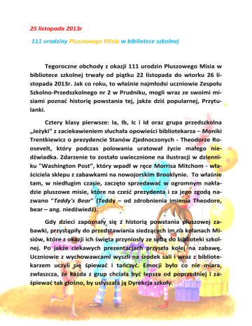 25 listopada 2013r 111 urodziny Pluszowego Misia w bibliotece szkolnej Tegoroczne obchody z okazji 111 urodzin Pluszowego Misia w bibliotece szkolnej trwały od piątku 22 listopada do wtorku 26 listopada 2013r. Jak co roku, to właśnie najmłodsi uczniowie Zespołu Szkolno-Przedszkolnego nr 2 w Prudniku, mogli wraz ze swoimi misiami poznać historię powstania tej, jakże dziś popularnej, Przytulanki. Cztery klasy pierwsze: Ia, Ib, Ic i Id oraz grupa przedszkolna „Jeżyki” z zaciekawieniem słuchała opowieści bibliotekarza – Moniki Trentkiewicz o prezydencie Stanów Zjednoczonych - Theodorze Roosevelt, który podczas polowania uratował życie małego niedźwiadka. Zdarzenie to zostało uwiecznione na ilustracji w dzienniku "Washington Post”, który wpadł w ręce Morrisa Mitchom - właściciela sklepu z zabawkami na nowojorskim Brooklynie. To właśnie tam, w niedługim czasie, zaczęto sprzedawać w ogromnym nakładzie pluszowe misie, które na cześć prezydenta i za jego zgodą nazwano "Teddy's Bear" (Teddy – od zdrobnienia imienia Theodore, bear – ang. niedźwiedź). Gdy dzieci zapoznały się z historią powstania pluszowej zabawki, przystąpiły do przedstawiania siedzących im na kolanach Misiów, które z okazji ich święta przyniosły ze sobą do biblioteki szkolnej. Po jakże ciekawych prezentacjach przyszła kolej na zabawę. Uczniowie z wychowawcami wyszli na środek sali i wraz z bibliotekarzem uczyli się śpiewać i tańczyć. Emocji było co nie miara, zwłaszcza, że każda z grup chciała być lepsza od poprzedniej i zaśpiewać tak głośno, by usłyszała ją Dyrekcja szkoły. Gdy towarzyszące dzieciom podczas zabawy emocje zostały już ostudzone, przyszła pora na odczytanie wiersza Czesława Janczarskiego pt. „Naprawimy misia”. Uczniowie uważnie słuchali o czym jest wiersz, a następnie sami udzielali rad, jak należy dbać o pluszaki. Każde dziecko sprawdziło, czy jego miś nie wymaga zszycia, a następnie szepnęło mu coś miłego do uszka. Podsumowaniem urodzinowego spotkania w bibliotece z misiem, był quiz dotyczący znajomości misiów i niedźwiedzi. Bibliotekarz przygotował zagadki słowne i muzyczne, które wzbudziły w dzieciach jeszcze więcej emocji. Za każdą prawidłową odpowiedź uczestnik konkursu dostał nagrodę w postaci kolorowanki z zagadkowym misiem, lub order przyjaciela misia, przygotowany wcześniej przez starsze uczennice na zajęciach koła bibliotecznego. W ramach podziękowania uczniowie klasy I b przynieśli do biblioteki pięknie pokolorowane rysunki misiów. Prace te można podziwiać na gazetce, tuż obok biblioteki. Serdecznie dziękuję wszystkim dzieciom oraz ich wychowawcom za wielkie zaangażowanie! Monika Trentkiewicz