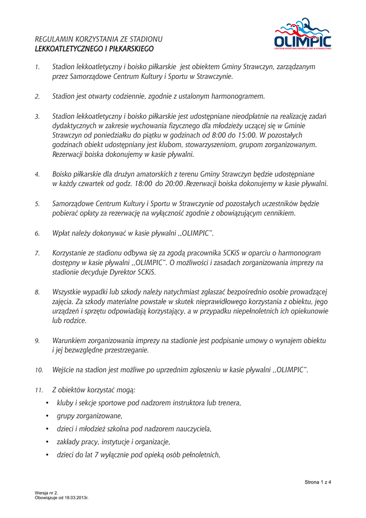 REGULAMIN KORZYSTANIA ZE STADIONU LEKKOATLETYCZNEGO I PIŁKARSKIEGO 1. Stadion lekkoatletyczny i boisko piłkarskie jest obiektem Gminy Strawczyn, zarządzanym przez Samorządowe Centrum Kultury i Sportu w Strawczynie. 2. Stadion jest otwarty codziennie, zgodnie z ustalonym harmonogramem. 3. Stadion lekkoatletyczny i boisko piłkarskie jest udostępniane nieodpłatnie na realizację zadań dydaktycznych w zakresie wychowania fizycznego dla młodzieży uczącej się w Gminie Strawczyn od poniedziałku do piątku w godzinach od 8:00 do 15:00. W pozostałych godzinach obiekt udostępniany jest klubom, stowarzyszeniom, grupom zorganizowanym. Rezerwacji boiska dokonujemy w kasie pływalni. 4. Boisko piłkarskie dla drużyn amatorskich z terenu Gminy Strawczyn będzie udostępniane w każdy czwartek od godz. 18:00 do 20:00 .Rezerwacji boiska dokonujemy w kasie pływalni. 5. Samorządowe Centrum Kultury i Sportu w Strawczynie od pozostałych uczestników będzie pobierać opłaty za rezerwację na wyłączność zgodnie z obowiązującym cennikiem. 6. Wpłat należy dokonywać w kasie pływalni ,,OLIMPIC”. 7. Korzystanie ze stadionu odbywa się za zgodą pracownika SCKiS w oparciu o harmonogram dostępny w kasie pływalni ,,OLIMPIC”. O możliwości i zasadach zorganizowania imprezy na stadionie decyduje Dyrektor SCKiS. 8. Wszystkie wypadki lub szkody należy natychmiast zgłaszać bezpośrednio osobie prowadzącej zajęcia. Za szkody materialne powstałe w skutek nieprawidłowego korzystania z obiektu, jego urządzeń i sprzętu odpowiadają korzystający, a w przypadku niepełnoletnich ich opiekunowie lub rodzice. 9. Warunkiem zorganizowania imprezy na stadionie jest podpisanie umowy o wynajem obiektu i jej bezwzględne przestrzeganie. 10. Wejście na stadion jest możliwe po uprzednim zgłoszeniu w kasie pływalni ,,OLIMPIC”. 11. Z obiektów korzystać mogą: • kluby i sekcje sportowe pod nadzorem instruktora lub trenera, • grupy zorganizowane, • dzieci i młodzież szkolna pod nadzorem nauczyciela, • zakłady pracy, instytucje i organizacje, • dzieci do lat 7 wyłącznie pod opieką osób pełnoletnich, Strona 1 z 4 Wersja nr 2. Obowiązuje od 18.03.2013r. REGULAMIN KORZYSTANIA ZE STADIONU LEKKOATLETYCZNEGO I PIŁKARSKIEGO • osoby uczestniczące oraz kibice, wyłącznie podczas organizowanych imprez sportowych z udziałem publiczności. Na stadionie obowiązuje zakaz wnoszenia: 12. • wnoszenia przedmiotów pirotechnicznych, broni, kijów, pałek, kamieni, substancji żrących, farb, pojemników pod ciśnieniem, opakowań szklanych, • butelek i innych pojemników wykonanych ze szkła lub innego pękającego, szczególnie twardego materiału, • twardych przedmiotów o dużej objętości (deski, stołki, plansze, itp.), • fajerwerków i innych przedmiotów pirotechnicznych, • drzewców do flag i transparentów, • instrumentów z napędem mechanicznym do wytwarzania hałasów, • napojów alkoholowych, narkotyków i innych używek ograniczających świadomość i sprawność człowieka, Ze stadionu nie mogą korzystać: 13. • osoby z przeciwwskazaniem lekarskim. Osoby korzystające ze stadionu zobowiązane są do: 14. • korzystania z właściwego obuwia sportowego. • przestrzegania zasad bezpieczeństwa przy korzystaniu z przyrządów sportowych znajdujących się na wyposażeniu stadionu, • utrzymania czystości i porządku na terenie stadionu, • podporządkowania się poleceniom osób prowadzących zajęcia oraz pracowników. Korzystającym ze stadionu zabrania się: 15. • używania obuwia piłkarskiego (na bieżni lekkoatletycznej), • wprowadzania i użytkowania sprzętu innego niż zgodnego z przeznaczeniem stadionu np. rower, motorower, deskorolka, rolki itp. • niszczenia urządzeń sportowych i płyty obiektu, • palenia tytoniu, spożywania alkoholu, żucia gumy, • przeszkadzania w zajęciach, • zakłócania porządku i używania słów wulgarnych, • wprowadzania zwierząt, • wchodzenia lub przechodzenia przez budowle i urządzenia nieprzeznaczone do Strona 2 z 4 Wersja nr 2. Obowiązuje od 18.03.2013r. REGULAMIN KORZYSTANIA ZE STADIONU LEKKOATLETYCZNEGO I PIŁKARSKIEGO powszechnego użytku, szczególnie fasady, płoty, mury, ogrodzenia boisk i stadionu, zamknięte bramy, urządzenia oświetleniowe, drzewa, maszty, reklamy oraz dachy i inne, • wchodzenia na obszary, które nie są dopuszczone dla widzów obiektu: pomieszczenia wewnętrzne, pomieszczenia służbowe, itp. • używania na terenie stadionu czapek kominiarek i innych akcesoriów utrudniających identyfikację osoby, • rzucania wszelkimi przedmiotami, • rozniecania ognia, zapalania wszelkich wytworów pirotechnicznych, • wszelkiego handlu, rozdawania druków, ulotek i przeprowadzania zbiórek pieniężnych i rzeczowych - bez zgody administratora, • pisania na budowlach, urządzeniach lub drogach, ich malowania i oklejania, • umieszczania wszelkich reklam bez zgody administratora, • załatwiania potrzeb fizjologicznych poza toaletami i zaśmiecania stadionu. 16. W czasie zawodów /zajęć/ organizator jest zobowiązany do przestrzegania obowiązujących przepisów oraz regulaminu i jest odpowiedzialny za zapewnienie bezpieczeństwa korzystającym ze stadionu. 17. Szczegółowy sposób zachowania się na imprezach określają organizatorzy, z uwzględnieniem regulaminu stadionu, ustawy o bezpieczeństwie imprez masowych i przepisów przeciwpożarowych. 18. Za grupy trenujące na stadionie pełną odpowiedzialność ponoszą ich opiekunowie /trenerzy, instruktorzy/, zarówno w zakresie wyrządzonych szkód materialnych jak i wszelkich nieszczęśliwych wypadków swoich podopiecznych. 19. Prowadzący zajęcia odpowiada za stan czystości i porządek w szatniach i pomieszczeniach sanitarnych po każdych zajęciach. 20. Osoby niszczące sprzęt lub urządzenia ponoszą odpowiedzialność materialną za wyrządzone szkody. 21. Pracownicy SCKiS mogą kontrolować ws