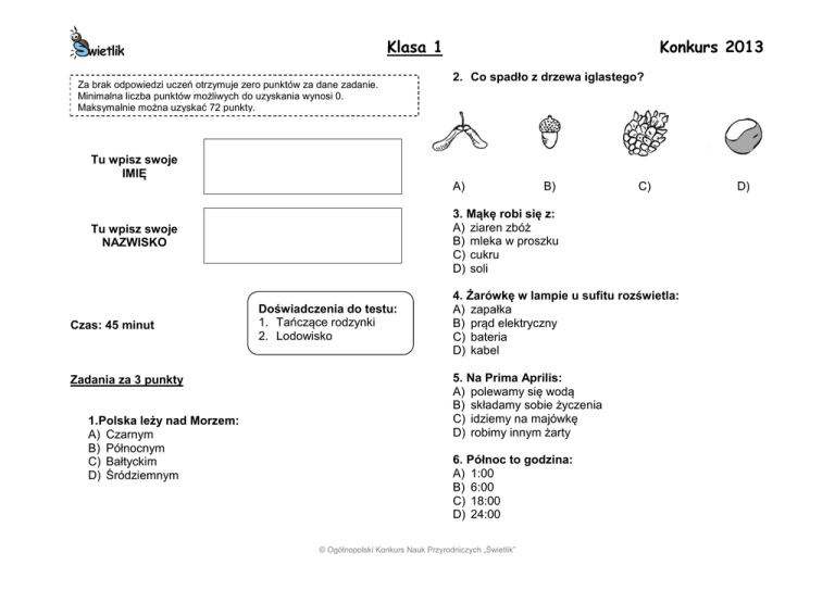 Klasa 1 Za brak odpowiedzi uczeń otrzymuje zero punktów za dane zadanie. Minimalna liczba punktów możliwych do uzyskania wynosi 0. Maksymalnie można uzyskać 72 punkty. Konkurs 2013 2. Co spadło z drzewa iglastego? Tu wpisz swoje IMIĘ A) Zadania za 3 punkty 1.Polska leży nad Morzem: A) Czarnym B) Północnym C) Bałtyckim D) Śródziemnym C) 3. Mąkę robi się z: A) ziaren zbóż B) mleka w proszku C) cukru D) soli Tu wpisz swoje NAZWISKO Czas: 45 minut B) Doświadczenia do testu: 1. Tańczące rodzynki 2. Lodowisko 4. Żarówkę w lampie u sufitu rozświetla: A) zapałka B) prąd elektryczny C) bateria D) kabel 5. Na Prima Aprilis: A) polewamy się wodą B) składamy sobie życzenia C) idziemy na majówkę D) robimy innym żarty 6. Północ to godzina: A) 1:00 B) 6:00 C) 18:00 D) 24:00 © Ogólnopolski Konkurs Nauk Przyrodniczych „Świetlik” D) Klasa 1 Konkurs 2013 11. Które ślady mogła zostawić sarna? Zadania za 4 punkty 7. Gwiazda Polarna wskazuje: A) północ B) południe C) wschód D) zachód A) B) C) D) 12. W wodzie nie można rozpuścić: A) mleka B) soli C) cukru D) oleju 8. Które zwierzę buduje sieci? Zadania za 5 punktów A) B) C) D) 13. Postaw znak X obok każdego fałszywego zdania: 9.Na złom nie można oddać: A) puszki aluminiowej po napoju B) plastikowych zakrętek od butelek C) zepsutych łyżeczek stalowych D) drutu Wakacje są w lipcu i sierpniu. Rzodkiewki rosną na drzewach. Natka pietruszki jest jadalna. Mrówki są owadami. 10. Gdy uderza piorun: A) najpierw jest błysk, a potem grzmot B) najpierw jest grzmot, a potem błysk C) grzmot i błysk są zawsze w tej samej chwili D) błyska się, ale nigdy nie grzmi Ile zdań jest fałszywych? A) 1 B) 2 C) 3 D) 4 © Ogólnopolski Konkurs Nauk Przyrodniczych „Świetlik” Klasa 1 14. Marysia usłyszała w telewizji taką prognozę pogody: „Temperatura spadła 2 stopnie poniżej zera. Spodziewane są zawieje i zamiecie”. Konkurs 2013 18. Rodzynki w napoju gazowanym: A) tam i z powrotem wypływają do góry i opadają na dno B) raz wypływają do góry i już nie opadają na dno C) opadają na dno i nie wypływają do góry D) rozpuszczają się po kilku minutach Czego Marysia może się spodziewać? A) opadów deszczu i silnego wiatru B) silnego, suchego wiatru bez opadów C) opadów śniegu i silnego wiatru D) burzy piaskowej 15. Zamiast kropek wstaw słowo pasujące do zdania : „……………… zwykle śpi w ciągu dnia, a budzi się nocą.” A) Mysz B) Czarny kot C) Mrówka D) Nietoperz 16. Wszystkie przedmioty ciągnie ku ziemi siła: A) grawitacji B) tarcia C) magnetyczna D) oporu 17. Zaśnieżone chodniki posypuje się piaskiem, żeby: A) roztopić śnieg B) zrobić ze śniegu lód C) zwiększyć tarcie D) zmniejszyć tarcie © Ogólnopolski Konkurs Nauk Przyrodniczych „Świetlik”