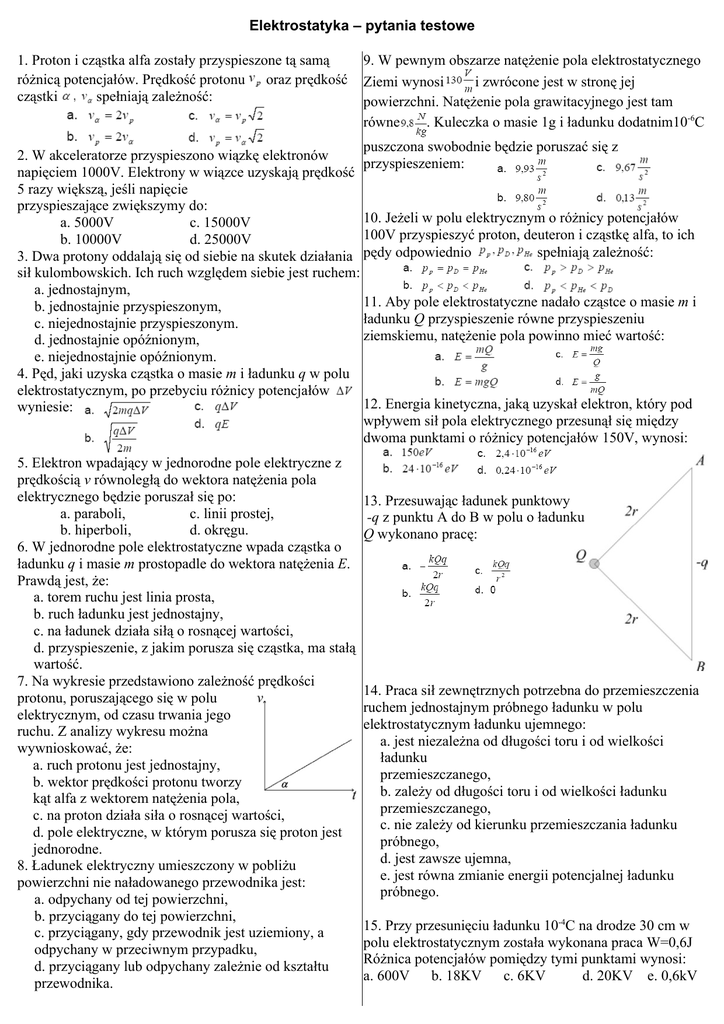 Elektrostatyka – pytania testowe 1. Proton i cząstka alfa zostały przyspieszone tą samą różnicą potencjałów. Prędkość protonu oraz prędkość cząstki spełniają zależność: 9. W pewnym obszarze natężenie pola elektrostatycznego Ziemi wynosi i zwrócone jest w stronę jej powierzchni. Natężenie pola grawitacyjnego jest tam równe . Kuleczka o masie 1g i ładunku dodatnim10-6C puszczona swobodnie będzie poruszać się z 2. W akceleratorze przyspieszono wiązkę elektronów przyspieszeniem: napięciem 1000V. Elektrony w wiązce uzyskają prędkość 5 razy większą, jeśli napięcie przyspieszające zwiększymy do: 10. Jeżeli w polu elektrycznym o różnicy potencjałów a. 5000V c. 15000V 100V przyspieszyć proton, deuteron i cząstkę alfa, to ich b. 10000V d. 25000V spełniają zależność: 3. Dwa protony oddalają się od siebie na skutek działania pędy odpowiednio sił kulombowskich. Ich ruch względem siebie jest ruchem: a. jednostajnym, 11. Aby pole elektrostatyczne nadało cząstce o masie m i b. jednostajnie przyspieszonym, ładunku Q przyspieszenie równe przyspieszeniu c. niejednostajnie przyspieszonym. ziemskiemu, natężenie pola powinno mieć wartość: d. jednostajnie opóźnionym, e. niejednostajnie opóźnionym. 4. Pęd, jaki uzyska cząstka o masie m i ładunku q w polu elektrostatycznym, po przebyciu różnicy potencjałów 12. Energia kinetyczna, jaką uzyskał elektron, który pod wyniesie: wpływem sił pola elektrycznego przesunął się między dwoma punktami o różnicy potencjałów 150V, wynosi: 5. Elektron wpadający w jednorodne pole elektryczne z prędkością v równoległą do wektora natężenia pola elektrycznego będzie poruszał się po: a. paraboli, c. linii prostej, b. hiperboli, d. okręgu. 6. W jednorodne pole elektrostatyczne wpada cząstka o ładunku q i masie m prostopadle do wektora natężenia E. Prawdą jest, że: a. torem ruchu jest linia prosta, b. ruch ładunku jest jednostajny, c. na ładunek działa siłą o rosnącej wartości, d. przyspieszenie, z jakim porusza się cząstka, ma stałą wartość. 7. Na wykresie przedstawiono zależność prędkości protonu, poruszającego się w polu elektrycznym, od czasu trwania jego ruchu. Z analizy wykresu można wywnioskować, że: a. ruch protonu jest jednostajny, b. wektor prędkości protonu tworzy kąt alfa z wektorem natężenia pola, c. na proton działa siła o rosnącej wartości, d. pole elektryczne, w którym porusza się proton jest jednorodne. 8. Ładunek elektryczny umieszczony w pobliżu powierzchni nie naładowanego przewodnika jest: a. odpychany od tej powierzchni, b. przyciągany do tej powierzchni, c. przyciągany, gdy przewodnik jest uziemiony, a odpychany w przeciwnym przypadku, d. przyciągany lub odpychany zależnie od kształtu przewodnika. 13. Przesuwając ładunek punktowy -q z punktu A do B w polu o ładunku Q wykonano pracę: 14. Praca sił zewnętrznych potrzebna do przemieszczenia ruchem jednostajnym próbnego ładunku w polu elektrostatycznym ładunku ujemnego: a. jest niezależna od długości toru i od wielkości ładunku przemieszczanego, b. zależy od długości toru i od wielkości ładunku przemieszczanego, c. nie zależy od kierunku przemieszczania ładunku próbnego, d. jest zawsze ujemna, e. jest równa zmianie energii potencjalnej ładunku próbnego. 15. Przy przesunięciu ładunku 10-4C na drodze 30 cm w polu elektrostatycznym została wykonana praca W=0,6J Różnica potencjałów pomiędzy tymi punktami wynosi: a. 600V b. 18KV c. 6KV d. 20KV e. 0,6kV Elektrostatyka – pytania testowe 16. Odległość, w jakiej muszą się znaleźć dwa identyczne ładunki 10-6C w próżni, aby ich energia potencjalna elektrostatyczna była równa 3J, wynosi: 17. po zwiększeniu wzajemnej odległości dwóch naładowanych cząstek ich potencjalna energia elektryczna: a. zmaleje, bez względu na znaki ładunków cząstek, b. wzrośnie, bez względu na znaki ładunków cząstek, c. wzrośnie, gdy ładunki cząstek są jednoimienne, a zmaleje – gdy sa różnoimienne, d. wzrośnie, gdy ładunki cząstek są różnoimienne, a zmaleje – gdy są jednoimienne. 18. Nieprawda jest, że: a. dipol elektryczny to układ dwóch ładunków punktowych różnoimiennych odległych od siebie o l, b. moment dipolowy ma zwrot od ładunku ujemnego do dodatniego i leży na osi dipola, c. w połowie odległości między ładunkami na osi dipola potencjał jest równy zero, d. pole elektrostatyczna na osi dipola jest polem jednorodnym. 19. Dwie równoległe metalowe płytki ustawiono w odległości 10 cm od siebie i naładowano do potencjałów: +1000V i +200V. Natężenie pola elektrostatycznego w punkcie leżącym dokładnie pośrodku przestrzeni pomiędzy płytami wynosi: a. 8000 i zwrócone jest od wyższego potencjału do niższego potencjału, b. 1200 i zwrócone jest od wyższego potencjału do niższego potencjału, c. 8000 i zwrócone jest od niższego potencjału do wyższego potencjału, d. 1200 i zwrócone jest od niższego potencjału do wyższego potencjału.