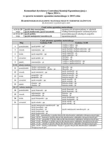 Komunikat dyrektora Centralnej Komisji Egzaminacyjnej z 3 lipca 2014 r. w sprawie terminów egzaminu maturalnego w 2015 roku HARMONOGRAM EGZAMINU MATURALNEGO W TERMINIE GŁÓWNYM dla absolwentów wszystkich typów szkół od 4 do 29 maja od 11 do 23 maja Część ustna egzaminu maturalnego języki obce nowożytne, egzamin jest przeprowadzany w szkołach według harmonogramów ustalonych przez język łemkowski, język kaszubski język polski, przewodniczących szkolnych zespołów języki mniejszości narodowych egzaminacyjnych Maj Część pisemna egzaminu maturalnego Godzina 9:00 Godzina 14:00 * 4 poniedziałek język polski – pp 5 wtorek matematyka – pp 6 środa język angielski – pp 7 czwartek język polski– pr 8 piątek matematyka – pr wiedza o tańcu – pp * wiedza o tańcu – pr język łaciński i kultura antyczna – pp język łaciński i kultura antyczna – pr język angielski – pr * język angielski – dj biologia – pp biologia – pr wiedza o społeczeństwie – pp wiedza o społeczeństwie – pr 9, 10 – sobota, niedziela 11 poniedziałek fizyka i astronomia – pp fizyka i astronomia / fizyka – pr 12 wtorek język niemiecki – pp 13 środa geografia – pp geografia – pr 14 czwartek język rosyjski – pp chemia – pp chemia – pr 16, 17 – sobota, niedziela 15 piątek 18 poniedziałek język francuski – pp 19 wtorek informatyka – pp informatyka – pr 20 środa język hiszpański – pp 21 czwartek język włoski – pp 22 piątek filozofia – pp filozofia – pr język niemiecki – pr język niemiecki – dj historia muzyki – pp historia muzyki – pr język rosyjski – pr język rosyjski – dj historia sztuki – pp historia sztuki – pr język francuski – pr język francuski – dj historia – pp historia – pr język hiszpański – pr język hiszpański – dj język włoski – pr język włoski – dj języki mniejszości narodowych – pp język kaszubski – pp język kaszubski – pr języki mniejszości narodowych – pr język łemkowski – pp język łemkowski – pr ** godz. 9:00 – matematyka w języku obcym dla absolwentów oddziałów dwujęzycznych (pp) ** godz. 10:35 – historia w języku obcym dla absolwentów oddziałów dwujęzycznych (pr) ** godz. 12:10 – geografia w języku obcym dla absolwentów oddziałów dwujęzycznych (pr) ** godz. 13:45 – biologia w języku obcym dla absolwentów oddziałów dwujęzycznych (pr) ** godz. 15:20 – chemia w języku obcym dla absolwentów oddziałów dwujęzycznych (pr) godz. 16:55 – fizyka i astronomia / fizyka w języku obcym dla absolwentów oddziałów ** dwujęzycznych (pr) HARMONOGRAM EGZAMINU MATURALNEGO W TERMINIE DODATKOWYM * dla zdających (absolwentów wszystkich typów szkół), którzy uzyskali zgodę dyrektora okręgowej komisji egzaminacyjnej na przystąpienie do egzaminu maturalnego w dodatkowym terminie od 1 do 17 czerwca od 8 do 13 czerwca Część ustna egzaminu maturalnego języki obce nowożytne, język łemkowski, egzamin jest przeprowadzany w szkołach według harmonogramów ustalonych język kaszubski język polski, przez przewodniczących szkolnych języki mniejszości narodowych zespołów egzaminacyjnych Czerwiec Część pisemna egzaminu maturalnego Godzina 9:00 Godzina 14:00 ** 1 2 poniedziałek wtorek język polski – pp matematyka – pp 3 środa język angielski – pp ** język polski – pr matematyka – pr język angielski – pr ** język angielski – dj 4 – czwartek 5 piątek wiedza o społeczeństwie – pp, pr fizyka i astronomia – pp, pr / fizyka – pr język łaciński i kultura antyczna – pp, pr wiedza o tańcu – pp, pr 6, 7 – sobota, niedziela 8 poniedziałek biologia – pp, pr 9 wtorek język niemiecki – pp 10 środa chemia – pp, pr 11 czwartek język rosyjski – pp 12 piątek informatyka – pp, pr 13, 14 – sobota, niedziela 15 16 17 poniedziałek wtorek środa język francuski pp języki mniejszości narodowych – pp język kaszubski – pp, pr język łemkowski – pp, pr język hiszpański – pp język włoski – pp filozofia – pp, pr historia muzyki – pp, pr historia sztuki – pp, pr język niemiecki – pr język niemiecki – dj geografia – pp, pr *** przedmioty zdawane w języku obcym język rosyjski – pr język rosyjski – dj historia – pp, pr język francuski – pr język francuski – dj języki mniejszości narodowych – pr język hiszpański – pr język hiszpański – dj język włoski – pr język włoski – dj * Informacja o miejscach egzaminu zostanie umieszczona na stronie internetowej właściwej okręgowej komisji egzaminacyjnej w ostatnim tygodniu maja 2015 r. ** pp – poziom podstawowy; pr – poziom rozszerzony; dj – poziom dwujęzyczny *** Dodatkowe zadania egzaminacyjne w języku obcym z biologii, chemii, fizyki i astronomii / fizyki, geografii, historii, matematyki mogą rozwiązywać absolwenci oddziałów dwujęzycznych, w których przedmioty te były nauczane w języku obcym nowożytnym. Przekazanie przez okręgowe komisje egzaminacyjne świadectw do szkół – 30 czerwca 2015 r. (data wydania świadectw dojrzałości i aneksów do świadectw dojrzałości z egzaminu maturalnego przeprowadzanego w maju i w czerwcu: 30 czerwca 2015 r.). HARMONOGRAM EGZAMINU MATURALNEGO W TERMINIE POPRAWKOWYM * dla zdających (absolwentów wszystkich typów szkół), którzy przystąpili do egzaminu maturalnego ze wszystkich przedmiotów obowiązkowych i nie zdali egzaminu tylko z jednego przedmiotu w części ustnej albo w części pisemnej 1. Część pisemna – 25 sierpnia 2015 r. (wtorek), godz. 9:00 2. Część ustna (język polski, języki mniejszości narodowych, języki obce nowożytne) – 24–28 sierpnia 2015 r. * Informacja o miejscu egzaminu i szczegółowych terminach egzaminów ustnych zostanie umieszczona na stronie internetowej właściwej okręgowej komisji egzaminacyjnej w terminie do 7 sierpnia 2015 r. Przekazanie przez okręgowe komisje eg
