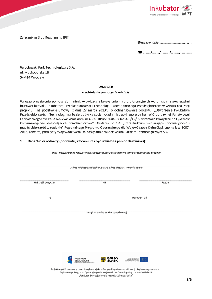 Załącznik nr 3 do Regulaminu IPIT Wrocław, dnia …………….………………….. NR …….../…..…/……..../…….../…………. Wrocławski Park Technologiczny S.A. ul. Muchoborska 18 54-424 Wrocław WNIOSEK o udzielenie pomocy de minimis Wnoszę o udzielenie pomocy de minimis w związku z korzystaniem na preferencyjnych warunkach z powierzchni biurowej budynku Inkubatora Przedsiębiorczości i Technologii udostępnionego Przedsiębiorcom w wyniku realizacji projektu na podstawie umowy z dnia 27 marca 2013r. o dofinansowanie projektu „Utworzenie Inkubatora Przedsiębiorczości i Technologii na bazie budynku socjalno-administracyjnego przy hali W-7 po dawnej Państwowej Fabryce Wagonów PAFAWAG we Wrocławiu nr UDA –RPDS.01.04.00-02-023/12/00 w ramach Priorytetu nr 1 „Wzrost konkurencyjności dolnośląskich przedsiębiorców” Działania nr 1.4. „Infrastruktura wspierająca innowacyjność i przedsiębiorczość w regionie” Regionalnego Programu Operacyjnego dla Województwa Dolnośląskiego na lata 20072013, zawartej pomiędzy Województwem Dolnośląskim a Wrocławskim Parkiem Technologicznym S.A 1. Dane Wnioskodawcy (podmiotu, któremu ma być udzielona pomoc de minimis): Imię i nazwisko albo nazwa Wnioskodawcy (wraz z oznaczeniem formy organizacyjno-prawnej) Adres miejsca zamieszkania albo adres siedziby Wnioskodawcy KRS (Jeśli dotyczy) NIP Tel. Regon Adres e-mail Imię i nazwisko osoby kontaktowej Projekt współfinansowany przez Unię Europejską z Europejskiego Funduszu Rozwoju Regionalnego w ramach Regionalnego Programu Operacyjnego dla Województwa Dolnośląskiego na lata 2007-2013 „Fundusze Europejskie – dla rozwoju Dolnego Śląska” 1/3 2. Przedsięwzięcie (działalność), które Wnioskodawca zamierza realizować przy wykorzystaniu powierzchni biurowej objętej usługą najmu z pomocą de minimis Tytuł i obszar realizacji przedsięwzięcia: Cel i krótki opis: Planowany okres realizacji przedsięwzięcia: 3. Wnoszę o udzielenie pomocy de minimis na korzystanie (w drodze umowy najmu) z m2 powierzchni biurowej budynku Inkubatora Przedsiębiorczości i Technologii na preferencyjnych warunkach odpłatności, zgodnych z obowiązującą tabelą stawek czynszowych* 4. Wnioskowany okres najmu powierzchni biurowej budynku Inkubatora Przedsiębiorczości i Technologii: od do 5. Przyjmuję do wiadomości, że: 1) opłata czynszowa ponoszona przez Wnioskodawcę wynosi: - = zł netto/m-c - = po zł netto/m-c - = zł netto/m-c co daje łączną kwotę: zł netto 2) wartość odpłatności należnej WPT za świadczoną usługę na warunkach rynkowych wynosi: 3) wartość wnioskowanej pomocy de minimis w okresie wskazanym w pkt 4 wynosi: Projekt współfinansowany przez Unię Europejską z Europejskiego Funduszu Rozwoju Regionalnego w ramach Regionalnego Programu Operacyjnego dla Województwa Dolnośląskiego na lata 2007-2013 „Fundusze Europejskie – dla rozwoju Dolnego Śląska” 2/3 6. Dane osoby / osób reprezentujących Wnioskodawcę: imię i nazwisko funkcja w organie reprezentacji (jeżeli dotyczy) Wrocław miejscowość data podpis osoby (osób) reprezentującej Wnioskodawcę Załączniki: 1. 2. 3. 4. Załącznik nr 4 Regulaminu IPIT – Formularz informacji, Załącznik nr 5 Regulaminu IPIT – Oświadczenie o wielkości otrzymanej pomocy Załącznik nr 6 Regulaminu IPIT – Oświadczenie o niezachodzeniu przesłanek wyłączających udzielenie pomocy, Załącznik nr 7 Regulaminu IPIT – Oświadczenie o powiązanych jednostkach gospodarczych na potrzeby ustalenia dostępnego limitu pomocy de minimis dla Przedsiębiorcy *Pomoc de minimis udzielana Przedsiębiorcy stanowi różnicę pomiędzy odpłatnością za korzystanie przez przedsiębiorcę z powierzchni biurowej Budynku na warunkach rynkowych ( ustaloną w oparciu o komercyjne stawki usług najmu świadczonych przez WPT), a odpłatnością faktycznie poniesioną przez przedsiębiorcę zgodnie z obowiązującą tabelą stawek czynszowych. Projekt współfinansowany przez Unię Europejską z Europejskiego Funduszu Rozwoju Regionalnego w ramach Regionalnego Programu Operacyjnego dla Województwa Dolnośląskiego na lata 2007-2013 „Fundusze Europejskie – dla rozwoju Dolnego Śląska” 3/3