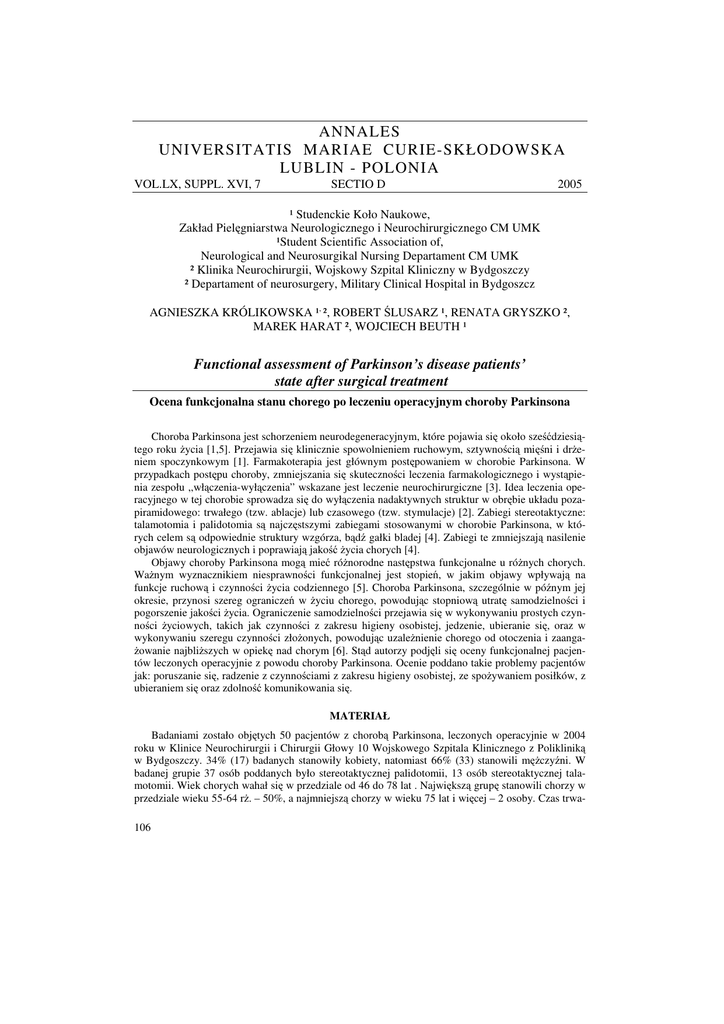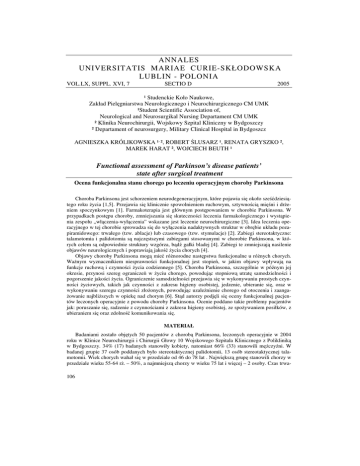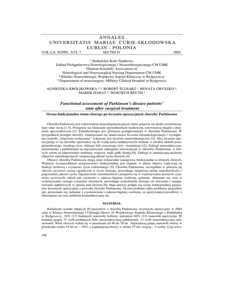 ANNALES UNIVERSITATIS MARIAE CURIE-SKŁODOWSKA LUBLIN - POLONIA VOL.LX, SUPPL. XVI, 7 SECTIO D 2005 ¹ Studenckie Koło Naukowe, Zakład Pielęgniarstwa Neurologicznego i Neurochirurgicznego CM UMK ¹Student Scientific Association of, Neurological and Neurosurgikal Nursing Departament CM UMK ² Klinika Neurochirurgii, Wojskowy Szpital Kliniczny w Bydgoszczy ² Departament of neurosurgery, Military Clinical Hospital in Bydgoszcz AGNIESZKA KRÓLIKOWSKA ¹, ², ROBERT ŚLUSARZ ¹, RENATA GRYSZKO ², MAREK HARAT ², WOJCIECH BEUTH ¹ Functional assessment of Parkinson’s disease patients’ state after surgical treatment Ocena funkcjonalna stanu chorego po leczeniu operacyjnym choroby Parkinsona Choroba Parkinsona jest schorzeniem neurodegeneracyjnym, które pojawia się około sześćdziesiątego roku życia [1,5]. Przejawia się klinicznie spowolnieniem ruchowym, sztywnością mięśni i drżeniem spoczynkowym [1]. Farmakoterapia jest głównym postępowaniem w chorobie Parkinsona. W przypadkach postępu choroby, zmniejszania się skuteczności leczenia farmakologicznego i wystąpienia zespołu ,,włączenia-wyłączenia” wskazane jest leczenie neurochirurgiczne [3]. Idea leczenia operacyjnego w tej chorobie sprowadza się do wyłączenia nadaktywnych struktur w obrębie układu pozapiramidowego: trwałego (tzw. ablacje) lub czasowego (tzw. stymulacje) [2]. Zabiegi stereotaktyczne: talamotomia i palidotomia są najczęstszymi zabiegami stosowanymi w chorobie Parkinsona, w których celem są odpowiednie struktury wzgórza, bądź gałki bladej [4]. Zabiegi te zmniejszają nasilenie objawów neurologicznych i poprawiają jakość życia chorych [4]. Objawy choroby Parkinsona mogą mieć różnorodne następstwa funkcjonalne u różnych chorych. Ważnym wyznacznikiem niesprawności funkcjonalnej jest stopień, w jakim objawy wpływają na funkcje ruchową i czynności życia codziennego [5]. Choroba Parkinsona, szczególnie w późnym jej okresie, przynosi szereg ograniczeń w życiu chorego, powodując stopniową utratę samodzielności i pogorszenie jakości życia. Ograniczenie samodzielności przejawia się w wykonywaniu prostych czynności życiowych, takich jak czynności z zakresu higieny osobistej, jedzenie, ubieranie się, oraz w wykonywaniu szeregu czynności złożonych, powodując uzależnienie chorego od otoczenia i zaangażowanie najbliższych w opiekę nad chorym [6]. Stąd autorzy podjęli się oceny funkcjonalnej pacjentów leczonych operacyjnie z powodu choroby Parkinsona. Ocenie poddano takie problemy pacjentów jak: poruszanie się, radzenie z czynnościami z zakresu higieny osobistej, ze spożywaniem posiłków, z ubieraniem się oraz zdolność komunikowania się. MATERIAŁ Badaniami zostało objętych 50 pacjentów z chorobą Parkinsona, leczonych operacyjnie w 2004 roku w Klinice Neurochirurgii i Chirurgii Głowy 10 Wojskowego Szpitala Klinicznego z Polikliniką w Bydgoszczy. 34% (17) badanych stanowiły kobiety, natomiast 66% (33) stanowili mężczyźni. W badanej grupie 37 osób poddanych było stereotaktycznej palidotomii, 13 osób stereotaktycznej talamotomii. Wiek chorych wahał się w przedziale od 46 do 78 lat . Największą grupę stanowili chorzy w przedziale wieku 55-64 rż. – 50%, a najmniejszą chorzy w wieku 75 lat i więcej – 2 osoby. Czas trwa106 nia choroby wahał się od 3 do 30 lat. Najliczniejszą grupę pacjentów stanowili ci, którzy borykali się z chorobą Parkinsona 6-11 lat tj. 48% badanych. METODA Jako podstawę niniejszych rozważań badawczych przyjęto metodę sondażu diagnostycznego, jako technikę główną zastosowano ankietę. Kwestionariusz ankiety zawierał zestaw pytań dostosowanych do potrzeb tej pracy. Składał się z dwóch części: pierwsza zawierała dane ogólne oraz kafeterie dotyczące objawów i problemów występujących przed zabiegiem operacyjnym; druga dotyczyła funkcjonowania tych pacjentów w bezpośrednim okresie pooperacyjnym. Chorzy badani byli w przeddzień zabiegu oraz po operacji - w dniu wyjścia z kliniki. WYNIKI Po przeanalizowaniu odpowiedzi udzielonych przez chorych przed zabiegiem operacyjnym dowiadujemy się, że u 84% pacjentów występowało spowolnienie ruchowe, u 70% drżenie, u 76% wzmożone napięcie mięśniowe, u 58% zaburzenia równowagi. Odbiciem występujących objawów były problemy w funkcjonowaniu codziennym. W śród badanych 86% miało problemy z poruszaniem się, z higieną osobistą 44%, ze spożywaniem pokarmów 54%, z ubieraniem się 62%. Porównanie głównych problemów w funkcjonowaniu przed operacją a stopniem ich ustąpienia po operacji przedstawiono w tabelach I, II, III, IV, V. Podsumowaniem owych badań była ocena skuteczności zabiegu operacyjnego oraz samopoczucia po operacji dokonana przez samych pacjentów. Zdecydowana większość pacjentów, bo aż prawie 80% zabieg operacyjny jak i samopoczucie po nim oceniło dobrze i bardzo dobrze, chociaż więcej było ocen dobrych. Niewielki odsetek chorych ( 4% i 2%) źle oceniło zabieg operacyjny i swoje samopoczucie po nim. Tabela I. Porównanie problemu poruszania się Problem przed operacją Ustąpienie po operacji Ilość chorych Ilość chorych Chód drobnymi krokami 34 (68%) 26 (76,4%) Spowolnienie ruchowe 46 (92%) 25 (54,3%) Trudności w utrzymaniu równowagi ciała 28 (56%) 20 (71,4%) Pomoc laski 6 (12%) 2 (33,3%) Asekuracja osoby drugiej 14 (28%) 5 (35,7%) Nie chodzę 1 (2%) 0 Żadnych trudności 0 7 (14,0%) Element poruszania się Tabela II. Porównanie problemu higieny osobistej Element higieny osobistej Mycie zębów Golenie się Kąpiel Czesanie się Żadnych trudności Problem przed operacją Ustąpienie po operacji Ilość chorych Ilość chorych 18 (36%) 14 (77,7%) 25 (50%) 19 (76,0%) 29 (58%) 14 (48,2%) 16 (32%) 12 (75,0%) 7 (14%) 13 (26,0%) Tabela III. Porównanie problemu spożywania pokarmów Element spożywania pokarmów Przełykanie pokarmów stałych Utrzymanie sztućców Podnoszenie szklanki