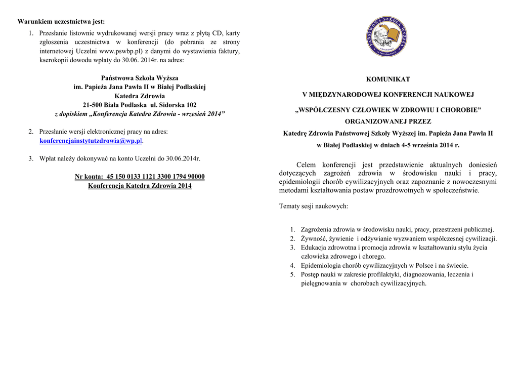 Warunkiem uczestnictwa jest: 1. Przesłanie listownie wydrukowanej wersji pracy wraz z płytą CD, karty zgłoszenia uczestnictwa w konferencji (do pobrania ze strony internetowej Uczelni www.pswbp.pl) z danymi do wystawienia faktury, kserokopii dowodu wpłaty do 30.06. 2014r. na adres: Państwowa Szkoła Wyższa im. Papieża Jana Pawła II w Białej Podlaskiej Katedra Zdrowia 21-500 Biała Podlaska ul. Sidorska 102 z dopiskiem „Konferencja Katedra Zdrowia - wrzesień 2014” KOMUNIKAT V MIĘDZYNARODOWEJ KONFERENCJI NAUKOWEJ „WSPÓŁCZESNY CZŁOWIEK W ZDROWIU I CHOROBIE” ORGANIZOWANEJ PRZEZ 2. Przesłanie wersji elektronicznej pracy na adres: [email protected]. 3. Wpłat należy dokonywać na konto Uczelni do 30.06.2014r. Nr konta: 45 150 0133 1121 3300 1794 90000 Konferencja Katedra Zdrowia 2014 Katedrę Zdrowia Państwowej Szkoły Wyższej im. Papieża Jana Pawła II w Białej Podlaskiej w dniach 4-5 września 2014 r. Celem konferencji jest przedstawienie aktualnych doniesień dotyczących zagrożeń zdrowia w środowisku nauki i pracy, epidemiologii chorób cywilizacyjnych oraz zapoznanie z nowoczesnymi metodami kształtowania postaw prozdrowotnych w społeczeństwie. Tematy sesji naukowych: 1. Zagrożenia zdrowia w środowisku nauki, pracy, przestrzeni publicznej. 2. Żywność, żywienie i odżywianie wyzwaniem współczesnej cywilizacji. 3. Edukacja zdrowotna i promocja zdrowia w kształtowaniu stylu życia człowieka zdrowego i chorego. 4. Epidemiologia chorób cywilizacyjnych w Polsce i na świecie. 5. Postęp nauki w zakresie profilaktyki, diagnozowania, leczenia i pielęgnowania w chorobach cywilizacyjnych. Komitet Naukowy Przewodnicząca – prof. dr hab. Jadwiga Daniluk prof. dr hab. Józef Bergier prof. dr hab. Andrzej Borzęcki prof. dr hab. Zbigniew Borzęcki prof. dr hab. Idalia Cybulska prof. dr hab. Krzysztof Jeziorski prof. dr hab. Maria Kozioł- Montewka prof. dr hab. Anna Kuryliszyn-Moskal prof. dr hab. Grażyna Olchowik prof. dr hab. Siarhei Panko prof. dr hab. Janusz Schabowski prof. dr hab. Sławomir Terlikowski prof. dr hab. Yauheni Tsishchanka prof. dr hab. Krzysztof Turowski prof. dr hab. Irena Wrońska Komitet Organizacyjny dr Stanisława Spisacka – przewodnicząca dr Diana Piaszczyk dr Anna Ślifirczyk dr Barbara Sokołowska mgr Justyna Paszkiewicz mgr Beata Kosińska mgr Renata Chlebowska mgr Iwona Gładysz Przewiduje się publikacje prac w następujących czasopismach: Advances in Medical Sciences – 0,796 IF Human & Health – 3pkt Progress In Health Sciences - 7pkt Medycyna Ogólna i Nauki o Zdrowiu – 4pkt Kwalifikacji prac do poszczególnych czasopism dokona Komitet Naukowy Konferencji do dnia 15.07.2014 roku. Tekst artykułu należy przygotować zgodnie z wymogami wydawniczymi czasopisma Human & Health (http://www.pswbp.pl/index.php/pl/czlowiek-i-zdrowie). Uczestnicy otrzymują także punkty edukacyjne na podstawie rozporządzenia Ministra Zdrowia z dnia 6 października 2004 r. w sprawie sposobów dopełnienia obowiązku doskonalenia zawodowego lekarzy i lekarzy dentystów (Dz. U nr 231, poz. 2326). WAŻNE INFORMACJE Opłata konferencyjna wynosi 550 PLN i obejmuje publikację jednej pracy, wyżywienie, materiały konferencyjne. Usługi hotelowe uczestnicy zamawiają i pokrywają indywidualnie, wg stawek ustalonych przez hotele. mgr Dorota Plewik Językiem używanym w trakcie konferencji będą języki: polski, rosyjski, angielski. Hotel i Restauracja ROTA 21-500 Biała Podlaska ul. Dokudowska 6-8 tel. +48 83 313-13-31, 83 +48 83 313-14-04, fax. 83 313-17-51 www.hotelrota.pl, e-mail: [email protected] Sekretariat Konferencji: mgr Emilia Pawłowicz, e -mail: [email protected]. telefon: 83 344 99 18. Hotel i Restauracja SKALA 21-500 Biała Podlaska ul. Artyleryjska 1 tel: +48 83 344 76 76 www.skalabp.pl, email: [email protected] .