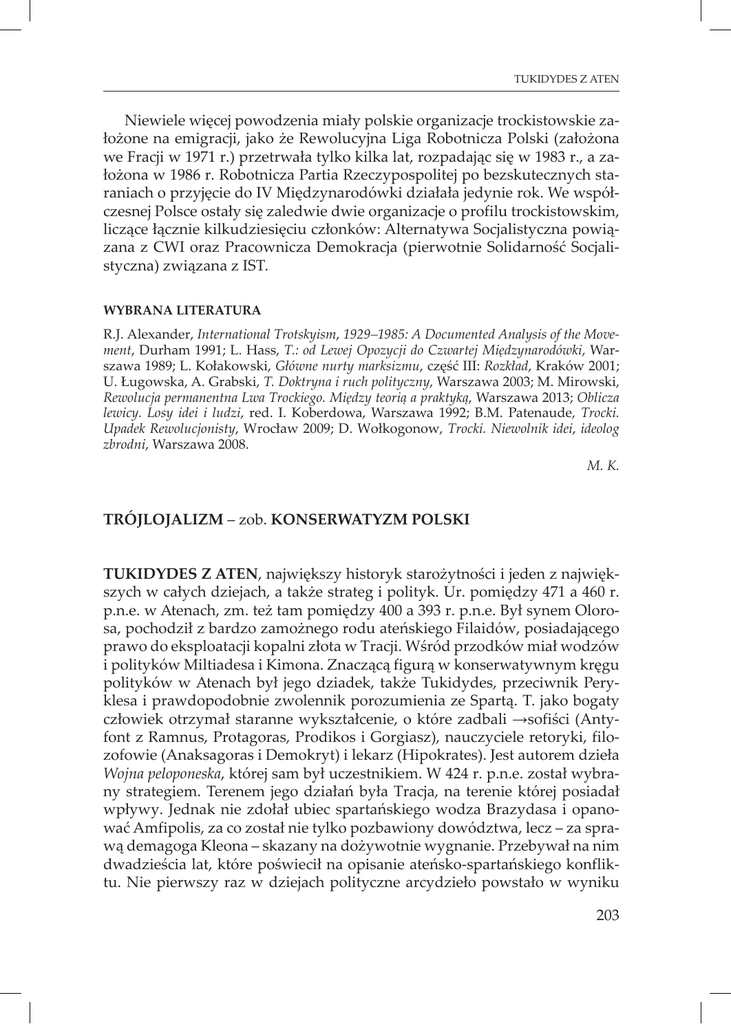 TUKIDYDES Z ATEN Niewiele więcej powodzenia miały polskie organizacje trockistowskie założone na emigracji, jako że Rewolucyjna Liga Robotnicza Polski (założona we Fracji w 1971 r.) przetrwała tylko kilka lat, rozpadając się w 1983 r., a założona w 1986 r. Robotnicza Partia Rzeczypospolitej po bezskutecznych staraniach o przyjęcie do IV Międzynarodówki działała jedynie rok. We współczesnej Polsce ostały się zaledwie dwie organizacje o profilu trockistowskim, liczące łącznie kilkudziesięciu członków: Alternatywa Socjalistyczna powiązana z CWI oraz Pracownicza Demokracja (pierwotnie Solidarność Socjalistyczna) związana z IST. WYBRANA LITERATURA R.J. Alexander, International Trotskyism, 1929–1985: A Documented Analysis of the Movement, Durham 1991; L. Hass, T.: od Lewej Opozycji do Czwartej Międzynarodówki, Warszawa 1989; L. Kołakowski, Główne nurty marksizmu, część III: Rozkład, Kraków 2001; U. Ługowska, A. Grabski, T. Doktryna i ruch polityczny, Warszawa 2003; M. Mirowski, Rewolucja permanentna Lwa Trockiego. Między teorią a praktyką, Warszawa 2013; Oblicza lewicy. Losy idei i ludzi, red. I. Koberdowa, Warszawa 1992; B.M. Patenaude, Trocki. Upadek Rewolucjonisty, Wrocław 2009; D. Wołkogonow, Trocki. Niewolnik idei, ideolog zbrodni, Warszawa 2008. M. K. TRÓJLOJALIZM – zob. KONSERWATYZM POLSKI TUKIDYDES Z ATEN, największy historyk starożytności i jeden z największych w całych dziejach, a także strateg i polityk. Ur. pomiędzy 471 a 460 r. p.n.e. w Atenach, zm. też tam pomiędzy 400 a 393 r. p.n.e. Był synem Olorosa, pochodził z bardzo zamożnego rodu ateńskiego Filaidów, posiadającego prawo do eksploatacji kopalni złota w Tracji. Wśród przodków miał wodzów i polityków Miltiadesa i Kimona. Znaczącą figurą w konserwatywnym kręgu polityków w Atenach był jego dziadek, także Tukidydes, przeciwnik Peryklesa i prawdopodobnie zwolennik porozumienia ze Spartą. T. jako bogaty człowiek otrzymał staranne wykształcenie, o które zadbali →sofiści (Antyfont z Ramnus, Protagoras, Prodikos i Gorgiasz), nauczyciele retoryki, filozofowie (Anaksagoras i Demokryt) i lekarz (Hipokrates). Jest autorem dzieła Wojna peloponeska, której sam był uczestnikiem. W 424 r. p.n.e. został wybrany strategiem. Terenem jego działań była Tracja, na terenie której posiadał wpływy. Jednak nie zdołał ubiec spartańskiego wodza Brazydasa i opanować Amfipolis, za co został nie tylko pozbawiony dowództwa, lecz – za sprawą demagoga Kleona – skazany na dożywotnie wygnanie. Przebywał na nim dwadzieścia lat, które poświecił na opisanie ateńsko-spartańskiego konfliktu. Nie pierwszy raz w dziejach polityczne arcydzieło powstało w wyniku 203 TUKIDYDES Z ATEN załamania kariery jego autora. T. powrócił do Aten na mocy amnestii po zakończeniu wojny w 404 r. p.n.e. Dość rychła śmierć po powrocie uniemożliwiła mu ukończenie dzieła, które urywa się na 411 r. p.n.e. WAŻNIEJSZE PRACE Wojna peloponeska, przeł. K. Kumaniecki, Wrocław 2004, t. 1 i 2. Wojna peloponeska, którą jej autor bez żadnej przesady uznaje za „dorobek o nieprzemijającej wartości, a nie utwór dla chwilowego popisu”, pozostaje jedną z najważniejszych książek o polityce – „podręcznikiem sztuki rządzenia” (określenie Johna F. Finleya Jr.). Na pierwszy rzut oka może się to wydawać problematyczne, skoro polityczna roztropność ujawnia się nade wszystko w umiejętności oceny jednorazowych, swoistych sytuacji. Umiejętności tej nie da się opanować teoretycznie, lecz tylko w praktyce. T. znalazł jednak odpowiedni sposób wykładu. „Zamiast powiedzieć nam – pisze David Bolotin – czy popiera daną politykę, czy też nie, T. zachęca nas, byśmy sformułowali własny sąd, a następnie sprawdzili, czy w świetle wojennych wydarzeń da się on utrzymać. Pozwala nam więc wysłuchać zarówno przemówień popierających podejmowane działania, jak im przeciwnych, a my, zupełnie jakbyśmy brali udział w zgromadzeniu, musimy wyrobić sobie na ich temat własne zdanie bez żadnej wyraźnej podpowiedzi. Dopiero później, krok po kroku, podobnie jak w życiu politycznym, dowiadujemy się o faktycznych następstwach podjętych działań. Nawet wówczas to do nas w pierwszej kolejności należy rozważenie ich konsekwencji i wywnioskowanie, czy były mądre” (Historia filozofii politycznej, red. L. Strauss i J. Cropsey, s. 17). T. uchodzi słusznie za ojca →realizmu politycznego. Jego dzieło wyznacza standardy metodologiczne tej →tradycji politycznego myślenia i działania oraz całej naukowej historiografii. →Cnota obiektywizmu, którą T. osiągnął w najwyższym stopniu, zbudowana jest na jego przekonaniu, że rzeczywistość sama w sobie jest najciekawsza, nie ma więc potrzeby jej ubarwiać. Żaden z poprzedzających go historyków nie widział sprawy w ten sposób i tak jasno. T. zatem jako pierwszy uwolnił się w ocenie sytuacji od balastu religijnych wierzeń. Uwzględniał naturalnie wpływ →religii na ludzkie wyobrażenia, lecz zrezygnował z traktowania bóstw jako prawdziwie kierowniczych sił. T. nie odwoływał się również do mitów, nieuzasadnionych nadziei, ślepej nienawiści, miłości czy strachu w jego różnych postaciach. Stale poszukiwał ziemskich związków przyczynowo-skutkowych i poprzez ich wyświetlanie starał się objaśniać polityczną rzeczywistość. Wszystko to otwierało drogę ku analizie zjawisk politycznych opartej na empirycznie weryfikowalnych danych, bez skłonności do wywołanego określonym stanem emocjonalnym ich idealizowania bądź deprecjonowania; analizie bez łatwych potępień i kaznodziejstwa, 204 TUKIDYDES Z ATEN a jednocześnie niepozostawiającej wrażenia, że wszelkie ludzkie poczynania są na równi uprawnione. Dzięki tak ukształtowanej metodologii T. dał dzieło, które „zarówno swą trudnością, jak głębokością śmiało współzawodniczy