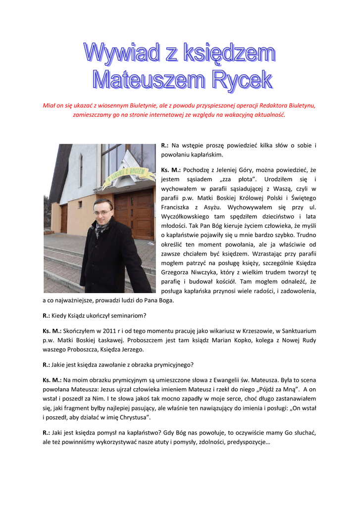 Miał on się ukazać z wiosennym Biuletynie, ale z powodu przyspieszonej operacji Redaktora Biuletynu, zamieszczamy go na stronie internetowej ze względu na wakacyjną aktualność. R.: Na wstępie proszę powiedzied kilka słów o sobie i powołaniu kapłaoskim. Ks. M.: Pochodzę z Jeleniej Góry, można powiedzied, że jestem sąsiadem „zza płota”. Urodziłem się i wychowałem w parafii sąsiadującej z Waszą, czyli w parafii p.w. Matki Boskiej Królowej Polski i Świętego Franciszka z Asyżu. Wychowywałem się przy ul. Wyczółkowskiego tam spędziłem dzieciostwo i lata młodości. Tak Pan Bóg kieruje życiem człowieka, że myśli o kapłaostwie pojawiły się u mnie bardzo szybko. Trudno określid ten moment powołania, ale ja właściwie od zawsze chciałem byd księdzem. Wzrastając przy parafii mogłem patrzyd na posługę księży, szczególnie Księdza Grzegorza Niwczyka, który z wielkim trudem tworzył tę parafię i budował kościół. Tam mogłem odnaleźd, że posługa kapłaoska przynosi wiele radości, i zadowolenia, a co najważniejsze, prowadzi ludzi do Pana Boga. R.: Kiedy Ksiądz ukooczył seminariom? Ks. M.: Skooczyłem w 2011 r i od tego momentu pracuję jako wikariusz w Krzeszowie, w Sanktuarium p.w. Matki Boskiej Łaskawej. Proboszczem jest tam ksiądz Marian Kopko, kolega z Nowej Rudy waszego Proboszcza, Księdza Jerzego. R.: Jakie jest księdza zawołanie z obrazka prymicyjnego? Ks. M.: Na moim obrazku prymicyjnym są umieszczone słowa z Ewangelii św. Mateusza. Była to scena powołana Mateusza: Jezus ujrzał człowieka imieniem Mateusz i rzekł do niego „Pójdź za Mną”. A on wstał i poszedł za Nim. I te słowa jakoś tak mocno zapadły w moje serce, chod długo zastanawiałem się, jaki fragment byłby najlepiej pasujący, ale właśnie ten nawiązujący do imienia i posługi: „On wstał i poszedł, aby działad w imię Chrystusa”. R.: Jaki jest księdza pomysł na kapłaostwo? Gdy Bóg nas powołuje, to oczywiście mamy Go słuchad, ale też powinniśmy wykorzystywad nasze atuty i pomysły, zdolności, predyspozycje… Ks. M.: Na pewno nie ma w życiu przypadków. Ja do momentu święceo kapłaoskich nigdy nie przypuszczałem, że będę posługiwał w Krzeszowie. Oczywiście to będzie tylko etap w życiu, ale w dniu mszy św. Prymicyjnej rano uświadomiłem sobie, że w moim pokoju w domu cały czas wisiał obraz Matki Bożej Łaskawej z Krzeszowa. Wtedy coś mi się poukładało, a mianowicie to, że Matka Boża przygotowywała mnie do tego, abym poszedł do Jej domu, aby tam posługiwad. Było to dla mnie zaskoczeniem, ale i radością. Od początku kiedy tam jestem, doświadczam wielkiej życzliwości ludzi. Widzę, ze nawet niewielkie poczynania ku dobremu przynoszą duże owoce. Cieszy mnie, to że zajmuję się tam wieloma dziedzinami pracy duszpasterskiej, ale najbardziej cieszę się z młodzieży, której na co dzieo jest w kościele ok. 50 osób, drugie tyle, to ministranci, którymi też się zajmuję. Jest to młodzież Krzeszowa, którą uczę także w szkole. Tego wcześniej tam nie było. Krzeszów liczy jakieś 1200 mieszkaoców, więc nie jest to tak mało. R.: To porównywalne z naszą dzielnicą Czarne, a ministrantów u nas jak na lekarstwo, może ksiądz zna jakiś sposób? … Ks. M.: To jest jakaś może wizja na przyszłośd, nie ode mnie to zależy … R.: Jakiego Patrona ma ksiądz? Ks. M.: Oprócz mojego patrona, św. Mateusza jest nim św. Franciszek z Asyżu. Nie dlatego, że pochodzę z parafii p.w. Św. Franciszka z Asyżu, ale także dzięki pieszej pielgrzymce w grupie kamiennogórsko-jeleniogórskiej, w której się wychowałem, a której patronem jest św. Franciszek z Asyżu. Jako dziecko pielgrzymowałem w tej grupie. A w zeszłym roku zostałem jej przewodnikiem. I znów jakiś rozdział się zamknął, a następny otworzył na innym poziomie. Tu przytoczę szczególne świadectwo człowieka z tej pielgrzymki, już dojrzałego, który nie może pojąd, że ja zawsze chodziłem przy jego boku, jako mały Mateusz, a teraz ja jestem przewodnikiem pielgrzymki, a on musi mnie słuchad. Takie to sympatyczne doświadczenie działania Pana Boga. R.: Jak ksiądz ocenia te rekolekcje w naszej Parafii? Ks. M.: Tu znowu widzę jakieś Boże działanie. Niby przypadek. Ksiądz proboszcz miał inne plany co do księdza rekolekcjonisty, ale ostatecznie wypadło na mnie. Poświęciłem, nie powiem dużo czasu, żeby się do nich przygotowad. R.: Czy pomógł Internet? Ks. M.: Nie , Z różnych doświadczeo, których sporo słyszałem od księży i ze swoich, próbowałem stworzyd jedną całośd, która jutro będzie zakooczona. Główną ich myślą dla wiernych jest nadzieja, że Chrystus może naprawdę odmieniad ludzkie życie, tylko trzeba Mu całkowicie zawierzyd. W tym wszystkim nam towarzyszy Maryja, która jest najlepszym wzorem, dlatego też ja, jeśli jadę na rekolekcje, a już kilka razy byłem, bez Niej nigdzie się nie ruszam, R.: Co to znaczy? Czy chodzi o towarzystwo duchowe, czy z medalikiem? Ks. M.: Nie, po prostu biorę obraz Matki Boskiej Łaskawej. R.: Acha, faktycznie, przecież obraz stoi w Kościele… Myślałem, że może Ksiądz Jerzy kupił Ks. M.: Ten obraz ze mną jeździ po tych miejscach, gdzie głoszę rekolekcje. Widzę, że wierni korzystają, z tej okazji, bo nie zawsze mogą pojechad do Matki Bożej, więc Ona ich odwiedza. R.: To jest kopia? Ks. M.: Tak, ten obraz został poświęcony uroczyście, poprzez dotknięcie do oryginalnej ikony. Możliwośd modlitwy przy oryginalnym wizerunku Matki Bożej to wielkie przeżycie. Trzeba przypomnied, że ikona Matki Bożej z Krzeszowa jest najstarszym wizerunkiem maryjnym w Polsce, pochodzi z XIII w. Jest więc starsza od Ikony Jasnogórskiej. Ciężko dojśd, kto jest jego autorem. Zwykle Pan Jezus na ikonach znajduje się po lewej Maryi, przy Jej sercu. Tutaj jest odwrotnie. Jezus znajduje się po lewej stronie ikony, czyli po 