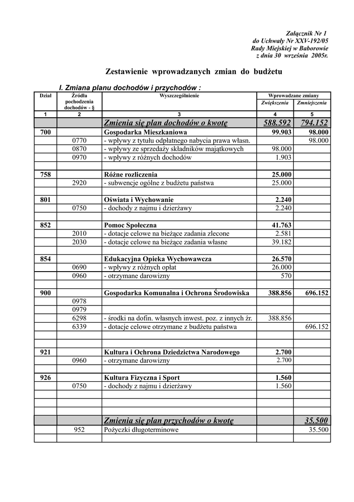 Załącznik Nr 1 do Uchwały Nr XXV-192/05 Rady Miejskiej w Baborowie z dnia 30 września 2005r. Zestawienie wprowadzanych zmian do budżetu I. Zmiana planu dochodów i przychodów : Dział 1 Źródła pochodzenia dochodów - § 2 Wyszczególnienie 3 Zmienia się plan dochodów o kwotę 700 Wprowadzane zmiany Zwiększenia Zmniejszenia 4 5 588.592 794.152 98.000 98.000 Gospodarka Mieszkaniowa - wpływy z tytułu odpłatnego nabycia prawa własn. - wpływy ze sprzedaży składników majątkowych - wpływy z różnych dochodów 99.903 0770 0870 0970 2920 Różne rozliczenia - subwencje ogólne z budżetu państwa 25.000 25.000 0750 Oświata i Wychowanie - dochody z najmu i dzierżawy 2010 2030 Pomoc Społeczna - dotacje celowe na bieżące zadania zlecone - dotacje celowe na bieżące zadania własne 41.763 2.581 39.182 0690 0960 Edukacyjna Opieka Wychowawcza - wpływy z różnych opłat - otrzymane darowizny 26.570 26.000 570 758 801 852 854 900 98.000 1.903 2.240 2.240 Gospodarka Komunalna i Ochrona Środowiska 388.856 0978 0979 6298 6339 - środki na dofin. własnych inwest. poz. z innych źr. - dotacje celowe otrzymane z budżetu państwa 388.856 2.700 0960 Kultura i Ochrona Dziedzictwa Narodowego - otrzymane darowizny 0750 Kultura Fizyczna i Sport - dochody z najmu i dzierżawy 1.560 1.560 921 926 Zmienia się plan przychodów o kwotę 952 Pożyczki długoterminowe 696.152 696.152 2.700 35.500 35.500 2 II. Zmiana planu wydatków : Dział Rozdział Wyszczególnienie 1 2 3 Zmienia się plan wydatków o kwotę 010 Wprowadzane zmiany Zwiększenia Zmniejszenia 4 221.736 Rolnictwo i łowiectwo 010I0 Gospodarka Mieszkaniowa 70004 Różne jednostki obsługi gospodarki mieszkaniowej 1. wydatki bieżące 2. wydatki majątkowe, w tym : - wydatki inwestycyjne 750 75023 39.000 39.000 39.000 24.903 24.903 1.903 23.000 23.000 Administracja Publiczna 35.000 Urząd Miejski 2. wydatki majątkowe, w tym : 35.000 35.000 - wydatki na zakupy inwestycyjne : zakup samochodu :zakup sprzętu komputerowego 754 75412 3.000 32.000 Bezpieczeństwo Publiczne i Ochrona przeciwpożarowa 10.000 Ochotnicze Straże Pożarne 2. wydatki majątkowe, w tym : 10.000 10.000 - wydatki inwestycyjne – remiza OSP Baborów 801 Oświata i Wychowanie 80101 Szkoły Podstawowe 1. wydatki bieżące 2. wydatki majątkowe, w tym : 10.000 118.240 16.000 98.240 98.240 16.000 16.000 - wydatki inwestycyjne – zagospodarowanie placu - wydatki na zakupy inwestycyjne – zakup samochodu 80195 852 462.796 39.000 Infrastruktura wodociągowa i sanitacyjna 2. wydatki majątkowe - wydatki inwestycyjne 700 5 10.000 6.000 Pozostała działalność 1. wydatki bieżące ( PFRON) 20.000 20.000 Pomoc Społeczna 2.581 85215 Dodatki Mieszkaniowe 1. wydatki bieżące 85228 Usługi opiekuńcze 1. wydatki bieżące, w tym : - wynagrodzenia 41.763 2.581 2.581 85295 Pozostała działalność 1. wydatki bieżące 39.182 39.182 20.000 20.000 20.000 3 1 2 3 854 Edukacyjna Opieka Wychowawcza 85401 900 90001 5 26.570 Świetlice dla uczniów 1. wydatki bieżące 26.570 26.570 Gospodarka Komunalna i Ochrona Środowiska 6.000 342.796 Gospodarka ściekowa i ochrona wód 2. wydatki majątkowe, w tym : 6.000 6.000 342.796 342.796 6.000 342.796 - wydatki inwestycyjne 921 4 Kultura i Ochrona Dziedzictwa Narodowego 2.700 92109 Domy, ośrodki kultury, świetlice i kluby 1. wydatki bieżące 2.500 2.500 92116 Biblioteki 1. wydatki bieżące 926 200 200 Kultura Fizyczna i Sport 1.560 92605 Zadania w zakresie kultury fizycznej i sportu 1. wydatki bieżące 1.560 1.560 Uzasadnienie : 1. Na podstawie zgłoszenia szkody budynku mieszkalnego, towarzystwo ubezpieczeniowe wpłaciło odszkodowanie w kwocie 1.903 zł. Kwotę tą wprowadza się do budżetu po stronie dochodów (70070004-0970) z przeznaczeniem na uzupełnienie planowanych wydatków związanych z usuwaniem szkód . 2. Dotychczasowe zadanie inwestycyjne pod nazwą „Zagospodarowanie placu Szkoły Podstawowej przy ul. Opawskiej w Baborowie” otrzymuje brzmienie” Budowa zatoki parkingowej na autobus szkolny”. 3. Na podstawie złożonego wniosku do MEN o dofinansowanie termomodernizacji sali gimnastycznej przy ul. Opawskiej, gmina otrzymała z rezerwy części oświatowej subwencji ogólnej 25.000 zł na dofinansowanie tego zadania (801-80101). Ponadto na to zadanie przeznacza się środki pochodzące z : 1) wymiany sieci wodociągowej przy ul. Głubczyckiej – 10.000 zł planowane w 010-01010, 2) zakupu samochodu na potrzeby stołówki szkolnej – 6.000 zł i z Budowy zatoki parkingowej na autobus szkolny – 10.000 zł dotychczas planowane w 801-80101, 3) zakupu sprzętu komputerowego na potrzeby Urzędu – 32.000 zł i zakupu samochodu na potrzeby Urzędu 3.000 zł dotychczas planowane w 750-75023. 4) Remizy OSP w Baborowie – 10.000 zł planowane w 754-75412. Oszczędności na tych zadaniach w stosunku do planu powstały na wskutek rozstrzygnięcia przetargów jak również zrealizowania niektórych zadań poniżej założeń planowanych. 4. Do budżetu wprowadza się otrzymane darowizny na finansowanie kosztów akcji letniej dla dzieci organizowanej przez stołówkę szkolną– 570 zł (854-85401), finansowanie spotkania autorskiego 200 zł (921-92116), dofinansowanie kosztów organizacji dożynek – 2.500 zł (921-92109) 5. Kalkulacja wpływów za wydane posiłki ze stołówki szkolnej wykazuje przewidywane wykonanie na koniec roku około 190.000 zł. W związku z tym zwiększa się plan dochodów o kwotę 26.000 zł z jednoczesnym zwiększeniem planu wydatków, z przeznaczeniem na zakup niezbędnego wyposażenia na potrzeby stołówki ( 854-85401). 4 6. Kalkulacja wydatków na dodatki mieszkaniowe wykazuje oszczędności w stosunku do planu o kwotę 20.000 zł. Środki te przeznacza się na składki PFRON (801-80195) 7. Zmianę symbolu paragrafu dochodów pochodzących ze sprzedaży mienia dokonuje się na podstawie otrzymanej interpretacji z Ministerstwa Finansów. Otrzymane wpływy ze sprzedaży składnik