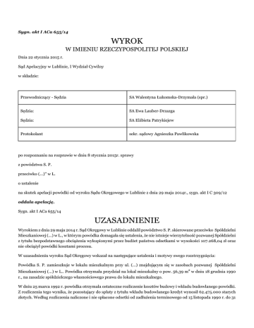 Sygn. akt I ACa 655/14 WYROK W IMIENIU RZECZYPOSPOLITEJ POLSKIEJ Dnia 22 stycznia 2015 r. Sąd Apelacyjny w Lublinie, I Wydział Cywilny w składzie: Przewodniczący - Sędzia SA Walentyna Łukomska-Drzymała (spr.) Sędzia: SA Ewa Lauber-Drzazga Sędzia: SA Elżbieta Patrykiejew Protokolant sekr. sądowy Agnieszka Pawlikowska po rozpoznaniu na rozprawie w dniu 8 stycznia 2015r. sprawy z powództwa S. P. przeciwko (...)" w L. o ustalenie na skutek apelacji powódki od wyroku Sądu Okręgowego w Lublinie z dnia 29 maja 2014r., sygn. akt I C 309/12 oddala apelację. Sygn. akt I ACa 655/14 UZASADNIENIE Wyrokiem z dnia 29 maja 2014 r. Sąd Okręgowy w Lublinie oddalił powództwo S. P. skierowane przeciwko Spółdzielni Mieszkaniowej (...) w L., w którym powódka domagała się ustalenia, że nie istnieje wierzytelność pozwanej Spółdzielni z tytułu bezpodstawnego obciążenia wykupionymi przez budżet państwa odsetkami w wysokości 107.268,04 zł oraz nie obciążył powódki kosztami procesu. W uzasadnieniu wyroku Sąd Okręgowy wskazał na następujące ustalenia i motywy swego rozstrzygnięcia: Powódka S. P. zamieszkuje w lokalu mieszkalnym przy ul. (...) znajdującym się w zasobach pozwanej Spółdzielni Mieszkaniowej (...) w L.. Powódka otrzymała przydział na lokal mieszkalny o pow. 56,39 m2 w dniu 18 grudnia 1990 r., na zasadzie spółdzielczego własnościowego prawa do lokalu mieszkalnego. W dniu 25 marca 1992 r. powódka otrzymała ostateczne rozliczenie kosztów budowy i wkładu budowlanego powódki. Z rozliczenia tego wynika, że pozostający do spłaty z tytułu wkładu budowlanego kredyt wynosił 62.475.000 starych złotych. Według rozliczenia naliczone i nie spłacone odsetki od zadłużenia terminowego od 15 listopada 1990 r. do 31 marca 1992 r. wynosiły 59.032.400 starych złotych. Łącznie do spłaty kredyt wraz z odsetkami wyliczono na kwotę 121.507.400 starych złotych a spłacony ratalnie kredyt od 1 marca 1991 r. do 31 marca 1992 r. wynosił po 1.989.000 starych złotych. Zgodnie z przedstawionym wyliczeniem według stanu na dzień 1 kwietnia 1992 r. pozostały do spłaty kredyt wraz z odsetkami wynosił 1.958.400 starych złotych, a obowiązująca powódkę miesięczna rata z tego tytułu wynosiła 257.600 starych złotych. Miesięczna kwota odsetek naliczanych przez bank przy przyjęciu rocznej stopy procentowej 44% wynosiła 4.382.300 starych złotych, a normatyw spłaty kredytu i odsetek obowiązujących od I kwartału 1992 r. – 14.940 zł/m2 powierzchni użytkowej, w tym rata kredytu 257.600 starych złotych. Miesięczna kapitalizacja odsetek od 1 kwietnia 1992 r. miała wynosić 4.382.300 starych złotych. Powódka nie spłacała „normatywu”, a jedynie na bieżąco regulowała zobowiązania wobec pozwanej Spółdzielni wynikające z tytułu czynszu kwestionując rozliczenie własnego wkładu budowlanego jak i zasadność obciążenia jej odsetkami wykupionymi przez budżet państwa. Brak spłaty zadłużenia z tytułu „normatywu”, brak regularnych wpłat czynszu spowodował, iż pozwana Spółdzielnia wielokrotnie występowała na drogę postępowania sądowego domagając się ich zapłaty. Wyrokiem Sądu Rejonowego wL.z dnia 9 lutego 2010 r. w sprawie sygn.(...)zasądzono od powódki na rzecz pozwanej w niniejszej sprawie Spółdzielni kwotę 19.166,59 zł wraz z odsetkami i kosztami procesu. W toku tego postępowania wywołano opinię biegłego z zakresu ekonomii i rachunkowości T. K., który potwierdził poprawność końcowego rozliczenia lokalu powódki na dzień 31 marca 1992 r. Zadłużenie w kwocie 121.507.400 starych złotych, pokryte kredytem zostało przeniesione do spłaty długoterminowej, a spłata obciążona jest odsetkami. Opiniujący biegły wskazał, że zgodnie z obowiązującymi przepisami i w ustaleniu z bankiem finansującym pozwana Spółdzielnia regulowała zadłużenie kredytowe przeniesione do długoterminowej spłaty. Według biegłego przyjęte zasady rozliczenia kredytu i rozliczenie spłat przeprowadzono w sposób prawidłowy. Biegły opiniujący w sprawie przed Sądem Rejonowym wskazał ponadto, że spółdzielnia dokonywała spłaty kredytu (normatywów) ze środków czynszowych ogółu spółdzielców, a wobec braku pełnej spłaty powódki kwot uregulowanych przez spółdzielnię z tytułu spłat normatywu czyniło zasadnym roszczenie spółdzielni o zwrot kwot, których wysokość została również określona prawidłowo. Sąd Okręgowy ustalił, iż pozwana Spółdzielnia nigdy nie wzywała powódki do jednorazowej spłaty kwoty 107.268,04 zł, ani nie występowała na drogę postępowania sądowego z powództwem o zapłatę takiej kwoty, wysyłając jedynie informację o stanie zadłużenia wobec banku dla członków spółdzielni, którzy otrzymali przydziały lokali mieszkalnych „w kredycie”. Zgodnie z coroczną informacją na dzień 31 grudnia 2011 r. powódka posiadała zadłużenie z tytułu odsetek przejściowo wykupowanych w kwocie 107.268,04 zł. W tak ustalonym stanie faktycznym Sąd Okręgowy uznał żądanie pozwu za bezzasadne. W ocenie Sądu Okręgowego analiza żądania powódki pozwala na przyjęcie, iż znajduje ono oparcie w art. 189 kpc. Po przedstawieniu wykładni pojęcia „interes prawny” w rozumieniu przepisu art. 189 kpc Sąd Okręgowy wskazał, że interes prawny nie zachodzi, gdy zainteresowany może na innej drodze osiągnąć w pełni ochronę swoich praw. Sąd Okręgowy wskazał również, że interes prawny istnieje, gdy istnieje niepewność stanu prawnego lub gdy stronie nie przysługuje droga procesu o świadczenie a strona przeciwna kwestionuje jej prawo lub stosunek prawny. W ocenie Sądu Okręgowego taka sytuacja nie zachodzi w rozpoznawanej sprawie. Powódka w toku całego procesu kwestionowała własne zadłużenie wobec pozwanej Spółdzielni wskazując, iż wynosi ono kwotę 107.268,04 zł i pochodzi z tytułu „przejściowo wykupionych odsetek od kredyt