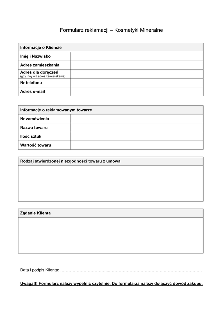 Formularz reklamacji – Kosmetyki Mineralne Informacje o Kliencie Imię i Nazwisko Adres zamieszkania Adres dla doręczeń (gdy inny niż adres zamieszkania) Nr telefonu Adres e-mail Informacje o reklamowanym towarze Nr zamówienia Nazwa towaru Ilość sztuk Wartość towaru Rodzaj stwierdzonej niezgodności towaru z umową Żądanie Klienta Data i podpis Klienta: ……………………………...………………………………….………………………. Uwaga!!! Formularz należy wypełnić czytelnie. Do formularza należy dołączyć dowód zakupu.