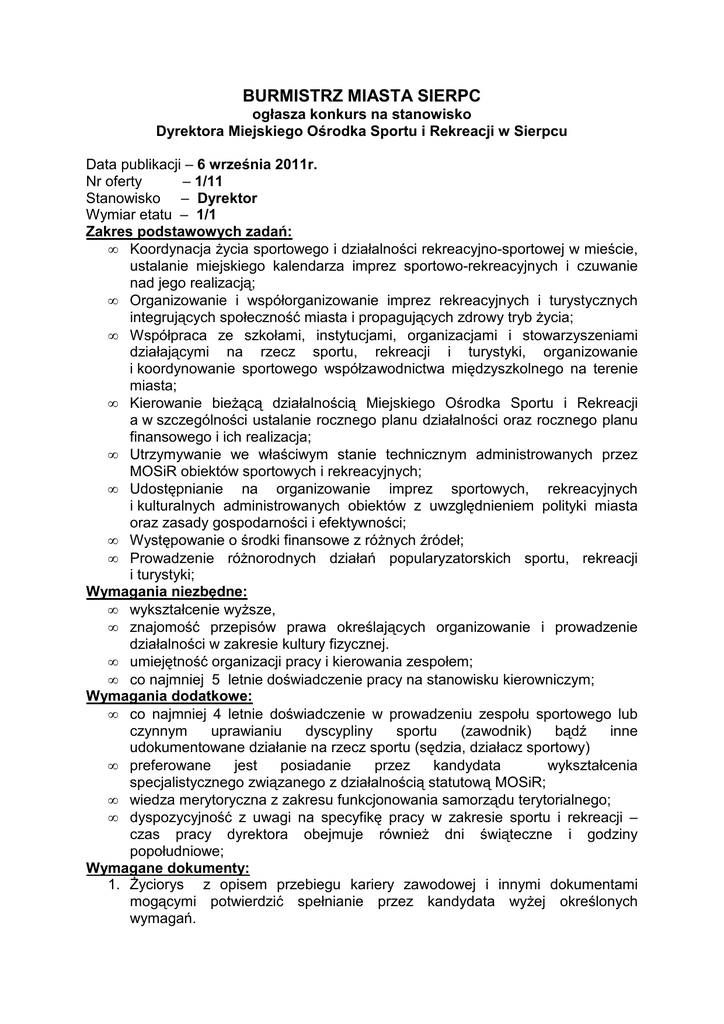 BURMISTRZ MIASTA SIERPC ogłasza konkurs na stanowisko Dyrektora Miejskiego Ośrodka Sportu i Rekreacji w Sierpcu Data publikacji – 6 września 2011r. Nr oferty – 1/11 Stanowisko – Dyrektor Wymiar etatu – 1/1 Zakres podstawowych zadań: • Koordynacja Ŝycia sportowego i działalności rekreacyjno-sportowej w mieście, ustalanie miejskiego kalendarza imprez sportowo-rekreacyjnych i czuwanie nad jego realizacją; • Organizowanie i współorganizowanie imprez rekreacyjnych i turystycznych integrujących społeczność miasta i propagujących zdrowy tryb Ŝycia; • Współpraca ze szkołami, instytucjami, organizacjami i stowarzyszeniami działającymi na rzecz sportu, rekreacji i turystyki, organizowanie i koordynowanie sportowego współzawodnictwa międzyszkolnego na terenie miasta; • Kierowanie bieŜącą działalnością Miejskiego Ośrodka Sportu i Rekreacji a w szczególności ustalanie rocznego planu działalności oraz rocznego planu finansowego i ich realizacja; • Utrzymywanie we właściwym stanie technicznym administrowanych przez MOSiR obiektów sportowych i rekreacyjnych; • Udostępnianie na organizowanie imprez sportowych, rekreacyjnych i kulturalnych administrowanych obiektów z uwzględnieniem polityki miasta oraz zasady gospodarności i efektywności; • Występowanie o środki finansowe z róŜnych źródeł; • Prowadzenie róŜnorodnych działań popularyzatorskich sportu, rekreacji i turystyki; Wymagania niezbędne: • wykształcenie wyŜsze, • znajomość przepisów prawa określających organizowanie i prowadzenie działalności w zakresie kultury fizycznej. • umiejętność organizacji pracy i kierowania zespołem; • co najmniej 5 letnie doświadczenie pracy na stanowisku kierowniczym; Wymagania dodatkowe: • co najmniej 4 letnie doświadczenie w prowadzeniu zespołu sportowego lub czynnym uprawianiu dyscypliny sportu (zawodnik) bądź inne udokumentowane działanie na rzecz sportu (sędzia, działacz sportowy) • preferowane jest posiadanie przez kandydata wykształcenia specjalistycznego związanego z działalnością statutową MOSiR; • wiedza merytoryczna z zakresu funkcjonowania samorządu terytorialnego; • dyspozycyjność z uwagi na specyfikę pracy w zakresie sportu i rekreacji – czas pracy dyrektora obejmuje równieŜ dni świąteczne i godziny popołudniowe; Wymagane dokumenty: 1. śyciorys z opisem przebiegu kariery zawodowej i innymi dokumentami mogącymi potwierdzić spełnianie przez kandydata wyŜej określonych wymagań. 2. List motywacyjny z uzasadnieniem przystąpienia do konkursu. 3. Kwestionariusz osobowy. 4. Potwierdzone za zgodność z oryginałem kserokopie dokumentów potwierdzających wykształcenie i kwalifikacje. 5. Potwierdzone za zgodność z oryginałem kserokopie świadectw pracy lub zaświadczenia o zatrudnieniu. 6. Własny program MOSiR w Sierpcu na okres najbliŜszych 4 lat. 7. Zaświadczenie lekarskie o braku przeciwwskazań do zajmowania stanowiska dyrektora. 8. Oświadczenie o pełnej zdolności do czynności prawnych i korzystania z pełni praw publicznych. 9. Oświadczenie o niekaralności za przestępstwa ścigane z oskarŜenia publicznego lub umyślne przestępstwo skarbowe. Kandydaci podczas rozmowy kwalifikacyjnej będą zobowiązani do przedstawienie (i obrony) programu, o którym mowa w punkcie 6. W Ŝyciorysie prosimy teŜ o dopisanie klauzuli: WyraŜam zgodę na przetwarzanie moich danych osobowych zawartych w ofercie pracy dla potrzeb niezbędnych do realizacji procesu rekrutacji (zgodnie z ustawą z dnia 29 sierpnia 1997r. o ochronie danych osobowych – Dz. U. z 2002r. Nr 101, poz. 926 z późn. zm.). Termin i miejsce składania ofert: Oferty zawierające wyŜej wymienione dokumenty naleŜy składać w zamkniętej kopercie w terminie do dnia 11 października 2011r. w Biurze Obsługi Interesanta w Urzędzie Miejskim w Sierpcu ul. Piastowska 11a lub przesłać pocztą. Na kopercie naleŜy zamieścić adnotację „Konkurs na Dyrektora Miejskiego Ośrodka Sportu i Rekreacji w Sierpcu – oferta 1/11”. Kandydaci, których oferty spełnią wymogi formalne określone w niniejszym ogłoszeniu zostaną zaproszeni na rozmowę kwalifikacyjną. Stosunek pracy z kandydatem wyłonionym w drodze konkursu zastanie zawarty z dniem 1 stycznia 2012 roku na czas określony. Sierpc, 6 września 2011r. Marek Kośmider Burmistrz Miasta Sierpc
