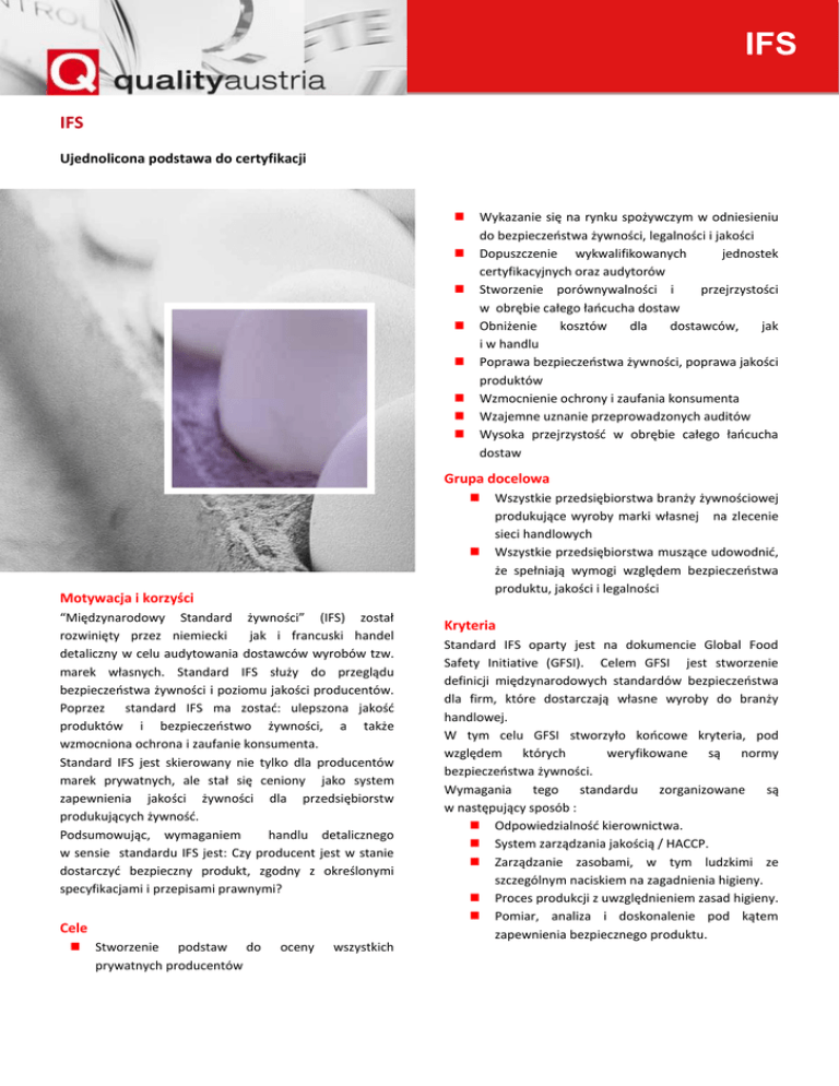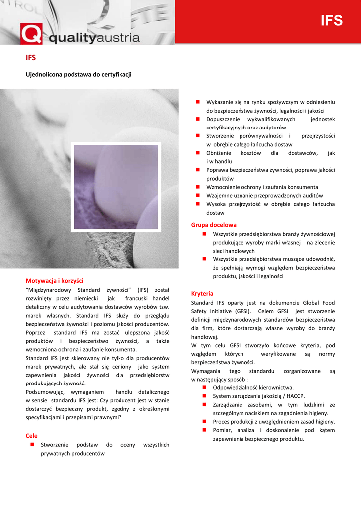 IFS IFS Ujednolicona podstawa do certyfikacji Wykazanie się na rynku spożywczym w odniesieniu do bezpieczeństwa żywności, legalności i jakości Dopuszczenie wykwalifikowanych jednostek certyfikacyjnych oraz audytorów Stworzenie porównywalności i przejrzystości w obrębie całego łańcucha dostaw Obniżenie kosztów dla dostawców, jak i w handlu Poprawa bezpieczeństwa żywności, poprawa jakości produktów Wzmocnienie ochrony i zaufania konsumenta Wzajemne uznanie przeprowadzonych auditów Wysoka przejrzystość w obrębie całego łańcucha dostaw Grupa docelowa Motywacja i korzyści “Międzynarodowy Standard żywności” (IFS) został rozwinięty przez niemiecki jak i francuski handel detaliczny w celu audytowania dostawców wyrobów tzw. marek własnych. Standard IFS służy do przeglądu bezpieczeństwa żywności i poziomu jakości producentów. Poprzez standard IFS ma zostać: ulepszona jakość produktów i bezpieczeństwo żywności, a także wzmocniona ochrona i zaufanie konsumenta. Standard IFS jest skierowany nie tylko dla producentów marek prywatnych, ale stał się ceniony jako system zapewnienia jakości żywności dla przedsiębiorstw produkujących żywność. Podsumowując, wymaganiem handlu detalicznego w sensie standardu IFS jest: Czy producent jest w stanie dostarczyć bezpieczny produkt, zgodny z określonymi specyfikacjami i przepisami prawnymi? Cele Stworzenie podstaw do prywatnych producentów oceny wszystkich Wszystkie przedsiębiorstwa branży żywnościowej produkujące wyroby marki własnej na zlecenie sieci handlowych Wszystkie przedsiębiorstwa muszące udowodnić, że spełniają wymogi względem bezpieczeństwa produktu, jakości i legalności Kryteria Standard IFS oparty jest na dokumencie Global Food Safety Initiative (GFSI). Celem GFSI jest stworzenie definicji międzynarodowych standardów bezpieczeństwa dla firm, które dostarczają własne wyroby do branży handlowej. W tym celu GFSI stworzyło końcowe kryteria, pod względem których weryfikowane są normy bezpieczeństwa żywności. Wymagania tego standardu zorganizowane są w następujący sposób : Odpowiedzialność kierownictwa. System zarządzania jakością / HACCP. Zarządzanie zasobami, w tym ludzkimi ze szczególnym naciskiem na zagadnienia higieny. Proces produkcji z uwzględnieniem zasad higieny. Pomiar, analiza i doskonalenie pod kątem zapewnienia bezpiecznego produktu. IFS Efektem jest specjalny żywnościowy system zarządzania jakością, poprzez który mogą być spełnione w pracy wymagane środki higieny i wyprodukowany bezpieczny dla klienta produkt. Analiza wyników układa się w następujący sposób. Dla oceny dostępne cztery noty, które sięgają od A do D. Nota A= “pełna zgodność z kryterium standardu”, nota D = “kryteria standardu nie zostały spełnione”. Dla uzyskanie certyfikatu koniecznym jest spełnienie tzw. wymagań KO – ustalonych 10 szczególnie ważnych obszarów ramach standardu. przyszłości. Stawia to klientów Quality Austria w niezwykle uprzywilejowanej pozycji. Ponad 12 tys. klientów w prawie 50 krajach osiąga poprzez tę współpracę wymierne korzyści, uzyskując efekt synergii. Kontakt Akredytacja Quality Austria - szkolenia, certyfikacje i ocena – została akredytowana przez BMWA w lutym 2006 r. zgodnie z EN 45011 w zakresie certyfikacji w oparciu o IFS. W ten sposób firma Quality Austria została uznana przez główne stowarzyszenie niemieckich sprzedawców HDE, jako pierwsza austriacka jednostka certyfikująca . Michał Kubista Dyrektor Marketingu i Działu Szkoleń tel. 516687768 e-mail: [email protected] Inne normy i standardy ISO 9001, ISO 22000, BRC, CAC/RCP 1-1969 (Rev. 4-2003) BRC IoP, IFS HPC O Quality Austria Quality Austria GmbH jest Państwa kompetentnym partnerem dla zintegrowanych systemów zarządzania w zakresie jakości, środowiska, bezpieczeństwa pracy i standardów branżowych. Usługi świadczone przez Quality Austria obejmują zakres od szkoleń w zakresie międzynarodowych trendów i metod zarządzania, poprzez certyfikację systemów zarządzania na zgodność z międzynarodowymi standardami i krajowymi wymaganiami, aż po oceny w oparciu o model doskonałości EFQM. Quality Austria jest akredytowana przez BMWFJ w zakresie certyfikacji systemów zarządzania i certyfikacji personelu. Posiada również liczne, międzynarodowe dopuszczenia. Quality Austria z ponad 650 audytorami, trenerami i ekspertami technicznymi zapewnienia skuteczny transfer wiedzy, kompetencji i doświadczenia. Ścisły związek krajowego przedstawiciela z międzynarodowymi organizacjami tj. IQNet, EOQ i EFQM , a także współpraca z firmami: IPC, VDA-QMC , IATF dają niepowtarzalną szansę aktywnego uczestniczenia w wypracowywaniu wymagań standardów, które staną się powszechne w niedalekiej Quality Austria Polska Sp. z o.o. ul. Żwirki i Wigury 14 43-190 Mikołów Tel.: +48 32 226 60 07 Fax: +48 32 216 26 41 e-mail: [email protected] web: www.qualityaustria.com.pl