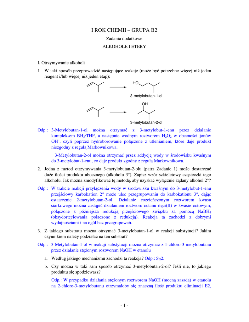 I ROK CHEMII – GRUPA B2 Zadania dodatkowe ALKOHOLE I ETERY I. Otrzymywanie alkoholi 1. W jaki sposób przeprowadzić następujące reakcje (może być potrzebne więcej niż jeden reagent i/lub więcej niż jeden etap): HO 3-metylobutan-1-ol OH 3-metylobutan-2-ol Odp.: 3-Metylobutan-1-ol można otrzymać z 3-metylobut-1-enu przez działanie kompleksem BH3·THF, a następnie wodnym roztworem H2O2 w obecności jonów OH–, czyli poprzez hydroborowanie połączone z utlenianiem, które daje produkt niezgodny z regułą Markownikowa. 3-Metylobutan-2-ol można otrzymać przez addycję wody w środowisku kwaśnym do 3-metylobut-1-enu, co daje produkt zgodny z regułą Markownikowa. 2. Jedna z metod otrzymywania 3-metylobutan-2-olu (patrz Zadanie 1) może dostarczać duże ilości produktu ubocznego (alkoholu 3°). Zapisz wzór szkieletowy cząsteczki tego alkoholu. Jak można zmodyfikować tę metodę, aby uzyskać wyłącznie żądany alkohol 2°? Odp.: W trakcie reakcji przyłączenia wody w środowisku kwaśnym do 3-metylobut-1-enu przejściowy karbokation 2° może ulec przegrupowaniu do karbokationu 3°, dając ostatecznie 2-metylobutan-2-ol. Działanie rozcieńczonym roztworem kwasu siarkowego można zastąpić działaniem roztworu octanu rtęci(II) w kwasie octowym, połączone z późniejsza redukcją przejściowego związku za pomocą NaBH4 (oksydortęciowania połączone z redukcją). Reakcja ta zachodzi z dobrymi wydajnościami i na ogół bez przegrupowań. 3. Z jakiego substratu można otrzymać 3-metylobutan-1-ol w reakcji substytucji? Jakim czynnikiem należy podziałać na ten substrat? Odp.: 3-Metylobutan-1-ol w reakcji substytucji można otrzymać z 1-chloro-3-metylobutanu przez działanie stężonym roztworem NaOH w etanolu a. Według jakiego mechanizmu zachodzi ta reakcja? Odp.: SN2. b. Czy można w taki sam sposób otrzymać 3-metylobutan-2-ol? Jeśli nie, to jakiego produktu się spodziewasz? Odp.: W przypadku działania stężonym roztworem NaOH (mocną zasadą) w etanolu na 2-chloro-3-metylobutanu otrzymałoby się znaczną ilość produktu eliminacji E2, -1- czyli 3-metylobut-2-enu. Reakcja pod wpływem samej wody (słabej zasady), byłaby bardzo powolna. 4. W jaki sposób przeprowadzić następujące reakcje (może być potrzebne więcej niż jeden reagent i/lub więcej niż jeden etap): OsO4, H2O2 a) HO OH 1. MCPBA, DCM 2. H2O, H3O+ b) i (1:1) HO OH HO OH a. Jaka jest sumaryczna stereochemia (syn czy anti) reakcji a), a jaka reakcji b) Odp.: a) syn, b) anti b. Czy reakcje w podpunktach a). i b). są: –stereoselektywne? Odp.: Tak. –stereospecyficzne? Odp.: Tak (chociaż izomer E substratu nie istnieje, to jest możliwy do wyobrażenia) c. Aby opowiedzieć na pytania z podpunktów a. i b. odpowiedz wcześniej na pytania: –Ile izomerów konfiguracyjnych cykloheksano-1,2-diolu jest możliwych? Odp.: Trzy. –Czy w reakcjach a) i b) powstają wszystkie te możliwe izomery? Odp.: Nie. 5. W przypadku których związków można zastosować regułę Markownikowa, aby przewidzieć produkt przyłączenia wody w środowisku kwaśnym? a) b) c) d) e) f) Odp.: W przypadkach a) i f). 6. Zaproponuj odpowiednie związki, zawierające grupę karbonylową (w niektórych przypadkach mogą być to dwa lub trzy związki z różnych klas), które w wyniku redukcji (czasami możliwy jest jeden lub więcej reduktorów), dadzą: OH a) OH b) OH c) d) HO a. Rozważ wszyskie kombinacje znanych Ci związków, zawierających grupę karbonylową oraz znanych Ci reduktorów. b. W każdym przypadku zaproponuj odpowiedni rozpuszczalnik do prowadzenia reakcji. -2- 1. alb NaB 2. o L H4 , H iAl Et H 2O , H 4 , e OH 3 O + ter O H H 1. LiA lH , e 2. H 4 ter 2 O, H O+ O O 3 OH OH ter lH , e 1. LiA ,4H O+ O 3 2. H 2 ter ,e + O 4 lH 3 LiA O, H . 1 H2 2. a) O O O 3 O O O OH Cl 1. NaBH4, EtOH albo LiAlH4, eter 2. H2O, H3O+ c) 1. LiA lH , e 2. H 4 ter 2 O, H O+ te r lH , e 1. LiA ,4H O+ O 3 2. H 2 ter , e O+ 4 lH 3 LiA , H 1. H 2O 2. b) OH Cl O 1. alb NaB 2. o L H4 , H iAl Et O 2 O, H H 4 , et H 3 O + er O OH redukcja OH d) brak 7. Jaki halogenek użyjesz do otrzymania związku Grignarda i z jakim związkiem, zawierającym grupę karbonylową (jakie typy związków są w tym przypadku możliwe?) przeprowadzisz reakcję, aby otrzymać: OH OH a) b) OH OH c) d) a. W przypadku a) możliwa jest tylko jedna kombinacja O X i OH H H b. W przypadku b) możliwa jest tylko jedna kombinacja O OH i X H H c. W przypadku c) możliwe są dwie kombinacje O X i H3C H OH albo O CH3X i H d. W przypadku d) możliwe są dwie kombinacje -3- HO e) O CH3X i H3C OR albo OH O CH3X i H3C CH3 e. W przypadku e) możliwe są trzy kombinacje O CH3X i CH3 albo X O i OH H3C CH3 albo O CH3X i 8. OR Alkohole 3° łatwo ulegają przemianie w halogenki alkilowe pod wpływem działania kwasów: HCl, HBr lub HI. a. Jaki jest mechanizm tej reakcji? Odp.: SN1 (dokładniej SN1cA). b. Czy w przypadku halogenków 1° i 2° spodziewasz się tego samego, czy innego mechanizmu? Odp.: W miarę przechodzenia do halogenków o niższej rzędowości: 3° → 2° → 1°, będzie malał udział mechanizmu SN1cA, a wzrastał udział mechanizmu SN2cA. 8. Jakich reagentów użyjesz, żeby przeprowadzić poniższe reakcje: -4- II. Otrzymywanie eterów. 10. a. Czy można otrzymać eter etylowo-propylowy ogrzewając mieszaninę alkoholu etylowego i propan-1-olu w obecności małej ilości stężonego kwasu siarkowego? Jeśli tak, to jaka jest maksymalna teoretyczna wydajność żądanego produktu? Odp.: Można, ale maksymalna teoretyczna wydajność żądanego produktu będzie wynosić tylko około 50% (resztę będą stanowić produkty samokondensacji substratów). c. Eter etylowo-propylowy można również otrzymać w innej reakcji, z wysoką wydajnością. Jednym z reagentów jest halogenek alkilowy. –Podaj obie kombinacje reagentów w tej reakcji, które doprowadzą Cię do eteru etylowo-propylowego. ONa X EtOH O (X = Cl, Br, I) –Według jakiego mechanizm