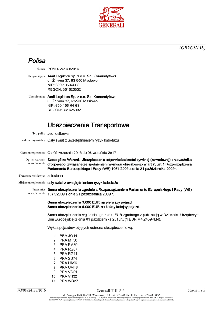 (ORYGINAŁ) Polisa Numer PO/00724133/2016 Ubezpieczający Amit Logistics Sp. z o.o. Sp. Komandytowa ul. Żniwna 37, 63-900 Masłowo NIP: 699-195-64-63 REGON: 361625832 Ubezpieczony Amit Logistics Sp. z o.o. Sp. Komandytowa ul. Żniwna 37, 63-900 Masłowo NIP: 699-195-64-63 REGON: 361625832 Ubezpieczenie Transportowe Typ polisy Zakres terytorialny Okres ubezpieczenia Ogólne warunki ubezpieczenia Jednostkowa Cały świat z uwzględnieniem ryzyk kabotażu Od 09 września 2016 do 08 września 2017 Szczególne Warunki Ubezpieczenia odpowiedzialności cywilnej (zawodowej) przewoźnika drogowego, związane ze spełnieniem wymogu określonego w art.7, ust.1 Rozporządzenia Parlamentu Europejskiego i Rady (WE) 1071/2009 z dnia 21 października 2009r. Franszyza redukcyjna zniesiona Miejsce ubezpieczenia cały świat z uwzględnieniem ryzyk kabotażu Przedmiot ubezpieczenia Suma ubezpieczenia zgodnie z Rozporządzeniem Parlamentu Europejskiego i Rady (WE) 1071/2009 z dnia 21 października 2009 r. Suma ubezpieczenia 9.000 EUR na pierwszy pojazd. Suma ubezpieczenia 5.000 EUR na każdy kolejny pojazd. Suma ubezpieczenia wg średniego kursu EUR zgodnego z publikacją w Dzienniku Urzędowym Unii Europejskiej z dnia 01 października 2015r., (1 EUR = 4,2459PLN). Wykaz pojazdów objętych ochroną ubezpieczeniową: 1. 2. 3. 4. 5. 6. 7. 8. 9. 10. 11. PO/00724133/2016 PRA JW14 PRA MT38 PRA PM89 PRA RG07 PRA RG11 PRA SU74 PRA UA96 PRA UM46 PRA VG21 PRA VH32 PRA WR27 Generali T.U. S.A. ul. Postępu 15B, 02-676 Warszawa, Tel. +48 22 543 05 00, Fax +48 22 543 08 99 Spółka zarejestrowana w Sądzie Rejonowym dla m. st. Warszawy, XIII Wydział Gospodarczy Krajowego Rejestru Sądowego pod numerem KRS 10623. Kapitał zakładowy: 191.000.000 PLN w pełni opłacony; NIP: 526-23-49-108. Spółka należąca do Grupy Generali, figurującej w Rejestrze Grup Ubezpieczeniowych prowadzonych przez ISVAP. Strona 1 z 5 (ORYGINAŁ) 12. 13. 14. 15. 16. 17. 18. 19. 20. 21. 22. 23. 24. 25. 26. 27. 28. 29. 30. PRA XS65 PRA XX85 PRA YV61 PRA YR60 PRA 84M1 PRA 85M1 PRA 58G1 PRA 26W1 PRA 52F2 DSR 31068 DSR 32183 DSR 34682 DSR 38081 DSR38082 DSR 38083 WGM 3KX6 WGM 3KX7 WGM 2RN6 WGM 2RN7 Okres ubezpieczenia Od 09 września 2016 do 08 września 2017 Suma ubezpieczenia 154 000,00 EUR na jedno i wszystkie zdarzenia Składka za przedmiot 5 700,00 PLN Uzgodnienia i postanowienia końcowe Reklamacje dotyczące usług Generali TU SA należy składać w formie pisemnej – przesyłką pocztową na adres: ul. Postępu 15b, 02-676 Warszawa, z dopiskiem „REKLAMACJA do Departamentu Likwidacji Szkód Korporacyjnych” albo osobiście w jednostce Generali obsługującej klientów, ustnie – telefonicznie pod nr tel. 913 913 913 albo osobiście do protokołu w jednostce Generali obsługującej klientów. Odpowiedź na reklamację udzielona zostanie w postaci papierowej lub na wniosek klienta w formie elektronicznej. Generali rozpatruje reklamacje w terminie nie dłuższym niż 30 dni, a w przypadku braku możliwości rozpatrzenia reklamacji w tym terminie (szczególnie skomplikowane przypadki), informuje o przyczynach opóźnienia, okolicznościach do ustalenia, przewidywanym terminie rozpatrzenia reklamacji i udzielenia odpowiedzi (nie dłuższym niż 60 dni). Integralną częścią polisy są Szczególne Warunki Ubezpieczenia odpowiedzialności cywilnej (zawodowej) przewoźnika drogowego, związane ze spełnieniem wymogu określonego w art. 7 ust. 1 Rozporządzenia Parlamentu Europejskiego i Rady (WE) 1071/2009 z dnia 21 października 2009r. Szczególne Warunki Ubezpieczenia odpowiedzialności cywilnej (zawodowej) przewoźnika drogowego związane ze spełnieniem wymogu określonego w art. 7 ust. 1 Rozporządzenia Parlamentu Europejskiego i Rady (WE) 1071/2009 z dnia 21 października 2009 r. 1. Przedmiot ubezpieczenia Generali obejmuje ochroną ubezpieczeniową zobowiązania lub roszczenia finansowe wysunięte wobec Ubezpieczonego na podstawie zakresu określonego w art. 7 ust. 1 Rozporządzenia Parlamentu Europejskiego i Rady (WE) 1071/2009 z dnia 21 października 2009 r., ustanawiającego wspólne zasady dotyczące warunków PO/00724133/2016 Generali T.U. S.A. ul. Postępu 15B, 02-676 Warszawa, Tel. +48 22 543 05 00, Fax +48 22 543 08 99 Spółka zarejestrowana w Sądzie Rejonowym dla m. st. Warszawy, XIII Wydział Gospodarczy Krajowego Rejestru Sądowego pod numerem KRS 10623. Kapitał zakładowy: 191.000.000 PLN w pełni opłacony; NIP: 526-23-49-108. Spółka należąca do Grupy Generali, figurującej w Rejestrze Grup Ubezpieczeniowych prowadzonych przez ISVAP. Strona 2 z 5 (ORYGINAŁ) wykonywania zawodu przewoźnika drogowego i uchylającego Dyrektywę Rady 96/26 WE (zwanym dalej „Rozporządzeniem”), w związku art. 3 ust. 1. lit. c, tego Rozporządzenia. 2. Ubezpieczony – podmiot, który ubiega się o wydanie zezwolenia/licencji albo też dysponuje ważnym zezwoleniem/ licencją na wykonywanie transportu drogowego rzeczy lub osób, wydaną przez właściwy organ na podstawie obowiązujących przepisów. 3. Zawarcie umowy ubezpieczenia następuje na podstawie wniosku Ubezpieczonego złożonego na formularzu Generali lub w innej formie pisemnej. 4. Ochrona ubezpieczeniowa określona jest w polisie i obowiązuje, nie wcześniej niż od dnia następnego po opłaceniu stosownej składki. 5. Suma gwarancyjna umowy ubezpieczenia zostaje ustalona zgodnie z wymogami przepisu artykułu 7 ust. 1 Rozporządzenia i wynosi: 1) dla jednego pojazdu silnikowego (lub zestawu pojazdów) 9.000 EURO, względnie równowartość w złotych polskich, określona według kursu z pierwszego dnia roboczego października opublikowanego w Dzienniku Urzędowym Unii Europejskiej, a obowiązującego od dnia 1 stycznia następnego roku kalendarzowego; 2) dla każdego dodatkowego pojazdu silnikowego lub zestawu pojazdów 5.000 EURO, względnie równowartość w złotych polskich, określona jak w punkcie poprzedzającym. 3) Suma gwarancyjna stanowi iloczyn ilości poj