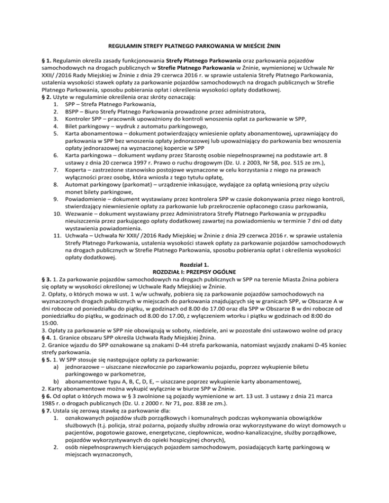 REGULAMIN STREFY PŁATNEGO PARKOWANIA W MIEŚCIE ŻNIN § 1. Regulamin określa zasady funkcjonowania Strefy Płatnego Parkowania oraz parkowania pojazdów samochodowych na drogach publicznych w Strefie Płatnego Parkowania w Żninie, wymienionej w Uchwale Nr XXII/ /2016 Rady Miejskiej w Żninie z dnia 29 czerwca 2016 r. w sprawie ustalenia Strefy Płatnego Parkowania, ustalenia wysokości stawek opłaty za parkowanie pojazdów samochodowych na drogach publicznych w Strefie Płatnego Parkowania, sposobu pobierania opłat i określenia wysokości opłaty dodatkowej. § 2. Użyte w regulaminie określenia oraz skróty oznaczają: 1. SPP – Strefa Płatnego Parkowania, 2. BSPP – Biuro Strefy Płatnego Parkowania prowadzone przez administratora, 3. Kontroler SPP – pracownik upoważniony do kontroli wnoszenia opłat za parkowanie w SPP, 4. Bilet parkingowy – wydruk z automatu parkingowego, 5. Karta abonamentowa – dokument potwierdzający wniesienie opłaty abonamentowej, uprawniający do parkowania w SPP bez wnoszenia opłaty jednorazowej lub upoważniający do parkowania bez wnoszenia opłaty jednorazowej na wyznaczonej kopercie w SPP 6. Karta parkingowa – dokument wydany przez Starostę osobie niepełnosprawnej na podstawie art. 8 ustawy z dnia 20 czerwca 1997 r. Prawo o ruchu drogowym (Dz. U. z 2003, Nr 58, poz. 515 ze zm.), 7. Koperta – zastrzeżone stanowisko postojowe wyznaczone w celu korzystania z niego na prawach wyłączności przez osobę, która wniosła z tego tytułu opłatę, 8. Automat parkingowy (parkomat) – urządzenie inkasujące, wydające za opłatą wniesioną przy użyciu monet bilety parkingowe, 9. Powiadomienie – dokument wystawiany przez kontrolera SPP w czasie dokonywania przez niego kontroli, stwierdzający niewniesienie opłaty za parkowanie lub przekroczenie opłaconego czasu parkowania, 10. Wezwanie – dokument wystawiany przez Administratora Strefy Płatnego Parkowania w przypadku nieuiszczenia przez parkującego opłaty dodatkowej zawartej na powiadomieniu w terminie 7 dni od daty wystawienia powiadomienia. 11. Uchwała – Uchwała Nr XXII/ /2016 Rady Miejskiej w Żninie z dnia 29 czerwca 2016 r. w sprawie ustalenia Strefy Płatnego Parkowania, ustalenia wysokości stawek opłaty za parkowanie pojazdów samochodowych na drogach publicznych w Strefie Płatnego Parkowania, sposobu pobierania opłat i określenia wysokości opłaty dodatkowej. Rozdział 1. ROZDZIAŁ I: PRZEPISY OGÓLNE § 3. 1. Za parkowanie pojazdów samochodowych na drogach publicznych w SPP na terenie Miasta Żnina pobiera się opłaty w wysokości określonej w Uchwale Rady Miejskiej w Żninie. 2. Opłaty, o których mowa w ust. 1 w/w uchwały, pobiera się za parkowanie pojazdów samochodowych na wyznaczonych drogach publicznych w miejscach do parkowania znajdujących się w granicach SPP, w Obszarze A w dni robocze od poniedziałku do piątku, w godzinach od 8.00 do 17.00 oraz dla SPP w Obszarze B w dni robocze od poniedziałku do piątku, w godzinach od 8.00 do 17.00, z wyłączeniem wtorku i piątku w godzinach od 8:00 do 15:00. 3. Opłaty za parkowanie w SPP nie obowiązują w soboty, niedziele, ani w pozostałe dni ustawowo wolne od pracy § 4. 1. Granice obszaru SPP określa Uchwała Rady Miejskiej Żnina. 2. Granice wjazdu do SPP oznakowane są znakami D-44 strefa parkowania, natomiast wyjazdy znakami D-45 koniec strefy parkowania. § 5. 1. W SPP stosuje się następujące opłaty za parkowanie: a) jednorazowe – uiszczane niezwłocznie po zaparkowaniu pojazdu, poprzez wykupienie biletu parkingowego w parkometrze, b) abonamentowe typu A, B, C, D, E, – uiszczane poprzez wykupienie karty abonamentowej, 2. Karty abonamentowe można wykupić wyłącznie w biurze SPP w Żninie. § 6. Od opłat o których mowa w § 3 zwolnione są pojazdy wymienione w art. 13 ust. 3 ustawy z dnia 21 marca 1985 r. o drogach publicznych (Dz. U. z 2000 r. Nr 71, poz. 838 ze zm.). § 7. Ustala się zerową stawkę za parkowanie dla: 1. oznakowanych pojazdów służb porządkowych i komunalnych podczas wykonywania obowiązków służbowych (t.j. policja, straż pożarna, pojazdy służby zdrowia oraz wykorzystywane do wizyt domowych u pacjentów, pogotowie gazowe, energetyczne, ciepłownicze, wodno-kanalizacyjne, służby porządkowe, pojazdów wykorzystywanych do opieki hospicyjnej chorych), 2. osób niepełnosprawnych kierujących pojazdem samochodowym, posiadających kartę parkingową w miejscach wyznaczonych, 3. kierującego pojazdem samochodowym, przewożącym osobę niepełnosprawną posiadającą kartę parkingową w miejscach wyznaczonych, 4. wykonawców remontów na ulicach objętych strefą płatnego parkowania na czas trwania remontu, za okazaniem dokumentu poświadczającego wykonywanie remontu na określonej ulicy i w określonym czasie, 5. przedsiębiorców wykonujących transport drogowy osób taksówką w oczekiwaniu na pasażera lub w związku z zakończeniem kursu i rozliczeniem na czas 5 minut, 6. kurierów na czas 10 min w celu dostarczenia przesyłek, 7. autobusów przywożących i odwożących dzieci i młodzież do szkół na czas oczekiwania na pasażerów oraz ich wsiadania i wysiadania, 8. pojazdów dostawczych na czas 15 min dowożących towar do punktów w SPP. Rozdział 2. ROZDZIAŁ II: REALIZACJA OPŁAT W SPP § 8. 1. Obowiązkiem kierowcy pojazdu samochodowego parkującego w SPP jest niezwłoczne po zaparkowaniu wniesienie opłaty za parkowanie. 2. Opłata za parkowanie pojazdów samochodowych obowiązuje w każdym wyznaczonym miejscu do parkowania w SPP. § 9. 1. Minimalny opłacony czas parkowania w SPP wynosi 0,5 godziny. 2. Wykupienie biletu parkingowego w automacie parkingowym następuje przy użyciu monet o nominale 5 zł, 2 zł, 1 zł, 50 gr, 20 gr i 10 gr. Opłacenie czasu parkowania, z zastrzeżeniem ust.1, następuje proporcjonalnie do wartości użytej monety lub monet. § 10. 1. Wysokość opłat abonamentowych określa Uchwała Rady Miejskiej. 2.