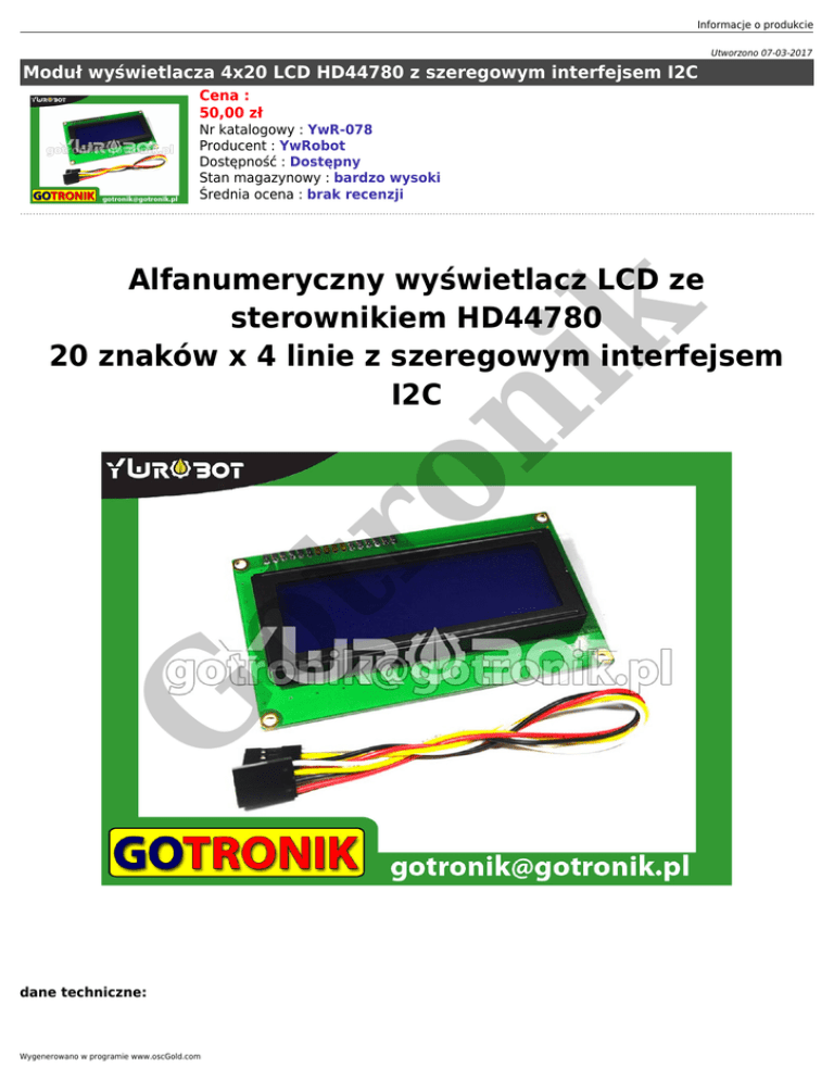 Informacje o produkcie Utworzono 07-03-2017 Moduł wyświetlacza 4x20 LCD HD44780 z szeregowym interfejsem I2C Cena : 50,00 zł Nr katalogowy : YwR-078 Producent : YwRobot Dostępność : Dostępny Stan magazynowy : bardzo wysoki Średnia ocena : brak recenzji G ot r on ik Alfanumeryczny wyświetlacz LCD ze sterownikiem HD44780 20 znaków x 4 linie z szeregowym interfejsem I2C dane techniczne: Wygenerowano w programie www.oscGold.com ● ● ● ● ● ● ● ● ● ● ● ● model wyświetlacza: LCM I2C 2004 V2-B wymiary: 98 x 60 x 19mm LCD: 2004 (sterownik HD44780) kolor: niebieski i biały napięcie zasilania: 5V komunikacja z mikrokotrolerem: szeregowa I2C adresy: 0x20-0x27 (domyślnie 0x27) LCD2004 wysokiej jakości wyświetlacz LCD sterowanie magistralą I2C wykorzystuje tylko dwa porty IO regulacja podświetlenia ekranu LCD potencjometr do regulacji kontrastu ogólnodostępne biblioteki programistyczne np.Arduino zastosowanie: Arduino, MCU, ARM, AVR, PIC, Raspberry Pi on ik ● G ot r zdjęcia: G ot r on ik Informacje o produkcie Wygenerowano w programie www.oscGold.com on ik ot r G G ot r on ik Informacje o produkcie Wygenerowano w programie www.oscGold.com