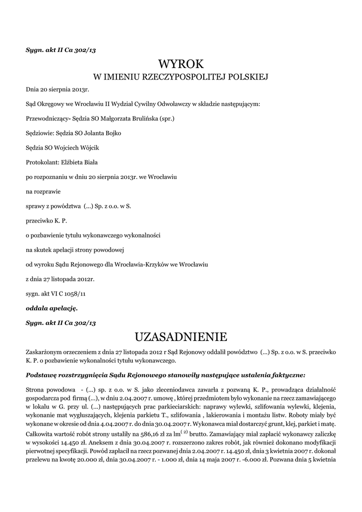 Sygn. akt II Ca 302/13 WYROK W IMIENIU RZECZYPOSPOLITEJ POLSKIEJ Dnia 20 sierpnia 2013r. Sąd Okręgowy we Wrocławiu II Wydział Cywilny Odwoławczy w składzie następującym: Przewodniczący- Sędzia SO Małgorzata Brulińska (spr.) Sędziowie: Sędzia SO Jolanta Bojko Sędzia SO Wojciech Wójcik Protokolant: Elżbieta Biała po rozpoznaniu w dniu 20 sierpnia 2013r. we Wrocławiu na rozprawie sprawy z powództwa (...) Sp. z o.o. w S. przeciwko K. P. o pozbawienie tytułu wykonawczego wykonalności na skutek apelacji strony powodowej od wyroku Sądu Rejonowego dla Wrocławia-Krzyków we Wrocławiu z dnia 27 listopada 2012r. sygn. akt VI C 1058/11 oddala apelację. Sygn. akt II Ca 302/13 UZASADNIENIE Zaskarżonym orzeczeniem z dnia 27 listopada 2012 r Sąd Rejonowy oddalił powództwo (...) Sp. z o.o. w S. przeciwko K. P. o pozbawienie wykonalności tytułu wykonawczego. Podstawę rozstrzygnięcia Sądu Rejonowego stanowiły następujące ustalenia faktyczne: Strona powodowa - (...) sp. z o.o. w S. jako zleceniodawca zawarła z pozwaną K. P., prowadząca działalność gospodarcza pod firmą (...), w dniu 2.04.2007 r. umowę , której przedmiotem było wykonanie na rzecz zamawiającego w lokalu w G. przy ul. (...) następujących prac parkieciarskich: naprawy wylewki, szlifowania wylewki, klejenia, wykonanie mat wygłuszających, klejenia parkietu T., szlifowania , lakierowania i montażu listw. Roboty miały być wykonane w okresie od dnia 4.04.2007 r. do dnia 30.04.2007 r. Wykonawca miał dostarczyć grunt, klej, parkiet i matę. Całkowita wartość robót strony ustaliły na 586,16 zł za lm( 2) brutto. Zamawiający miał zapłacić wykonawcy zaliczkę w wysokości 14.450 zł. Aneksem z dnia 30.04.2007 r. rozszerzono zakres robót, jak również dokonano modyfikacji pierwotnej specyfikacji. Powód zapłacił na rzecz pozwanej dnia 2.04.2007 r. 14.450 zł, dnia 3 kwietnia 2007 r. dokonał przelewu na kwotę 20.000 zł, dnia 30.04.2007 r. - 1.000 zł, dnia 14 maja 2007 r. -6.000 zł. Pozwana dnia 5 kwietnia 2007 r. wystawiła (...) sp. z o.o. w S. fakturę VAT nr (...) na kwotę 430,20 zł na fornir T. i (...) - klej . Strona powodowa dnia 18 grudnia 2006 r. nabyła od (...) Sp. z o.o. w O. W.. tarcice (...) za kwotę 1.237,75 zł, objętą fakturę VAT nr (...). Strona powodowa dnia 22 marca 2007 r. nabyła od W. J. B. w G. teak lity 15x90x450-2000 na kwotę 19.991,47 zł, objęty fakturą VAT nr (...) . K. P. wystawiła dnia 23.07.2007 r. (...) sp. z o.o. w S. fakturę VAT nr (...) na kwotę 13.871,60 zł, w tym za prace wynikające z umowy z 2.04.2007 r. - na 7.822,01 zł i za prace dodatkowe wraz z materiałem i robocizną - na 6.049,59 zł. K. P. wezwała (...) sp. z o.o. w S. do zapłaty należności objętej fakturą (...) pismem z dnia 28.11.2007 r., wysłanym do (...) sp. z o.o. w (...).11.2007 r. (...) sp. z o.o. w S. pismem z dnia 7.12.2007 r. odmówiła zapłaty należności objętej fakturą nr (...). K. P. dnia 24 lipca 2008 r. wniosła do Sądu Rejonowego w Gdyni w sprawie o sygn. akt VI GNc 3786/08 pozew przeciwko (...) sp. z o.o. w S. datowany na 4.07.2008 r., domagając się zapłaty kwoty 13.871,60 zł z tytułu umowy z dnia 2.04.2007 r. aneksowanej dnia 30.04.2007 r. i wystawionej faktury VAT nr (...) z dnia 23.07.2007 r., wraz z kosztami procesu, w tym kosztami zastępstwa prawnego wedle norm przepisanych. Sąd Rejonowy w Gdyni dnia 20.10.2008 r. w sprawie sygn. akt VI GNc 3786/08 wydał nakaz zapłaty w postępowaniu upominawczym zasądzając na rzecz K. P. od (...) sp. z o.o. w S. kwotę 13.871,60 zł tytułem należności głównej oraz 2.591 zł tytułem kosztów procesu. Przesyłka nadana do (...) sp. z o.o. w S. zawierająca nakaz została dwukrotnie awizowana na poczcie. Dnia 16 stycznia 2009 r. nakazowi temu nadana została klauzula wykonalności. (...) sp. z o.o. w S. dnia 19 marca 2009 r. wniosła do Sądu Rejonowego w Gdyni wniosek o przywrócenie terminu do wniesienia sprzeciwu od nakazu zapłaty, jednocześnie wnosząc sprzeciw, w którym podniosła zarzut zapłaty kwoty 41.880,20 zł. Postanowieniem z dnia 28 maja 2009 r. wskazany Sąd odrzucił wniosek (...) sp. z o.o. w S. o przywrócenie terminu do wniesienia sprzeciwu od powyższego nakazu zapłaty oraz sprzeciw od tegoż nakazu. Powód sporządził dnia 1 stycznia 2011 r. pismo skierowane do pozwanej, w którym wezwał do rozliczenia z zaliczki oraz materiałów przekazanych do realizacji prac parkieciarskich w lokalu przy ul. (...) w G.. Wezwanie wysłano do pozwanej dnia 11.01.2011 r. Komornik sadowy przy SR dla Wrocławia-Krzyków Wojciech Opielewicz pismem z dnia 29.06.2011 r. zawiadomił (...) sp. z o.o. w S. o wszczęciu egzekucji w o oparciu o nakaz zapłaty w postępowaniu upominawczym Sądu Rejonowego w Gdyni z dnia 20.10.2008 r., sygn. akt VI GNc 3786/08, zaopatrzony w klauzulę wykonalności w dniu 16.01.2009 r. Dnia 14 lipca 2011 r. powód sporządził pismo adresowane do pozwanej, a nadane do niej tego samego dnia, w którym wskazał, że w związku z ponownym wszczęciem postępowania egzekucyjnego w oparciu o nakaz zapłaty w postępowaniu upominawczym Sądu R. w G. z dnia 20.10.2008 r., sygn. akt VI GNc 3786/08, wzywa do natychmiastowego złożenia wniosku o umorzenie postępowania egzekucyjnego prowadzonego z wniosku pozwanej z uwagi na zapłatę należności. Powód podniósł w piśmie, że wynagrodzenie za wykonanie umowy zostało zgodnie z umową z 2.04.2007 r. i aneksem z 30.04.2007 r. ostatecznie określone na kwotę 40.001,11 zł brutto, zaś suma przekazanych pozwanej wpłat z tytułu tej umowy wyniosła 41.880,20 zł. Stwierdził, że fakt spełnienia świadczenia stanowi uzasadnioną podstawę powództwa przeciwegzekucyjnego zgodnie z art. 840 § 1 pkt 2 k.p.c. Powód w piśmie z 14 lipca 2007 r. złożył nadto oświadczenie, że w związku z brakiem reakcji na wezwanie do rozliczenia się z zaliczki i materiału danego do realizacji dzieła oświadcza, że zgodnie z
