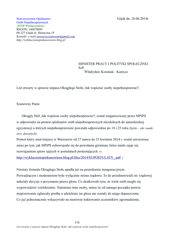 Gójsk dn. 26.06.2014r Stowarzyszenie Opiekunów Osób Niepełnosprawnych ;STOP Wykluczeniom; REGON: 146878689 09-227 Gójsk ul. Słoneczna 19 Kontakt: e-mail [email protected] http://wykluczeniopiekunowieon.blog.pl MINISTER PRACY I POLITYKI SPOŁECZNEJ SzP. Władysław Kosiniak - Kamysz List otwarty w sprawie impasu Okrągłego Stołu ;Jak wspierać osoby niepełnosprawne?; Szanowny Panie Okrągły Stół ;Jak wspierać osoby niepełnosprawne?; został zorganizowany przez MPiPS w odpowiedzi na protest opiekunów osób niepełnosprawnych niezdolnych do samodzielnej egzystencji u których niepełnosprawność powstała odpowiednio po 18 i 25 roku życia – okr. nauki (tzw. dorosłych) Protest który miał miejsce w Warszawie od 27 marca do 25 kwietnia 2014 r. został zawieszony zaraz po tym, jak MPiPS zobowiązało się do powołania gremium, które miało zająć się rozwiązaniem spraw ujętych w postulatach protestujących. (v. http://wykluczeniopiekunowieon.blog.pl/files/2014/03/POSTULATY_.pdf ) Niestety formuła Okrągłego Stołu upadła już na posiedzeniu inauguracyjnym. Prowadzącym i moderatorem była wyłącznie strona rządowa. To do przedstawicieli str. rządowej należały decyzje o przyznaniu prawa głosu. Co skutkowało tym, że wiele osób mogło się wypowiedzieć wielokrotnie. Natomiast inne osoby, mimo że od samego początku prawie nieprzerwanie zgłaszały prośbę o udzielenie im głosu nie zostały do niego dopuszczone. Co już jednoznacznie wskazywało na nierówne traktowanie uczestników zgromadzenia. 1/6 List otwarty w sprawie impasu Okrągłego Stołu ;Jak wspierać osoby niepełnosprawne?; Kolejnym przejawem dyktatu jednej strony spotkania było pośpieszne / wręcz arbitralne powołanie przez str. rządową pięciu zespołów tematycznych. Zaraz po powołaniu zespołów ogłoszono przerwę. Dziwnym 'zbiegiem okoliczności' na stole prezydialnym leżały już …. formularze z nazwami zespołów na których zebrani mogli wpisywać swoje dane, aby w nich uczestniczyć. Po przerwie str. rządowa, w żaden sposób nie chciała już rozmawiać o formie powołanych wcześniej zespołów. Powyższe jednoznacznie potwierdza, że zgromadzeni nie mieli faktycznego wpływu na kształt powołanych zespołów. Wielu uczestników spotkania odczytało to jako manipulację. Brak demokratycznej formuły Okrągłego Stołu dopełnia fakt, że jedynym moderatorem posiedzeń Zespołów są przedst. str. rządowej. Dyskusje są tak moderowane/manipulowane, aby przekonać zebranych iż wprowadzenie prywatnego projektu sen. Augustyna (PO) jest jedynym, nieuchronnym najlepszym rozwiązaniem. Przy czym strona rządowa nie przedstawia żadnych wyliczeń związanych z kosztami wprowadzenia w życie tegoż projektu popieranego jedynie przez nią i prywatne 'biznesy opiekuńcze' Ponadto posiedzenia zespołów zorganizowano tak, aby w w czasie ustalania postulatów jak najwięcej osób nie mogło w nich uczestniczyć. Rozpoczynały się o godz.10 w dużej odl. od centrum. Tak aby uczestnicy pochodzący z odleglejszych miejscowości nie mogli na nie zdążyć. No chyba że by wyjechali w godzinach wieczornych poprzedniego dnia co skutkowało by ich ogólnym zmęczeniem . A co za tym idzie zmniejszoną sprawnością intelektualną. Forma prac zespołów jest taka, że nie można się zorientować co w danym okresie wypracował dany zespół. Nie prowadzi się żadnego rodzaju sprawozdawczości z posiedzeń Zespołów. Utrudnia to zorientowanie się do jakich wniosków wspólnych doszły str. spotkania. Brak faktów, konkretów, wyliczeń, dat wdrożeń podjętych uzgodnień. W tej sytuacji str rządowa może zakończyć prace Okr. Stołu dowolnymi ustaleniami i w zupełnie subiektywny/uznaniowy sposób oświadczyć, że spełnia oczekiwania społeczne. Nikt nie będzie w stanie tego skontrolować i powiedzieć że strona rządowa mija się z prawdą, ponieważ nie będzie żadnych materialnych dowodów na to, co tak właściwie ustalono . Na tym poziomie ogólnikowości na jakim jest prowadzona debata nie daje się wyprowadzić jakiegokolwiek konkretu. Nie da się też połączyć elementów/rozwiązań które mogły by utworzyć system, gdyby zostały wypracowane na innych płaszczyznach w innych zespołach . Na spotkania nie przychodzą przedst. min. finansów. Wskutek czego na wiele pytań brak odpowiedzi, w związku z czym nie można się zorientować co do skutków finansowych przedstawianych postulatów . Wielu uczestników Okrągłego Stołu ma odczucie że jest lekceważona (v. http://www.radiomaryja.pl/informacje/rodzice2/6 List otwarty w sprawie impasu Okrągłego Stołu ;Jak wspierać osoby niepełnosprawne?; dzieci-niepelnosprawnych-wznowia-protest/ oraz: http://w986.wrzuta.pl/audio/aoEsLTNCPeF/o_okraglym_stole_ws._osob_niepelnosprawnych_opow iada_dr_pawel_kubicki_ze_szkoly_glownej_handlowej oraz: https://www.facebook.com/permalink.php?story_fbid=1394282940859042&id=100008320473678) Takie zachowania str. rządowej bezsprzecznie wskazują że MPiPS przy Okrągłym Stole kieruje się wyłącznie kryteriami politycznymi a nie ekonomicznymi. W chwili obecnej przy Okrągłym Stole debatują praktycznie dwie z czterech grup uczestników, tj. str. rządowa i sen. Mieczysław Augustyn wraz z przedstawicielami prywatnego biznesu opiekuńczego z p. Elżbietą Szwałkiewicz na czele. [v. http://www.faktypilskie.pl/index.php? option=com_content&view=article&id=7779:pudrowanieyciorysu&catid=54:felietony&Itemid=95%20Mariusz%20Szalbierz%20-%20Fakty%20Pilskie lub( http://www.dzienniknowy.pl/fora/temat/706.dhtml ) oraz: http://nipip.pl/index.php/uchwaly/naczelnych-rad/w-roku-2013/stanowiska2013/1960-stanowisko12-2013 ] (W posiedzeniach biorą udział również różne osoby niezrzeszone – prywatne, które reprezentują jedynie siebie) Znakomita większość organizacji które wzięły udział w inauguracji Okr. Stołu nie bierze udziału w posiedzeniach Zespołów (z wył. stow. ;Mam Przysz