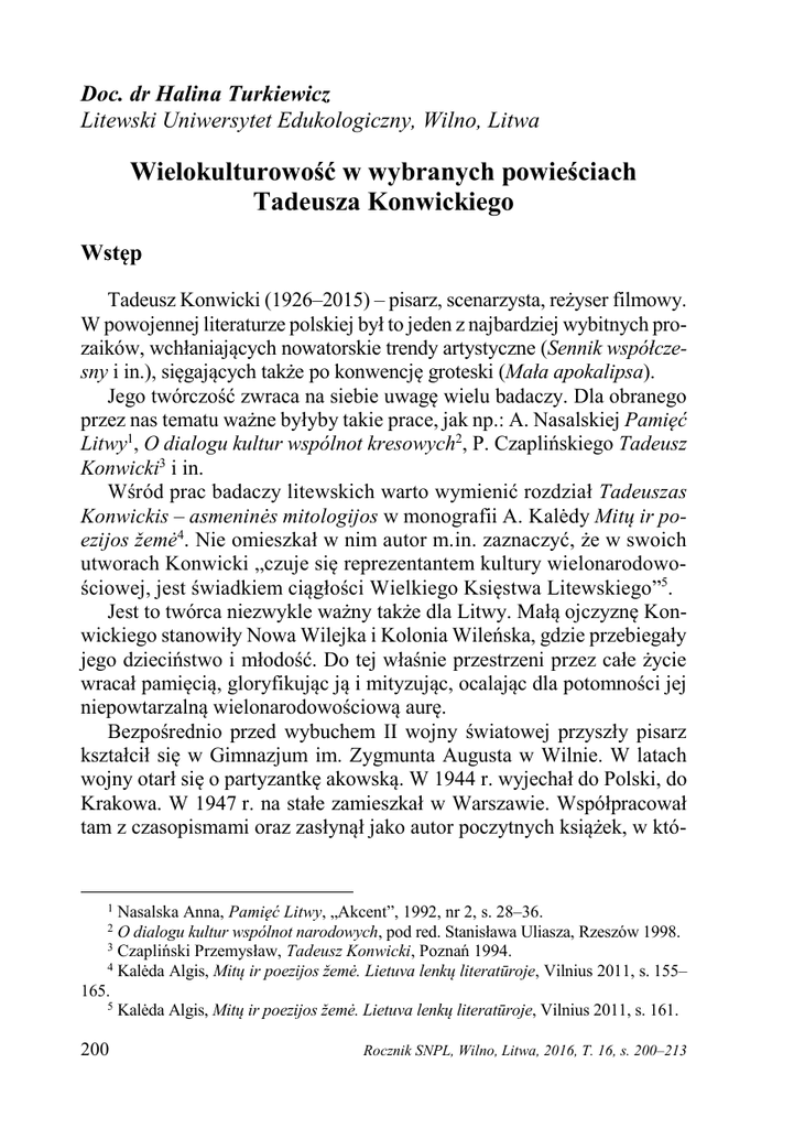 Doc. dr Halina Turkiewicz Litewski Uniwersytet Edukologiczny, Wilno, Litwa Wielokulturowość w wybranych powieściach Tadeusza Konwickiego Wstęp Tadeusz Konwicki (1926–2015) – pisarz, scenarzysta, reżyser filmowy. W powojennej literaturze polskiej był to jeden z najbardziej wybitnych prozaików, wchłaniających nowatorskie trendy artystyczne (Sennik współczesny i in.), sięgających także po konwencję groteski (Mała apokalipsa). Jego twórczość zwraca na siebie uwagę wielu badaczy. Dla obranego przez nas tematu ważne byłyby takie prace, jak np.: A. Nasalskiej Pamięć Litwy1, O dialogu kultur wspólnot kresowych2, P. Czaplińskiego Tadeusz Konwicki3 i in. Wśród prac badaczy litewskich warto wymienić rozdział Tadeuszas Konwickis – asmeninės mitologijos w monografii A. Kalėdy Mitų ir poezijos žemė4. Nie omieszkał w nim autor m.in. zaznaczyć, że w swoich utworach Konwicki „czuje się reprezentantem kultury wielonarodowościowej, jest świadkiem ciągłości Wielkiego Księstwa Litewskiego”5. Jest to twórca niezwykle ważny także dla Litwy. Małą ojczyznę Konwickiego stanowiły Nowa Wilejka i Kolonia Wileńska, gdzie przebiegały jego dzieciństwo i młodość. Do tej właśnie przestrzeni przez całe życie wracał pamięcią, gloryfikując ją i mityzując, ocalając dla potomności jej niepowtarzalną wielonarodowościową aurę. Bezpośrednio przed wybuchem II wojny światowej przyszły pisarz kształcił się w Gimnazjum im. Zygmunta Augusta w Wilnie. W latach wojny otarł się o partyzantkę akowską. W 1944 r. wyjechał do Polski, do Krakowa. W 1947 r. na stałe zamieszkał w Warszawie. Współpracował tam z czasopismami oraz zasłynął jako autor poczytnych książek, w któ- Nasalska Anna, Pamięć Litwy, „Akcent”, 1992, nr 2, s. 28–36. O dialogu kultur wspólnot narodowych, pod red. Stanisława Uliasza, Rzeszów 1998. 3 Czapliński Przemysław, Tadeusz Konwicki, Poznań 1994. 4 Kalėda Algis, Mitų ir poezijos žemė. Lietuva lenkų literatūroje, Vilnius 2011, s. 155– 165. 5 Kalėda Algis, Mitų ir poezijos žemė. Lietuva lenkų literatūroje, Vilnius 2011, s. 161. 1 2 200 Rocznik SNPL, Wilno, Litwa, 2016, T. 16, s. 200–213 Rocznik Stowarzyszenia Naukowców Polaków Litwy, T. 16 rych stale przewijała się tematyka litewsko-wileńska. Wystarczy wymienić takie powieści, jak: Rojsty, Dziura w niebie, Kronika wypadków miłosnych, Bohiń. Elementy krajobrazowe okolic Kolonii Wileńskiej stały się nieodłączną pożywką, niemal obsesją jego twórczości. Dolina dzieciństwa, rzeki Wilia i Wilenka, las, tory kolejowe – to obrazy upiększające niejeden utwór pisarza. Podobnie jak Czesław Miłosz, Konwicki także w swojej eseistyce (Kalendarz i klepsydra, Wschody i zachody księżyca, Nowy Świat i okolice) apoteozował Wileńszczyznę, jej krajobrazy, ludzi, zwłaszcza przedwojenne obrzędy i obyczaje. Podobnie postępował jako scenarzysta i reżyser filmowy. Nieprzypadkowo wziął na warsztat m.in. Mickiewiczowskie Dziady (film Lawa) oraz Dolinę Issy Cz. Miłosza. Ze względu na stałe, wręcz „maniakalne”, powroty do kraju lat dziecinnych, proza Tadeusza Konwickiego jest umieszczana w tzw. nurcie kresowym literatury polskiej bądź w nurcie literatury pogranicza, zgodnie z terminem zaproponowanym przez T. Bujnickiego6. Najbardziej neutralne określenie stanowi jednakże literatura „małych ojczyzn”. W prozie polskiej 2. połowy XX w. Konwicki współtworzył ten nurt, plasując się obok takich pisarzy, jak, najbliższy mu, bez wątpienia, Czesław Miłosz, ale także Józef Mackiewicz, Zbigniew Żakiewicz, Julian Stryjkowski, Andrzej Kuśniewicz, Włodzimierz Odojewski, Stanisław Vincenz i in. Znane są ich sentymentalne powroty „na ojczyzny łono”, intensywne odtwarzanie zapamiętanych realiów z dzieciństwa i młodości, tęsknota do przekazywanych przez przodków wartości itp. Proza Konwickiego jest też niezwykle istotna jako zwierciadło przemian w literaturze, zwłaszcza po r. 1956. Dzisiaj, kiedy próbuje się scalać literaturę PRL-u (1944–1989), cezura r. 1956, czyli tzw. „wypadków czerwcowych”, staje się jakby mniej ostra, jednakże w dorobku niejednego pisarza minionej epoki zaznaczyła się ona bardzo wyraźnie, czego świadectwem jest także twórczość autora Rojstów. Pierwsze utwory Konwickiego, jak wiadomo, noszą na sobie piętno poetyki („metody”, jak się wówczas mówiło) realizmu socjalistycznego. „Prawdziwy” Konwicki zaistnieje dopiero w momencie ukazania się powieści Dziura w niebie (1959), przenoszącej „duszę utęsknioną / Do tych 6 Bujnicki Tadeusz, Wilno międzywojenne – kresowe? regionalne? pograniczne?, „Pogranicza, Kresy, Wschód a idee Europy”, pod red. Anny Janickiej, Grzegorza Kowalskiego, Łukasza Zabielskiego, Białystok 2013, s. 424–426. 201 Artykuły naukowe pagórków leśnych, do tych łąk zielonych, / Szeroko (i tu poprawka) nad błękitną Wilią rozciągnionych”. Dziura w niebie otwiera najistotniejszy bodaj cykl tematyczny w dorobku pisarza, który on sam scharakteryzował jako „rekreacyjno-smętkowy, pisany dla przyjemności czytelnika i własnej w złych okresach życia” (Nowicki, 1986, 120). Składają się nań głównie te powieści, w których twórca, w taki czy inny sposób, wraca pamięcią na Wileńszczyznę, jest to przywoływana już Dziura w niebie, a także Zwierzoczłekoupiór (1969), Kronika wypadków miłosnych (1974), Bohiń (1987) i in. Powroty na Wileńszczyznę, konkretnie do Nowej Wilejki, gdzie się urodził, czy do Kolonii Wileńskiej, gdzie przebiegało jego dzieciństwo, stanowią „rekreację” nie tylko dlatego, że wpada się tutaj w „Niagarę zieleni”, według określenia samego pisarza. Są one również odtrutką na szarzyznę rzeczywistości PRL-u, na niesamowitą unifikację wszystkiego i wszystkich. Celem niniejszego artykułu jest przybliżenie obrazu wielokulturowości „małe
