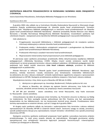 1 WSPÓŁPRACA BIBLIOTEK PEDAGOGICZNYCH W ROZWIJANIU SŁOWNIKA HASEŁ ZWIĄZANYCH Z EDUKACJĄ Iwona Gawrońska-Paluszkiewicz, Dolnośląska Biblioteka Pedagogiczna we Wrocławiu Opublikowano 08.01.2005 8 grudnia 2004 roku odbyło się w Centralnym Ośrodku Doskonalenia Nauczycieli w Warszawie drugie spotkanie Zespołu problemowo-zadaniowego ds. słownika języka haseł przedmiotowych. Tematem spotkania była "Współpraca bibliotek pedagogicznych w tworzeniu haseł przedmiotowych do Słownika języka haseł przedmiotowych Biblioteki Narodowej". Szkolenie prowadziły Wanda Klenczon oraz Aldona Borowska z Ośrodka Normalizacji Bibliograficznej Biblioteki Narodowej. Uczestnikami spotkania byli członkowie Zespołu - wytypowani przez dyrektorów bibliotek pedagogicznych nauczyciele bibliotekarze. Cele szkolenia to : 1. Przygotowanie nauczycieli bibliotekarzy z bibliotek pedagogicznych do rozwijania systemu informacji edukacyjnej w zakresie słownika haseł przedmiotowych. 2. Przekazanie wiedzy i doskonalenie umiejętności związanych z posługiwaniem się Słownikiem języka haseł przedmiotowych Biblioteki Narodowej. 3. Przekazanie informacji o zasadach tworzenia haseł przedmiotowych. 4. Wypracowanie metod analizy haseł proponowanych przez biblioteki pedagogiczne. W pierwszej części spotkania prowadzące przedstawiły efekty dotychczasowej współpracy bibliotek pedagogicznych z Biblioteką Narodową i CODN. Między innymi zostały omówione wyniki badań ankietowych na temat propozycji terminów z obszaru edukacji nadesłane z 44 bibliotek pedagogicznych. Na podstawie tych badań zastała stworzona Lista haseł z obszaru edukacja, przesłana do bibliotek pedagogicznych w październiku. Wanda Klenczon w referacie "Słownik języka haseł przedmiotowych Biblioteki Narodowej: jego struktury, metody tworzenia i zasady stosowania przy tematowaniu materiałów bibliotecznych (w odniesieniu do Listy z obszaru edukacji)" omówiła najistotniejsze zagadnienia związane z opracowaniem przedmiotowym w JHP BN. Następnie przedstawiono problemy związane z listą haseł z obszaru edukacji. Wyodrębniono terminy z listy, które są już w Słowniku JHP BN (ok.15-202): 1. identyczne ze zgłoszonymi np. Anoreksja, Bezdomność, Polityka społeczna itd. oraz 2. obecne w Słowniku, ale różniące się zapisem (termin odrzucony, inna liczba lub szyk wyrazów, określnik zamiast tematu), np. propozycja: Awans zawodowy nauczycieli. W JHP BN jest określnik - awans zawodowy oraz temat Nauczyciele, więc hasło wzorcowe to: Nauczyciele - awans zawodowy. Ustosunkowano się także do propozycji zmian tematów, np. Poronienie sztuczne na Aborcja czy Nałóg na Uzależnienie. Na liście wystąpiły tematy jednostkowe (ok. 52). Powinny one być wprowadzane bezpośrednio do baz bibliotecznych, nie ma konieczności kontroli przez słownik. Przedstawiono także terminy wprowadzone w ostatnim okresie, czyli od 1 lutego do 4 grudnia 2004 r. W drugiej części spotkania odbyły się ćwiczenia z wykorzystaniem listy terminów z zakresu edukacji wprowadzonych do Słownika JHP BN w ostatnich dwóch latach. Zwrócono uwagę na zasady, procedury, sposób podejmowania decyzji przy wprowadzaniu nowych tematów i określników oraz sposób prezentacji słownictwa JHP BN. Następnie uczestnicy spotkania analizowali propozycje haseł zgodnie z procedurą tworzenia artykułu przedmiotowego. Ta część pracy zespołu okazała się najtrudniejsza. Wymagała gruntownej wiedzy specjalistycznej oraz umiejętności tworzenia logicznych powiązań hierarchicznych i równorzędnych z hasłami już istniejącymi w Słowniku. 2 Na koniec ustalono zasady dalszej współpracy zespołu. Uzgodniono, że do uczestników spotkania trafi na początku 2005 roku lista z proponowanymi przez biblioteki pedagogiczne hasłami. Członkowie Zespołu będą analizować je w swoich placówkach pod kątem wprowadzenia do Słownika, tworząc odpowiednie artykuły przedmiotowe. W pierwszej kolejności należy rozpatrzyć terminy dotyczące matury oraz kształcenia, edukacji, nauczania itp. Efekty pracy powinny być przesyłane do Biblioteki Narodowej lub przedstawione na planowanym na marzec kolejnym spotkaniu. Uczestnicy spotkania przyjęli z zadowoleniem deklaracje pracowników Pracowni Informacji Pedagogicznej CODN oraz Biblioteki Narodowej, iż mimo trudności finansowych prace zespołu będą kontynuowane.