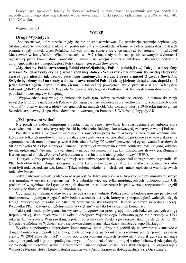 Fascynująca opowieść Joanny Wieliczka-Szarkowej o żołnierzach antykomunistycznego podziemia niepodległościowego, stawiających opór wobec sowietyzacji Polski i podporządkowania jej ZSRR w latach 40. i 50. XX wieku. fragment książki: WSTĘP Droga Wyklętych „Społeczeństwo, które strzela, nigdy się nie da zbolszewizować. Bolszewizacja zapanuje dopiero, gdy ostatni żołnierze wychodzą z ukrycia i posłusznie stają w ogonkach. Właśnie w Polsce gasną dziś po lasach ostatnie strzały prawdziwych Polaków, których nikt na świecie nie chce nazywać bohaterami” - pisał Józef Mackiewicz w londyńskich „Wiadomościach” w 1947 roku, kiedy w Polsce, po sfałszowanych wyborach i ogłoszonej przez komunistów „amnestii”, ujawniali się kolejni żołnierze antykomunistycznego podziemia zbrojnego, walczący o niepodległość Polski zagarniętej przez Sowietów. „My chcemy Polski suwerennej, Polski chrześcijańskiej, Polski - polskiej! (…) Tak jak walczyliśmy w lasach Wileńszczyzny czy na gruzach kochanej stolicy - Warszawy - z Niemcami, by świętej Ojczyźnie zerwać pęta niewoli, tak dziś do ostatniego legniemy, by wyrzucić precz z naszej Ojczyzny Sowietów. Święcie będziemy stać na straży wolności i suwerenności Polski i nie wyjdziemy dotąd z lasu, dopóki choć jeden Sowiet będzie deptał Polską Ziemię” - tak cel tej powojennej walki przedstawiał kpt. Władysław Łukasiuk „Młot”, dowódca 6. Brygady Wileńskiej AK, legenda Podlasia. Tak też myśleli inni dowódcy i ich podwładni pozostający w konspiracji. „Wypowiedzieliśmy walkę na śmierć lub życie tym, którzy za pieniądze, ordery lub stanowiska z rąk sowieckich mordują najlepszych Polaków domagających się wolności i sprawiedliwości. (…) Sumienie Narodu - to my!” - pisał w jednej z ulotek rozlepianych na murach Gdańska wczesną wiosną 1946 roku mjr Zygmunt Szendzielarz, sławny „Łupaszko”, dowódca odtworzonej na Pomorzu 5. Wileńskiej Brygady AK. „Żyli prawem wilka” Nie poszli na żaden kompromis i zapłacili za to cenę najwyższą. Ich rozstrzelane i pohańbione ciała wystawiano na ulicach, aby krzyczały, że taki będzie koniec każdego, kto odważy się zamarzyć o wolnej Polsce. Po latach walki z okupantem niemieckim i sowieckim przyszło im walczyć z rodzimymi komunistami, którzy nie tylko ich mordowali i torturowali, ale uczynili wszystko, aby zhańbić po śmierci i w końcu skazać na zapomnienie. Jak mówi bohater powieści Sebastiana Reńcy "Z cienia", poświęconej zgrupowaniu Narodowych Sił Zbrojnych (NSZ) kpt. Henryka Flamego „Bartka”, ci wszyscy niezłomni żołnierze, byli „ścigani, odstrzeliwani, opluwani..”. Nie mieli prawa istnieć w narodowej pamięci. Przez komunistów zostali wyklęci. Zbigniew Herbert napisał o nich: „Ponieważ żyli prawem wilka/ historia o nich głucho milczy” (Wilki). Dla tych, którzy przeżyli, nie było miejsca na uniwersytetach, nie wyjeżdżali na zagraniczne stypendia. W PRL byli obywatelami drugiej kategorii. Zemsta komunistów dosięgła także ich bliskich - rodzin. Prześladowani byli rodzice, rodzeństwo, krewni. Także kolejne pokolenie - ich dzieci - miały zapłacić za wierność swych rodziców Polsce. Jeden z ubeków mówił: „zadaniem naszym jest nie tylko zniszczyć was fizycznie, ale my musimy zniszczyć was moralnie w oczach społeczeństwa”. Nie zabrakło więc nie tylko mordujących ich funkcjonariuszy UB, prokuratorów, sędziów, ale i tych co zabijali słowem - pisali oszczercze książki, wiersze, reżyserowali i kręcili tendencyjne filmy, rzeźbili pomniki zbrodniarzy. Gdy upadł komunizm, wydawało się, że odzyskująca wolność Polska zacznie budowę nowego państwa od fundamentów, a jednym z jego filarów będzie szacunek dla tych, którzy o tę niepodległość walczyli, tak jak Druga Rzeczypospolita zadbała o ostatnich powstańców styczniowych. Historia potoczyła się jednak inaczej. Po upadku PRL nazwano ich „Żołnierzami Wyklętymi” - na taki los skazali ich komuniści. Taki tytuł nosiła poświęcona im wystawa, przygotowana przez grupę młodych ludzi związanych z Ligą Republikańską, skupionych wokół adwokata Grzegorza Wąsowskiego. Pokazano ją po raz pierwszy w 1993 roku na Uniwersytecie Warszawskim, a potem objechała całą Polskę i po sześciu latach trafiła do Sejmu RP. Określenie „Żołnierze Wyklęci” stało się powszechniej znane także dzięki książce Jerzego Ślaskiego. Wysiłek niepokornych historyków, kombatantów, ludzi którzy nie godzili się na trwanie w kłamstwie o drugiej konspiracji niepodległościowej, czyli powojennej partyzantce antykomunistycznej, powoli przynosi efekty. W 2001 roku Sejm RP - mimo oporu postkomunistycznych środowisk - przyjął uchwałę uznającą zasługi „organizacji i grup niepodległościowych, które po zakończeniu drugiej wojny światowej zdecydowały się na podjęcie nierównej walki o suwerenność i niepodległość Polski” oraz stwierdzającą, iż „organizacja Wolność i Niezawisłość’, kontynuatorka tradycji walk Armii Krajowej, dobrze zasłużyła się Ojczyźnie”. Z czasem poszerzał się krąg historyków zafascynowanych historią „Wyklętych”. Kolejne tomy Oficyny Wydawniczej Volumen - wśród nich album Żołnierze wyklęci. Antykomunistyczne podziemie zbrojne po 1944 roku, publikacje i pomniki Fundacji „Pamiętamy”, uwieczniające bohaterów antysowieckiego powstania z lat 1944-1956, czy skierowany głównie do młodzieży projekt Twardzi jak stal (muzyczny hołd Narodowym Siłom Zbrojnym), płyta zespołu „De Press” Myśmy rebelianci. Piosenki żołnierzy wyklętych, a także coroczne rajdy szlakami „Zapory”, „Łupaszki”, „Bartka”, „Żubryda” - powoli przywracają „Wyklętych” narodowej pamięci. Niewątpliwie szczególną rolę odegrała tu działalność Instytutu Pamięci Narodowej pod kierownictwem śp