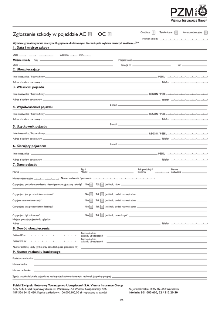 Zgłoszenie szkody w pojeździe AC Osobiste OC Wypełnić granatowym lub czarnym długopisem, drukowanymi literami, pola wyboru oznaczyć znakiem „“ Telefoniczne Korespondencyjne Numer szkody 1. Data i miejsce szkody Godzina Data Miejsce szkody min. Kraj Miejscowość Ulica Droga nr km 2. Ubezpieczający Imię i nazwisko / Nazwa firmy PESEL Adres z kodem pocztowym Telefon 3. Właściciel pojazdu Imię i nazwisko / Nazwa firmy REGON / PESEL Adres z kodem pocztowym Telefon E-mail 4. Współwłaściciel pojazdu Imię i nazwisko / Nazwa firmy REGON / PESEL Adres z kodem pocztowym Telefon E-mail 5. Użytkownik pojazdu Imię i nazwisko / Nazwa firmy REGON / PESEL Adres z kodem pocztowym Telefon E-mail 6. Kierujący pojazdem Imię i nazwisko PESEL Adres z kodem pocztowym Telefon 7. Dane pojazdu Numer rejestracyjny Rok produkcji / złożenia Typ / Model Marka Barwa nadwozia Numer nadwozia / podwozia Czy pojazd posiada uszkodzenia niezwiązane ze zgłaszaną szkodą? Nie Tak Jeśli tak, jakie Czy pojazd jest przedmiotem zastawu? Nie Tak Jeśli tak, podać nazwę i adres Czy jest ustanowiona cesja? Nie Tak Jeśli tak, podać nazwę i adres Czy pojazd jest przedmiotem leasingu? Nie Tak Jeśli tak, podać nazwę i adres Czy pojazd był holowany? Nie Tak Jeśli tak, przez kogo? Miejsce postoju pojazdu do oględzin Adres Telefon 8. Dowód ubezpieczenia Polisa AC nr Polisa OC nr Nazwa i adres zakładu ubezpieczeń Nazwa i adres zakładu ubezpieczeń Numer zielonej karty (tylko przy szkodach poza granicami RP) 9. Numer rachunku bankowego Posiadacz rachunku Nazwa banku Numer rachunku Zgoda współwłaściciela pojazdu na wpłatę odszkodowania na w/w rachunek (czytelny podpis) Polski Związek Motorowy Towarzystwo Ubezpieczeń S.A. Vienna Insurance Group KRS 73432, Sąd Rejonowy dla m. st. Warszawy, XII Wydzia∏ Gospodarczy KRS, NIP 526 24 13 450, Kapita∏ zak∏adowy: 106.000.100,00 z∏ - op∏acony w ca∏ości 1/4 Al. Jerozolimskie 162A, 02-342 Warszawa Infolinia: 801 080 600, 22 / 212 20 50 10. Szczegółowy opis kolizji / wypadku Sytuacja na drodze, rodzaj i stan nawierzchni, warunki pogodowe, przyczyna kolizji / wypadku, prędkość pojazdów, zachowanie uczestników kolizji / wypadku, kto wezwał policję, kto udzielił pierwszej pomocy itp. Prędkość pojazdu osoby zgłaszającej szkodę Prędkość pojazdu drugiego uczestnika 11. Szkic sytuacyjny miejsca zdarzenia Dokładny szkic położenia pojazdów w chwili kolizji / wypadku z uwzględnieniem mających zastosowanie w miejscu zdarzenia, znaków drogowych (poziomych, pionowych, sygnalizacji świetlnej), wskazać ruch pojazdów w chwili zdarzenia (strzałkami). 12. Zakres uszkodzeń pojazdów Zgłaszającego szkodę Drugiego uczestnika Nr rejestracyjny Nr rejestracyjny Opis uszkodzeń Opis uszkodzeń 13. Szacowana / przewidywana wartość szkody zł 2/4 Poszkodowanego Sprawcy Dane dotyczące drugiego uczestnika kolizji / wypadku ( poszkodowanego sprawcy) 14. Właściciel pojazdu Imię i nazwisko / Nazwa firmy PESEL Adres z kodem pocztowym Telefon 15. Kierujący pojazdem Imię i nazwisko PESEL Adres z kodem pocztowym Telefon 16. Dane pojazdu Rok produkcji / złożenia Typ / Model Marka Barwa nadwozia Szacunkowa wysokość szkody w pojeździe Numer rejestracyjny 17. Dowód ubezpieczenia Nazwa i adres zakładu ubezpieczeń Polisa OC nr Numer zielonej karty (tylko przy szkodach poza granicami RP lub z udziałem obcokrajowca) Czy są szkody rzeczowe poza pojazdami? Czy są osoby ranne? Nie Tak Nie Tak Jeżeli tak, proszę podać jakie Jeżeli tak, proszę podać nazwisko i adres Powiadomienie Policji / świadkowie Czy wypadek zgłoszono Policji? Nie Tak Nazwa i adres jednostki Policji 18. Dane świadka 1 Telefon Imię i nazwisko Adres z kodem pocztowym 19. Dane świadka 2 Telefon Imię i nazwisko Adres z kodem pocztowym Dane dotyczące kolejnych uczestników kolizji / wypadku 20. Właściciel pojazdu Imię i nazwisko / Nazwa firmy PESEL Adres z kodem pocztowym Telefon 21. Kierujący pojazdem Imię i nazwisko PESEL Adres z kodem pocztowym Telefon 22. Dane pojazdu Marka Numer rejestracyjny Rok produkcji / złożenia Typ / Model Szacunkowa wysokość szkody w pojeździe 3/4 Barwa nadwozia Oświadczenia 23. Oświadczenie właściciela pojazdu, którego dotyczy zgłaszana szkoda Ja niżej podpisany, oświadczam, że: 1. Pojazd został użyty w dniu zdarzenia za moją zgodą i wiedzą 2. szkodę z dnia zgłosiłem / bez mojej zgody i wiedzy / nie zgłosiłem u innego ubezpieczyciela do likwidacji z umowy ubezpieczenia AC , OC , nazwa ubezpieczyciela 3. Za szkodę z dnia 4. Jestem / nie jestem otrzymałem / nie otrzymałem odszkodowanie/a. Wysokość odszkodowania zł podatnikiem podatku VAT. 5. Po zakupie pojazdu dokonałem/łam / nie dokonałem/łam odliczenia podatku VAT naliczonego przy jego zakupie w wysokośći 22% 50% 60% Nie 6. Pojazd został wciągnięty do ewidencji środków trwałych firmy Tak 7. Gdyby dochodzenie prowadzone przez uprawnione organa ujawniło okoliczności wyłączające odpowiedzialność Polski Związek Motorowy Towarzystwo Ubezpieczeń S.A. Vienna Insurance Group za szkodę z dnia lub wypłacone odszkodowanie przewyższało rozmiar szkody objęty ubezpieczeniem, zobowiązuję się zwrócić Polski Związek Motorowy Towarzystwo Ubezpieczeń S.A. Vienna Insurance Group. wypłacone odszkodowanie odpowiednio w całości lub w części. 24. Oświadczenie kierującego Oświadczam, że w chwili wypadku nie znajdowałem się / znajdowałem się pod wpływem narkotyków, alkoholu lub innych środków odurzających data Własnoręczność podpisu stwierdzam na podstawie dokumentu Numer podpis Zgodnie z art.23 ust.1 ustawy z dnia 29 sierpnia 1997 r. o ochronie danych osobowych (Dz. U. z 2002 r. Nr 101 poz. 926 z późn. zm.) wyrażam zgodę na przekazywanie przez Towarzystwo moich danych osobowych, takich jak imiona, nazwisko, data urodzenia, adres zamieszkania, adres do korespondencji i numer telefonu innym podmiotom prawa polski